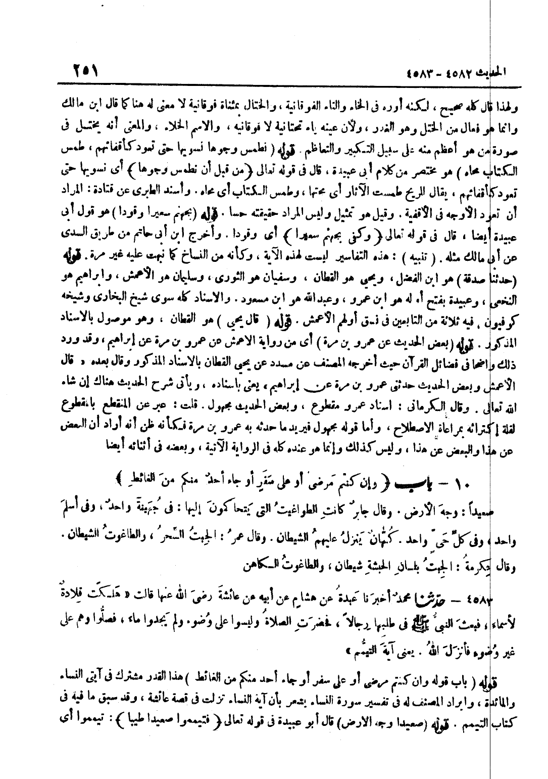 [4582] قَوْله حَدثنَا صَدَقَة هُوَ بن الْفَضْلِ وَيَحْيَى هُوَ الْقَطَّانُ وَسُفْيَانُ هُوَ الثَّوْرِيُّ وَسُلَيْمَانُ هُوَ الْأَعْمَشُ وَإِبْرَاهِيمُ هُوَ النَّخَعِيُّ وَعَبِيدَةُ بِفَتْحِ أَوَّلِهِ هُوَ بن عَمْرو وَعبد الله هُوَ بْنُ مَسْعُودٍ وَالْإِسْنَادُ كُلُّهُ سِوَى شَيْخِ الْبُخَارِيِّ وَشَيْخِهِ كُوفِيُّونَ فِيهِ ثَلَاثَةٌ مِنَ التَّابِعِينَ فِي نَسَقٍ أَوَّلُهُمُ الْأَعْمَشُ قَوْله قَالَ يحيي هوالقطان وَهُوَ مَوْصُولٌ بِالْإِسْنَادِ الْمَذْكُورِ قَوْلُهُ بَعْضُ الْحَدِيثِ عَنْ عَمْرِو بْنِ مُرَّةٍ أَيْ مِنْ رِوَايَةِ الْأَعْمَشِ عَنْ عَمْرِو بْنِ مُرَّةَ عَنْ إِبْرَاهِيمَ وَقَدْ وَرَدَ ذَلِكَ وَاضِحًا فِي فَضَائِلِ الْقُرْآنِ حَيْثُ أَخْرَجَهُ الْمُصَنِّفُ عَنْ مُسَدَّدٍ عَنْ يَحْيَى الْقَطَّانِ بِالْإِسْنَادِ الْمَذْكُورِ وَقَالَ بَعْدَهُ قَالَ الْأَعْمَشُ وَبَعْضُ الْحَدِيثِ حَدَّثَنِي عَمْرُو بْنُ مُرَّةَ عَنْ إِبْرَاهِيمَ يَعْنِي بِإِسْنَادِهِ وَيَأْتِي شَرْحُ الْحَدِيثِ هُنَاكَ إِنْ شَاءَ اللَّهُ تَعَالَى وَقَالَ الْكَرْمَانِيُّ إِسْنَادُ عَمْرٍو مَقْطُوعٌ وَبَعْضُ الْحَدِيثِ مَجْهُولٌ قُلْتُ عَبَّرَ عَنِ الْمُنْقَطِعِ بِالْمَقْطُوعِ لِقِلَّةِ اكْتِرَاثِهِ بِمُرَاعَاةِ الِاصْطِلَاحِ وَأما قَوْله مَجْهُول فيريد مَا حَدَّثَهُ بِهِ عَمْرُو بْنُ مُرَّةَ فَكَأَنَّهُ ظَنَّ أَنَّهُ أَرَادَ أَنَّ الْبَعْضَ عَنْ هَذَا وَالْبَعْضَ عَنْ هَذَا وَلَيْسَ كَذَلِكَ وَإِنَّمَا هُوَ عِنْدَهُ كُلُّهُ فِي الرِّوَايَةِ الْآتِيَةِ وَبَعْضُهُ فِي أَثْنَائِهِ أَيْضا
