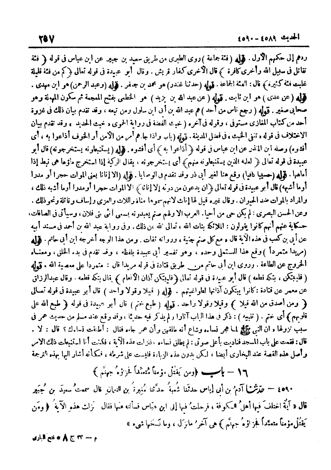 [4589] حَدَّثَنَا غُنْدَرٌ هُوَ مُحَمَّدُ بْنُ جَعْفَرٍ قَوْلُهُ وَعَبْدُ الرَّحْمَنِ هُوَ بن مهْدي قَوْله عَن عدى هُوَ بن ثَابِتٍ قَوْلُهُ عَنْ عَبْدُ اللَّهِ بْنُ يَزِيدَ هُوَ الْخَطْمِيُّ بِفَتْحِ الْمُعْجَمَةِ ثُمَّ سُكُونِ الْمُهْمَلَةِ وَهُوَ صَحَابِيٌّ صَغِيرٌ قَوْلُهُ رَجَعَ نَاسٌ مِنْ أحد هم عبد الله بن أبي بن سَلُولَ وَمَنْ تَبِعَهُ وَقَدْ تَقَدَّمَ بَيَانُ ذَلِكَ فِي غَزْوَةِ أُحُدٍ مِنْ كِتَابِ الْمَغَازِي مُسْتَوْفًى وَقَوْلُهُ فِي آخِرِهِ خَبَثَ الْفِضَّةِ فِي رِوَايَةِ الْحَمَوِيِّ خَبَثَ الْحَدِيدِ وَقَدْ تَقَدَّمَ بَيَانُ الِاخْتِلَافِ فِي قَوْلِهِ تَنْفِي الْخَبَثَ فِي فَضْلِ الْمَدِينَةِ قَوْلُهُ بَابُ وَإِذَا جَاءَهُمْ أَمْرٌ مِنَ الْأَمْنِ أَوِ الْخَوْفِ اذاعوا بِهِ أَي أفشوه وَصله بن الْمُنْذر عَن بن عَبَّاسٍ فِي قَوْلِهِ أَذَاعُوا بِهِ أَيْ أَفْشَوْهُ قَوْلُهُ يَسْتَنْبِطُونَهُ يَسْتَخْرِجُونَهُ قَالَ أَبُو عُبَيْدَةَ فِي قَوْلِهِ تَعَالَى لَعَلِمَهُ الَّذِينَ يَسْتَنْبِطُونَهُ مِنْهُمْ أَيْ يَسْتَخْرِجُونَهُ يُقَالُ لِلرَّكِيَّةِ إِذَا اسْتُخْرِجَ مَاؤُهَا هِيَ نَبَطٌ إِذَا أَمَاهَهَا قَوْلُهُ حَسِيبًا كَافِيًا وَقَعَ هُنَا لِغَيْرِ أَبِي ذَرٍّ وَقَدْ تَقَدَّمَ فِي الْوَصَايَا قَوْلُهُ إِلَّا إِنَاثًا يَعْنِي الْمَوَاتَ حَجَرًا أَوْ مَدَرًا أَوْ مَا أَشْبَهَهُ قَالَ أَبُو عُبَيْدَةَ فِي قَوْلِهِ تَعَالَى إِنْ يَدْعُونَ مِنْ دونه إِلَّا إِنَاثًا إِلَّا الْمَوَاتَ حَجَرًا أَوْ مَدَرًا أَوْ مَا أَشْبَهَ ذَلِكَ وَالْمُرَادُ بِالْمَوَاتِ ضِدُّ الْحَيَوَانِ وَقَالَ غَيْرُهُ قِيلَ لَهَا إِنَاثٌ لِأَنَّهُمْ سَمَّوْهَا مَنَاةَ وَاللَّاتَ وَالْعُزَّى وَإِسَافَ وَنَائِلَةَ وَنَحْوَ ذَلِكَ وَعَنِ الْحَسَنِ الْبَصْرِيِّ لَمْ يَكُنْ حَيٌّ مِنْ أَحْيَاءِ الْعَرَبِ إِلَّا وَلَهُمْ صَنَمٌ يَعْبُدُونَهُ يُسَمَّى أُنْثَى بَنِي فُلَانٍ وَسَيَأْتِي فِي الصَّافَّاتِ حِكَايَةٌ عَنْهُمْ أَنَّهُمْ كَانُوا يَقُولُونَ الْمَلَائِكَةُ بَنَاتُ اللَّهِ تَعَالَى اللَّهُ عَنْ ذَلِكَ وَفِي رِوَايَةِ عَبْدِ اللَّهِ بْنِ أَحْمَدَ فِي مُسْنَدِ أَبِيهِ عَنْ أُبَيِّ بْنِ كَعْبٍ فِي هَذِهِ الْآيَةِ قَالَ مَعَ كُلِّ صَنَمٍ جِنِّيَّةٌ وَرُوَاتُهُ ثِقَاتٌ وَمِنْ هَذَا الْوَجْه أخرجه بن أَبِي حَاتِمٍ قَوْلُهُ مَرِيدًا مُتَمَرِّدًا وَقَعَ هَذَا لِلْمُسْتَمْلِيِّ وَحْدَهُ وَهُوَ تَفْسِيرُ أَبِي عُبَيْدَةَ بِلَفْظِهِ وَقد تقدم فِي بَدْء الْخلق وَمَعْنَاهُ الْخُرُوج عَن الطَّاعَة وروى بن أَبِي حَاتِمٍ مِنْ طَرِيقِ قَتَادَةَ فِي قَوْلِهِ مَرِيدًا قَالَ مُتَمَرِّدًا عَلَى مَعْصِيَةِ اللَّهِ قَوْلُهُ فَلَيُبَتِّكُنَّ بَتَكَهُ قَطَعَهُ قَالَ أَبُو عُبَيْدَةَ فِي قَوْلِهِ تَعَالَى فليبتكن آذان الآنعام يُقَالُ بَتَّكَهُ قَطَّعَهُ وَقَالَ عَبْدُ الرَّزَّاقِ عَنْ مَعْمَرٍ عَنْ قَتَادَةَ كَانُوا يُبَتِّكُونَ آذَانَهَا لِطَوَاغِيتِهِمْ قَوْلُهُ قِيلَا وَقَوْلًا وَاحِدٌ قَالَ أَبُو عُبَيْدَةَ فِي قَوْلِهِ تَعَالَى وَمِنَ أَصْدَقُ مِنَ اللَّهِ قيلا وَقِيلًا وَقَوْلًا وَاحِدٌ قَوْلُهُ طَبَعَ خَتَمَ قَالَ أَبُو عُبَيْدَةَ فِي قَوْلِهِ طَبَعَ اللَّهُ عَلَى قُلُوبهم أَيْ خَتَمَ تَنْبِيهٌ ذَكَرَ فِي هَذَا الْبَابِ آثَارًا وَلَمْ يَذْكُرْ فِيهِ حَدِيثًا وَقَدْ وَقَعَ عِنْدَ مُسْلِمٍ مِنْ حَدِيثِ عُمَرَ فِي سَبَبِ نُزُولِهَا أَنَّ النَّبِيَّ صَلَّى اللَّهُ عَلَيْهِ وَسَلَّمَ لَمَّا هَجَرَ نِسَاءَهُ وَشَاعَ أَنَّهُ طَلَّقَهُنَّ وَأَنَّ عُمَرَ جَاءَهُ فَقَالَ أَطَلَّقْتَ نِسَاءَكَ قَالَ لَا قَالَ فَقُمْتُ عَلَى بَابِ الْمَسْجِدِ فَنَادَيْتُ بِأَعْلَى صَوْتِي لَمْ يُطَلِّقْ نِسَاءَهُ فَنَزَ