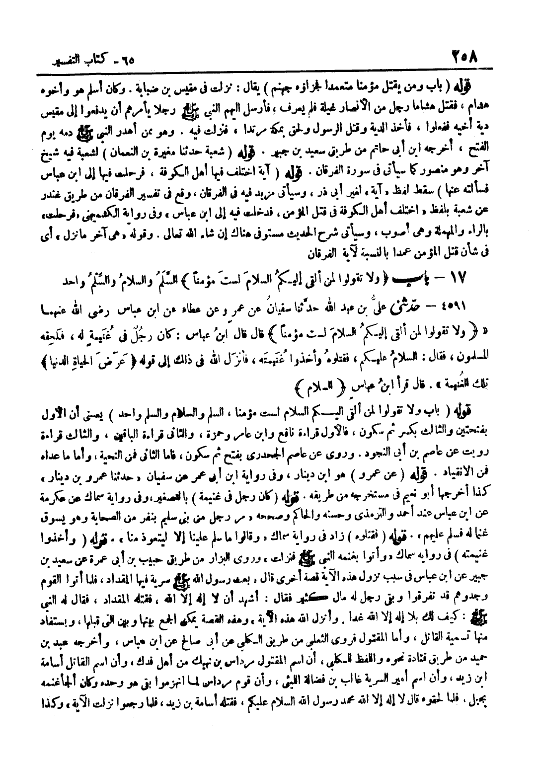 [4591] قَوْله عَن عَمْرو هُوَ بن دِينَار وَفِي رِوَايَة بن أَبِي عُمَرَ عَنْ سُفْيَانَ حَدَّثَنَا عَمْرُو بْنُ دِينَارٍ كَذَا أَخْرَجَهَا أَبُو نُعَيْمٍ فِي مُسْتَخْرَجِهِ مِنْ طَرِيقِهِ قَوْلُهُ كَانَ رَجُلٌ فِي غُنَيْمَةٍ بِالتَّصْغِيرِ وَفِي رِوَايَةِ سِمَاكٍ عَنْ عِكْرِمَةَ عَنِ بن عَبَّاسٍ عِنْدَ أَحْمَدَ وَالتِّرْمِذِيِّ وَحَسَّنَهُ وَالْحَاكِمِ وَصَحَّحَهُ مَرَّ رَجُلٌ مِنْ بَنِي سُلَيْمٍ بِنَفَرٍ مِنَ الصَّحَابَةِ وَهُوَ يَسُوقُ غَنَمًا لَهُ فَسَلَّمَ عَلَيْهِمْ قَوْلُهُ فَقَتَلُوهُ زَادَ فِي رِوَايَةِ سِمَاكٍ وَقَالُوا مَا سَلَّمَ عَلَيْنَا إِلَّا لِيَتَعَوَّذَ مِنَّا قَوْلُهُ وَأَخَذُوا غُنَيْمَتَهُ فِي رِوَايَةِ سِمَاكٍ وَأَتَوْا بِغَنَمِهِ النَّبِيَّ صَلَّى اللَّهُ عَلَيْهِ وَسَلَّمَ فَنَزَلَتْ وَرَوَى الْبَزَّارُ مِنْ طَرِيقِ حَبِيبِ بْنِ أَبِي عَمْرَةَ عَن سعيد بن جُبَير عَن بن عَبَّاسٍ فِي سَبَبِ نُزُولِ هَذِهِ الْآيَةِ قِصَّةً أُخْرَى قَالَ بَعَثَ رَسُولُ اللَّهِ صَلَّى اللَّهُ عَلَيْهِ وَسَلَّمَ سَرِيَّةً فِيهَا الْمِقْدَادُ فَلَمَّا أَتَوُا الْقَوْمَ وَجَدُوهُمْ قَدْ تَفَرَّقُوا وَبَقِيَ رَجُلٌ لَهُ مَالٌ كَثِيرٌ فَقَالَ أَشْهَدُ أَنْ لَا إِلَهَ إِلَّا اللَّهُ فَقَتَلَهُ الْمِقْدَادُ فَقَالَ لَهُ النَّبِيُّ صَلَّى اللَّهُ عَلَيْهِ وَسَلَّمَ كَيْفَ لَكَ بِلَا إِلَهَ إِلَّا اللَّهُ غَدًا وَأَنْزَلَ اللَّهُ هَذِهِ الْآيَةَ وَهَذِهِ الْقِصَّةُ يُمْكِنُ الْجَمْعُ بَيْنَهَا وَبَيْنَ الَّتِي قَبْلَهَا وَيُسْتَفَادُ مِنْهَا تَسْمِيَةُ الْقَاتِلِ وَأَمَّا الْمَقْتُولُ فَرَوَى الثَّعْلَبِيُّ مِنْ طَرِيقِ الْكَلْبِيِّ عَنْ أَبِي صَالِحٍ عَنِ بن عَبَّاسٍ وَأَخْرَجَهُ عَبْدُ بْنُ حُمَيْدٍ مِنْ طَرِيقِ قَتَادَةَ نَحْوَهُ وَاللَّفْظُ لِلْكَلْبِيِّ أَنَّ اسْمَ الْمَقْتُولِ مِرْدَاسُ بْنُ نَهَيْكٍ مِنْ أَهْلِ فَدَكَ وَأَنَّ اسْمَ الْقَاتِلِ أُسَامَةُ بْنُ زَيْدٍ وَأَنَّ اسْمَ أَمِيرِ السَّرِيَّةِ غَالِبُ بْنُ فَضَالَةِ اللَّيْثِيُّ وَأَنَّ قَوْمَ مِرْدَاسٍ لَمَّا انْهَزَمُوا بَقِيَ هُوَ وَحْدَهُ وَكَانَ أَلْجَأَ غَنَمَهُ بِجَبَلٍ فَلَمَّا لَحِقُوهُ قَالَ لَا إِلَهَ إِلَّا اللَّهُ مُحَمَّدٌ رَسُولُ اللَّهِ السَّلَامُ عَلَيْكُمْ فَقَتَلَهُ أُسَامَةُ بْنُ زَيْدٍ فَلَمَّا رَجَعُوا نَزَلَتِ الْآيَةُ وَكَذَا