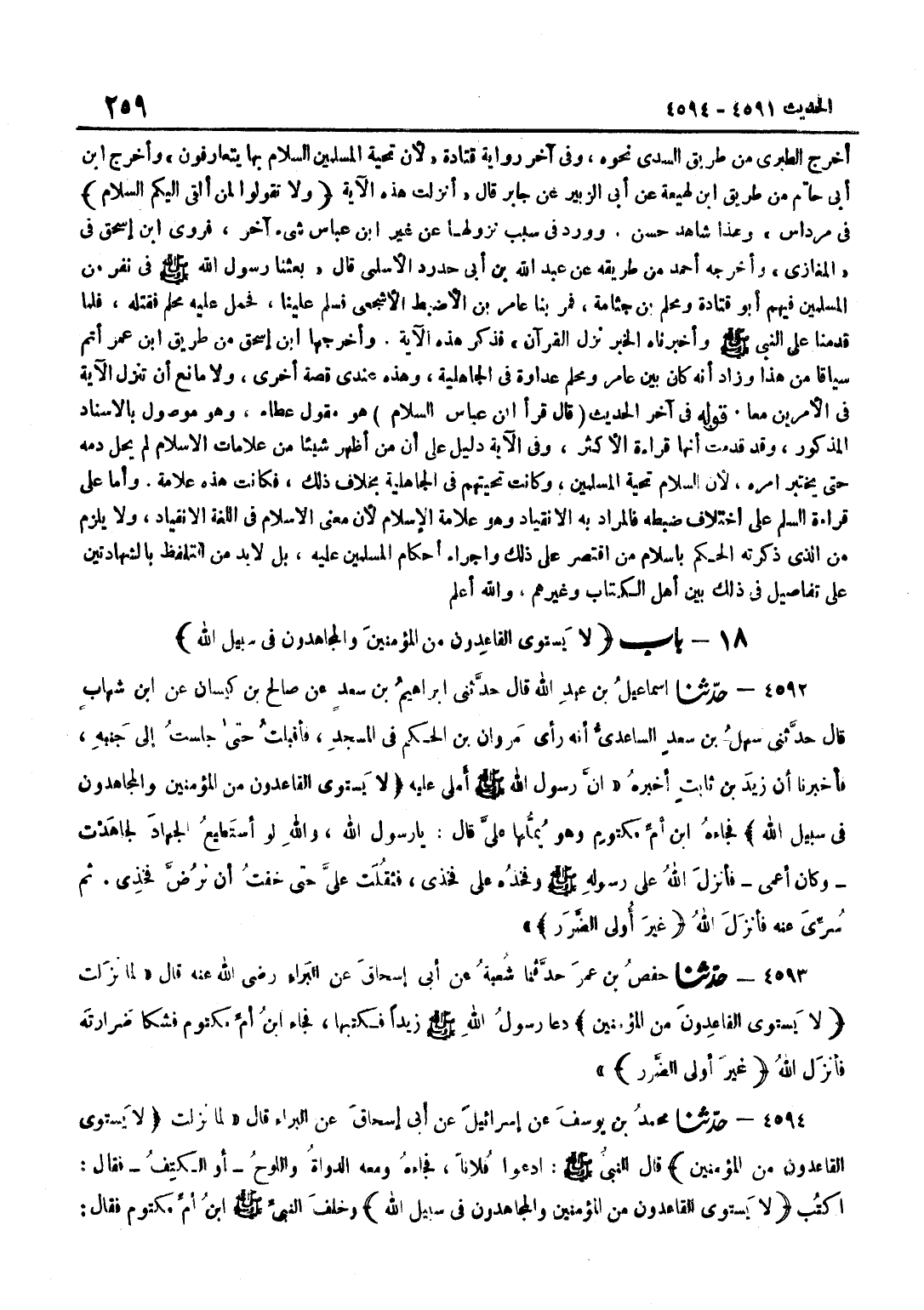 أَخْرَجَ الطَّبَرِيُّ مِنْ طَرِيقِ السُّدِّيِّ نَحْوَهُ وَفِي آخِرِ رِوَايَةِ قَتَادَةَ لِأَنَّ تَحِيَّةَ الْمُسْلِمِينَ السَّلَامُ بهَا يَتَعَارَفُونَ وَأخرج بن أبي حَاتِم من طَرِيق بن لَهِيعَةَ عَنْ أَبِي الزُّبَيْرِ عَنْ جَابِرٍ قَالَ أُنْزِلَتْ هَذِهِ الْآيَةُ وَلَا تَقُولُوا لِمَنْ أَلْقَى إِلَيْكُم السَّلَام فِي مِرْدَاسٍ وَهَذَا شَاهِدٌ حَسَنٌ وَوَرَدَ فِي سَبَب نُزُولهَا عَن غير بن عَبَّاس شَيْء آخر فروى بن إِسْحَاقَ فِي الْمَغَازِي وَأَخْرَجَهُ أَحْمَدُ مِنْ طَرِيقِهِ عَنْ عَبْدِ اللَّهِ بْنِ أَبِي حَدْرَدٍ الْأَسْلَمِيِّ قَالَ بَعَثَنَا رَسُولُ اللَّهِ صَلَّى اللَّهُ عَلَيْهِ وَسَلَّمَ فِي نَفَرٍ مِنَ الْمُسْلِمِينَ فِيهِمْ أَبُو قَتَادَةَ وَمُحَلِّمُ بْنُ جَثَّامَةَ فَمَرَّ بِنَا عَامِرُ بْنُ الْأَضْبَطِ الْأَشْجَعِيُّ فَسَلَّمَ عَلَيْنَا فَحَمَلَ عَلَيْهِ مُحَلِّمٌ فَقَتَلَهُ فَلَمَّا قَدِمْنَا عَلَى النَّبِيِّ صَلَّى اللَّهُ عَلَيْهِ وَسَلَّمَ وَأَخْبَرْنَاهُ الْخَبَرَ نَزَلَ الْقُرْآنُ فَذكر هَذِه الْآيَة وأخرجها بن إِسْحَاق من طَرِيق بن عُمَرَ أَتَمَّ سِيَاقًا مِنْ هَذَا وَزَادَ أَنَّهُ كَانَ بَيْنَ عَامِرٍ وَمُحَلِّمٍ عَدَاوَةٌ فِي الْجَاهِلِيَّةِ وَهَذِهِ عِنْدِي قِصَّةٌ أُخْرَى وَلَا مَانِعَ أَنْ تَنْزِلَ الْآيَةُ فِي الْأَمْرَيْنِ مَعًا قَوْلُهُ فِي آخر الحَدِيث قَالَ قَرَأَ بن عَبَّاسٍ السَّلَامَ هُوَ مَقُولُ عَطَاءٍ وَهُوَ مَوْصُولٌ بِالْإِسْنَادِ الْمَذْكُورِ وَقَدْ قَدَّمْتُ أَنَّهَا قِرَاءَةُ الْأَكْثَرِ وَفِي الْآيَةِ دَلِيلٌ عَلَى أَنَّ مَنْ أَظْهَرَ شَيْئًا مِنْ عَلَامَاتِ الْإِسْلَامِ لَمْ يَحِلَّ دَمُهُ حَتَّى يُخْتَبَرَ أَمْرُهُ لِأَنَّ السَّلَامَ تَحِيَّةُ الْمُسْلِمِينَ وَكَانَتْ تَحِيَّتُهُمْ فِي الْجَاهِلِيَّةِ بِخِلَافِ ذَلِكَ فَكَانَتْ هَذِهِ عَلَامَةً وَأَمَّا عَلَى قِرَاءَةِ السَّلَمِ عَلَى اخْتِلَافِ ضَبْطِهِ فَالْمُرَادُ بِهِ الِانْقِيَادُ وَهُوَ عَلَامَةُ الْإِسْلَامِ لِأَنَّ مَعْنَى الْإِسْلَامِ فِي اللُّغَةِ الِانْقِيَادُ وَلَا يَلْزَمُ مِنَ الَّذِي ذَكَرْتُهُ الْحُكْمُ بِإِسْلَامِ مَنِ اقْتَصَرَ عَلَى ذَلِكَ وَإِجْرَاءُ أَحْكَامِ الْمُسْلِمِينَ عَلَيْهِ بَلْ لَا بُدَّ مِنَ التَّلَفُّظِ بِالشَّهَادَتَيْنِ عَلَى تَفَاصِيلَ فِي ذَلِكَ بَيْنَ أَهْلِ الْكِتَابِ وَغَيرهم وَالله أعلم