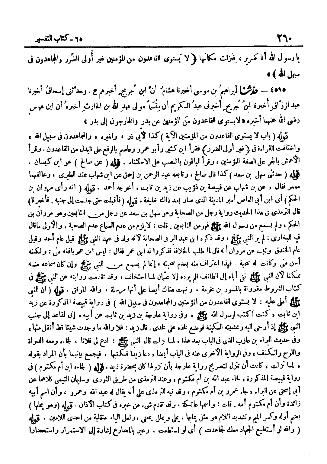 [4592] قَوْلُهُ عَن صَالح هُوَ بن كَيْسَانَ قَوْلُهُ حَدَّثَنِي سَهْلُ بْنُ سَعْدٍ كَذَا قَالَ صَالِحٌ وَتَابَعَهُ عَبْدُ الرَّحْمَنِ بْنُ إِسْحَاقَ عَن بن شِهَابٍ عِنْدَ الطَّبَرِيِّ وَخَالَفَهُمَا مَعْمَرٌ فَقَالَ عَنِ بن شِهَابٍ عَنْ قَبِيصَةَ بْنِ ذُؤَيْبٍ عَنْ زَيْدِ بْنِ ثَابِتٍ أَخْرَجَهُ أَحْمَدُ قَوْلُهُ أَنَّهُ رَأَى مَرْوَان بن الحكم أَي بن أَبِي الْعَاصِ أَمِيرَ الْمَدِينَةِ الَّذِي صَارَ بَعْدَ ذَلِكَ خَلِيفَةً قَوْلُهُ فَأَقْبَلْتُ حَتَّى جَلَسْتُ إِلَى جَنْبِهِ فَأَخْبَرَنَا قَالَ التِّرْمِذِيُّ فِي هَذَا الْحَدِيثِ رِوَايَةُ رَجُلٍ مِنَ الصَّحَابَةِ وَهُوَ سَهْلُ بْنُ سَعْدٍ عَنْ رَجُلٍ مِنَ التَّابِعِينَ وَهُوَ مَرْوَانُ بْنُ الْحَكَمِ وَلَمْ يَسْمَعْ مِنْ رَسُولِ اللَّهِ صَلَّى اللَّهُ عَلَيْهِ وَسَلَّمَ فَهُوَ مِنَ التَّابِعِينَ قُلْتُ لَا يَلْزَمُ مِنْ عَدَمِ السَّمَاعِ عَدَمُ الصُّحْبَة وَالْأَوْلَى مَا قَالَ فِيهِ الْبُخَارِيُّ لَمْ يَرَ النَّبِيَّ صَلَّى اللَّهُ عَلَيْهِ وَسَلَّمَ وَقَدْ ذَكَرَهُ بن عَبْدِ الْبَرِّ فِي الصَّحَابَةِ لِأَنَّهُ وُلِدَ فِي عَهْدِ النَّبِيِّ صَلَّى اللَّهُ عَلَيْهِ وَسَلَّمَ قَبْلَ عَامِ أُحُدٍ وَقِيلَ عَامَ الْخَنْدَقِ وَثَبَتَ عَنْ مَرْوَانَ أَنَّهُ قَالَ لَمَّا طَلَبَ الْخِلَافَةَ فَذَكَرُوا لَهُ بن عمر فَقَالَ لَيْسَ بن عُمَرَ بِأَفْقَهَ مِنِّي وَلَكِنَّهُ أَسَنُّ مِنِّي وَكَانَتْ لَهُ صُحْبَةٌ فَهَذَا اعْتِرَافٌ مِنْهُ بِعَدَمِ صُحْبَتِهِ وَإِنَّمَا لَمْ يَسْمَعْ مِنَ النَّبِيِّ صَلَّى اللَّهُ عَلَيْهِ وَسَلَّمَ وَإِنْ كَانَ سَمَاعُهُ مِنْهُ مُمْكِنًا لِأَنَّ النَّبِيَّ صَلَّى اللَّهُ عَلَيْهِ وَسَلَّمَ نَفَى أَبَاهُ إِلَى الطَّائِفِ فَلَمْ يَرُدَّهُ إِلَّا عُثْمَانُ لَمَّا اسْتُخْلِفَ وَقَدْ تَقَدَّمَتْ رِوَايَتِهِ عَنِ النَّبِيِّ صَلَّى اللَّهُ عَلَيْهِ وَسَلَّمَ فِي كِتَابِ الشُّرُوطِ مَقْرُونَةً بِالْمِسْوَرِ بْنِ مَخْرَمَةَ وَنَبَّهْتُ هُنَاكَ أَيْضًا عَلَى أَنَّهَا مُرْسَلَةٌ وَاللَّهُ الْمُوَفِّقُ قَوْلُهُ أَنَّ النَّبِيَّ صَلَّى اللَّهُ عَلَيْهِ وَسَلَّمَ أَمْلَى عَلَيْهِ لَا يَسْتَوِي الْقَاعِدُونَ مِنْ الْمُؤْمِنِينَ وَالْمُجَاهِدُونَ فِي سَبِيل الله فِي رِوَايَةِ قَبِيصَةَ الْمَذْكُورَةِ عَنْ زَيْدِ بْنِ ثَابِتٍ كُنْتُ أَكْتُبُ لِرَسُولِ اللَّهِ صَلَّى اللَّهُ عَلَيْهِ وَسَلَّمَ وَفِي رِوَايَةِ خَارِجَةَ بْنِ زَيْدِ بْنِ ثَابِتٍ عَنْ أَبِيهِ إِنِّي لَقَاعِدٌ إِلَى جَنْبِ النَّبِيِّ صَلَّى اللَّهُ عَلَيْهِ وَسَلَّمَ إِذْ أُوحِيَ إِلَيْهِ وَغَشِيَتْهُ السَّكِينَةُ فَوَضَعَ فَخِذَهُ عَلَى فَخِذِي قَالَ زَيْدٌ فَلَا وَاللَّهِ مَا وَجَدْتُ شَيْئًا قَطُّ أَثْقَلَ مِنْهَا وَفِي حَدِيثِ الْبَرَاءِ بْنِ عَازِبٍ الَّذِي فِي الْبَابِ بَعْدَ هَذَا لَمَّا نَزَلَتْ قَالَ النَّبِيُّ صَلَّى اللَّهُ عَلَيْهِ وَسَلَّمَ ادْعُ لِي فُلَانًا فَجَاءَهُ وَمَعَهُ الدَّوَاةُ وَاللَّوْحُ وَالْكَتِفُ وَفِي الرِّوَايَةِ الْأُخْرَى عَنْهُ فِي الْبَابِ أَيْضًا دَعَا زَيْدًا فَكَتَبَهَا فَيُجْمَعُ بَيْنَهُمَا بِأَنَّ الْمُرَادَ بِقَوْلِهِ لَمَّا نَزَلَتْ كَادَتْ أَنْ تَنْزِلَ لِتَصْرِيحِ رِوَايَةِ خَارِجَةَ بِأَنَّ نُزُولَهَا كَانَ بِحَضْرَة زيد قَوْله فَجَاءَهُ بن أُمِّ مَكْتُومٍ فِي رِوَايَةِ قَبِيصَةَ الْمَذْكُورَةِ فَجَاءَ عَبْدُ اللَّهِ بْنُ أُمِّ مَكْتُومٍ وَعِنْدَ التِّرْمِذِيِّ مِنْ طَرِيقِ الثَّوْرِيِّ وَسُلَيْمَانَ التَّيْمِيِّ كِلَاهُمَا عَنْ أَبِي إِسْحَاقَ عَنِ الْبَرَاءِ جَاءَ عَمْرُو بْنُ أُمِّ مَكْتُومٍ وَقَدْ نَبَّهَ التِّرْمِذِيُّ عَلَى أَنَّهُ يُقَالُ لَهُ عَبْدُ اللَّهِ وَعَمْرٌو وَأَن