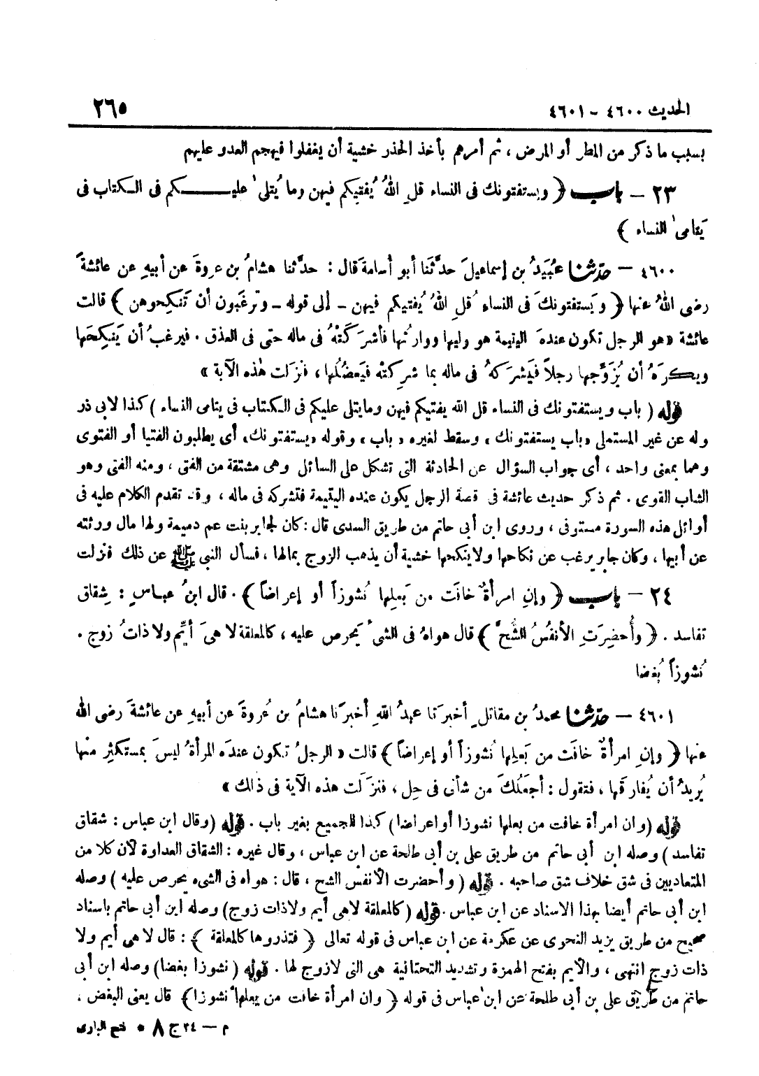 كَذَا لِأَبِي ذَرٍّ وَلَهُ عَنْ غَيْرِ الْمُسْتَمْلِي بَابُ يَسْتَفْتُونَكَ وَسَقَطَ لِغَيْرِهِ بَابُ وَقَوْلُهُ يَسْتَفْتُونَكَ أَيْ يَطْلُبُونَ الْفُتْيَا أَوِ الْفَتْوَى وَهُمَا بِمَعْنًى وَاحِدٍ أَيْ جَوَابُ السُّؤَالِ عَنِ الْحَادِثَةِ الَّتِي تُشْكِلُ عَلَى السَّائِلِ وَهِيَ مُشْتَقَّةٌ مِنَ الْفَتى وَمِنْه الْفَتى وَهُوَ الشَّاب الْقوي ثمَّ ذكر حَدِيثُ عَائِشَةَ فِي قِصَّةِ الرَّجُلِ يَكُونُ عِنْدَهُ الْيَتِيمَةُ فَتُشْرِكُهُ فِي مَالِهِ وَقَدْ تَقَدَّمَ الْكَلَامُ عَلَيْهِ فِي أَوَائِلَ هَذِهِ السُّورَةِ مُسْتَوْفًى وَرَوَى بن أَبِي حَاتِمٍ مِنْ طَرِيقِ السُّدِّيِّ قَالَ كَانَ لِجَابِرِ بِنْتُ عَمٍّ دَمِيمَةٌ وَلَهَا مَالٌ وَرِثَتْهُ عَنْ أَبِيهَا وَكَانَ جَابِرٌ يَرْغَبُ عَنْ نِكَاحِهَا وَلَا يُنْكِحُهَا خَشْيَةَ أَنْ يَذْهَبَ الزَّوْجُ بِمَالِهَا فَسَأَلَ النَّبِيُّ صَلَّى اللَّهُ عَلَيْهِ وَسَلَّمَ عَنْ ذَلِكَ فَنزلت قَوْله وَإِن امْرَأَة خَافت من بَعْلهَا نُشُوزًا أَو اعراضا كَذَا للْجَمِيع بِغَيْر بَاب قَوْله وَقَالَ بن عَبَّاس شقَاق تفاسد وَصله بن أَبِي حَاتِمٍ مِنْ طَرِيقِ عَلِيِّ بْنِ أَبِي طَلْحَةَ عَنِ بن عَبَّاسٍ وَقَالَ غَيْرُهُ الشِّقَاقُ الْعَدَاوَةُ لِأَنَّ كُلًّا مِنَ الْمُتَعَادِيَيْنِ فِي شِقٍّ خِلَافَ شِقِّ صَاحِبِهِ قَوْله وأحضرت الْأَنْفس الشُّح قَالَ هَوَاهُ فِي الشَّيْءِ يَحْرِصُ عَلَيْهِ وَصَلَهُ بن أبي حَاتِم أَيْضا بِهَذَا الْإِسْنَاد عَن بن عَبَّاسٍ قَوْلُهُ كَالْمُعَلَّقَةِ لَا هِيَ أَيِّمٌ وَلَا ذَات زوج وَصله بن أَبِي حَاتِمٍ بِإِسْنَادٍ صَحِيحٍ مِنْ طَرِيقِ يَزِيدَ النَّحْوِيِّ عَنْ عِكْرِمَةَ عَنِ بن عَبَّاس فِي قَوْله تَعَالَى فتذروها كالمعلقة قَالَ لَا هِيَ أَيِّمٌ وَلَا ذَاتُ زَوْجٍ انْتَهَى وَالْأَيِّمُ بِفَتْحِ الْهَمْزَةِ وَتَشْدِيدِ التَّحْتَانِيَّةِ هِيَ الَّتِي لَا زَوْجَ لَهَا قَوْلُهُ نُشُوزًا بُغْضًا وَصله بن أَبِي حَاتِمٍ مِنْ طَرِيقِ عَلِيِّ بْنِ أَبِي طَلْحَةَ عَنِ بن عَبَّاسٍ فِي