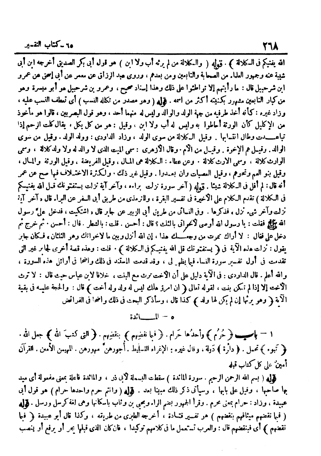 الله يفتيكم فِي الْكَلَالَة قَوْلُهُ وَالْكَلَالَةُ مَنْ لَمْ يَرِثْهُ أَبٌ وَلَا بن هُوَ قَول أبي بكر الصّديق أخرجه بن أَبِي شَيْبَةَ عَنْهُ وَجُمْهُورُ الْعُلَمَاءِ مِنَ الصَّحَابَةِ وَالتَّابِعِينَ وَمَنْ بَعْدَهُمْ وَرَوَى عَبْدِ الرَّزَّاقِ عَنْ مَعْمَرٍ عَنْ أَبِي إِسْحَاقَ عَنْ عَمْرِو بْنِ شُرَحْبِيلَ قَالَ مَا رَأَيْتُهُمْ إِلَّا تَوَاطَئُوا عَلَى ذَلِكَ وَهَذَا إِسْنَادٌ صَحِيحٌ وَعَمْرُو بْنُ شُرَحْبِيلَ هُوَ أَبُو مَيْسَرَةَ وَهُوَ مِنْ كِبَارِ التَّابِعِينَ مَشْهُورٌ بِكُنْيَتِهِ أَكْثَرَ مِنِ اسْمِهِ قَوْلُهُ وَهُوَ مَصْدَرٌ مِنْ تَكَلَّلَهُ النَّسَبُ أَيْ تَعَطَّفَ النَّسَبُ عَلَيْهِ وَزَادَ غَيْرُهُ كَأَنَّهُ أَخَذَ طَرَفَيْهِ مِنْ جِهَةِ الْوَلَدِ وَالْوَالِدِ وَلَيْسَ لَهُ مِنْهُمَا أَحَدٌ وَهُوَ قَوْلُ الْبَصْرِيِّينَ قَالُوا هُوَ مَأْخُوذٌ مِنَ الْإِكْلِيلِ كَأَنَّ الْوَرَثَةَ أَحَاطُوا بِهِ وَلَيْسَ لَهُ أَب وَلَا بن وَقِيلَ هُوَ مِنْ كَلَّ يَكِلُّ يُقَالُ كَلَّتِ الرَّحِمُ إِذَا تَبَاعَدَتْ وَطَالَ انْتِسَابُهَا وَقِيلَ الْكَلَالَةُ مَنْ سِوَى الْوَلَدِ وَزَادَ الدَّاوُدِيُّ وَوَلَدُ الْوَلَدِ وَقِيلَ مَنْ سِوَى الْوَالِدِ وَقِيلَ هُمُ الْإِخْوَةُ وَقِيلَ مِنَ الْأُمِّ وَقَالَ الْأَزْهَرِيُّ سُمِّيَ الْمَيِّتُ الَّذِي لَا وَالِدَ لَهُ وَلَا وَلَدَ كَلَالَةً وَسُمِّيَ الْوَارِثُ كَلَالَةً وَسُمِّيَ الْإِرْثُ كَلَالَةً وَعَنْ عَطَاءٍ الْكَلَالَةُ هِيَ الْمَالُ وَقِيلَ الْفَرِيضَةُ وَقِيلَ الْوَرَثَةُ وَالْمَالُ وَقِيلَ بَنُو الْعَمِّ وَنَحْوُهُمْ وَقِيلَ الْعَصَبَاتُ وَإِنْ بَعُدُوا وَقِيلَ غَيْرُ ذَلِكَ وَلِكَثْرَةِ الِاخْتِلَافِ فِيهَا صَحَّ عَنْ عُمَرَ أَنَّهُ قَالَ لَمْ أَقُلْ فِي الْكَلَالَةِ شَيْئًا