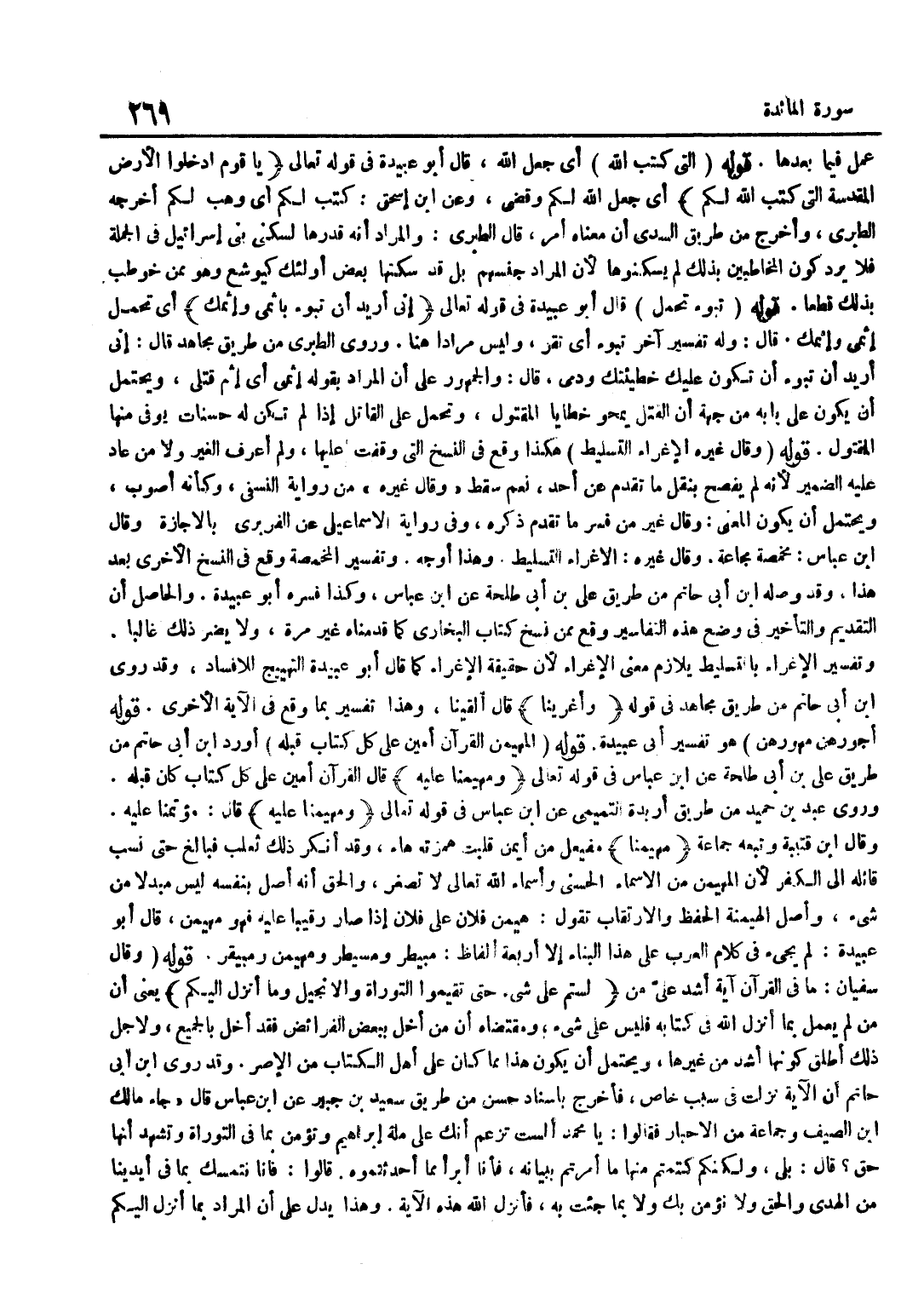 عَمِلَ فِيمَا بَعْدَهَا قَوْلُهُ الَّتِي كَتَبَ اللَّهُ أَيْ جَعَلَ اللَّهُ قَالَ أَبُو عُبَيْدَةَ فِي قَوْله تَعَالَى يَا قوم ادْخُلُوا الْأَرْضَ الْمُقَدَّسَةَ الَّتِي كَتَبَ اللَّهُ لَكُمْ أَي جعل الله لكم وَقضى وَعَن بن إِسْحَاقَ كَتَبَ لَكُمْ أَيْ وَهَبَ لَكُمْ أَخْرَجَهُ الطَّبَرِيُّ وَأَخْرَجَ مِنْ طَرِيقِ السُّدِّيِّ أَنَّ مَعْنَاهُ أَمَرَ قَالَ الطَّبَرِيُّ وَالْمُرَادُ أَنَّهُ قَدَّرَهَا لِسُكْنَى بَنِي إِسْرَائِيلَ فِي الْجُمْلَةِ فَلَا يَرِدُ كَوْنُ الْمُخَاطَبِينَ بِذَلِكَ لَمْ يَسْكُنُوهَا لِأَنَّ الْمُرَادَ جِنْسُهُمْ بَلْ قَدْ سَكَنَهَا بَعْضُ أُولَئِكَ كَيُوشَعَ وَهُوَ مِمَّنْ خُوطِبَ بِذَلِكَ قَطْعًا قَوْلُهُ تَبُوءَ تَحْمِلَ قَالَ أَبُو عُبَيْدَةَ فِي قَوْلِهِ تَعَالَى إِنِّي أُرِيد أَن تبوء بإثمي وإثمك أَيْ تَحْمِلَ إِثْمِي وَإِثْمَكَ قَالَ وَلَهُ تَفْسِيرٌ آخَرُ تَبُوءَ أَيْ تُقِرَّ وَلَيْسَ مُرَادًا هُنَا وَرَوَى الطَّبَرِيُّ مِنْ طَرِيقِ مُجَاهِدٍ قَالَ إِنِّي أُرِيدَ أَنْ تَبُوءَ أَنْ تَكُونَ عَلَيْكَ خَطِيئَتُكَ وَدَمِي قَالَ وَالْجُمْهُورُ عَلَى أَنَّ الْمُرَادَ بِقَوْلِهِ إِثْمِي أَيْ إِثْمُ قَتْلِي وَيَحْتَمِلُ أَنْ يَكُونَ عَلَى بَابِهِ مِنْ جِهَةِ أَنَّ الْقَتْلَ يَمْحُوَ خَطَايَا الْمَقْتُولِ وَتُحْمَلُ عَلَى الْقَاتِلِ إِذَا لَمْ تَكُنْ لَهُ حَسَنَاتٌ يُوَفَّى مِنْهَا الْمَقْتُولُ قَوْلُهُ وَقَالَ غَيْرُهُ الْإِغْرَاءُ التَّسْلِيطُ هَكَذَا وَقَعَ فِي النُّسَخِ الَّتِي وَقَفْتُ عَلَيْهَا وَلَمْ أَعْرِفِ الْغَيْرَ وَلَا مَنْ عَادَ عَلَيْهِ الضَّمِيرُ لِأَنَّهُ لَمْ يُفْصِحْ بِنَقْلِ مَا تَقَدَّمَ عَنْ أَحَدٍ نَعَمْ سَقَطَ وَقَالَ غَيْرُهُ مِنْ رِوَايَةِ النَّسَفِيِّ وَكَأَنَّهُ أَصْوَبُ وَيَحْتَمِلُ أَنْ يَكُونَ الْمَعْنَى وَقَالَ غَيْرُ مَنْ فَسَّرَ مَا تَقَدَّمَ ذِكْرُهُ وَفِي رِوَايَةِ الْإِسْمَاعِيلِيّ عَن الْفربرِي بِالْإِجَازَةِ وَقَالَ بن عَبَّاسٍ مَخْمَصَةٌ مَجَاعَةٌ وَقَالَ غَيْرُهُ الْإِغْرَاءُ التَّسْلِيطُ وَهَذَا أوجه وَتَفْسِير الْمَخْمَصَةِ وَقَعَ فِي النُّسَخِ الْأُخْرَى بَعْدَ هَذَا وَقد وَصله بن أَبِي حَاتِمٍ مِنْ طَرِيقِ عَلِيِّ بْنِ أَبِي طَلْحَةَ عَنِ بن عَبَّاسٍ وَكَذَا فَسَّرَهُ أَبُو عُبَيْدَةَ وَالْحَاصِلُ أَنَّ التَّقْدِيمَ وَالتَّأْخِيرَ فِي وَضْعِ هَذِهِ التَّفَاسِيرِ وَقَعَ مِمَّنْ نَسَخَ كِتَابَ الْبُخَارِيِّ كَمَا قَدَّمْنَاهُ غَيْرَ مرّة وَلَا يضر ذَلِك غَالِبا وَتَفْسِير الإغراء بالتسليط يلازم معنى الإغراء لِأَن حَقِيقَةُ الْإِغْرَاءِ كَمَا قَالَ أَبُو عُبَيْدَةَ التَّهْيِيجُ للافساد وَقد روى بن أَبِي حَاتِمٍ مِنْ طَرِيقِ مُجَاهِدٍ فِي قَوْلِهِ وَأَغْرَيْنَا قَالَ أَلْقَيْنَا وَهَذَا تَفْسِيرٌ بِمَا وَقَعَ فِي الْآيَةِ الْأُخْرَى قَوْلُهُ أُجُورَهُنَّ مُهُورَهُنَّ هُوَ تَفْسِيرُ أَبِي عُبَيْدَةَ قَوْلُهُ الْمُهَيْمِنُ الْقُرْآنُ أَمِينٌ على كل كتاب قبله أورد بن أَبِي حَاتِمٍ مِنْ طَرِيقِ عَلِيِّ بْنِ أَبِي طَلْحَةَ عَنِ بْنِ عَبَّاسٍ فِي قَوْلِهِ تَعَالَى ومهيمنا عَلَيْهِ قَالَ الْقُرْآنُ أَمِينٌ عَلَى كُلِّ كِتَابٍ كَانَ قَبْلَهُ وَرَوَى عَبْدُ بْنُ حُمَيْدٍ مِنْ طَرِيقِ أربدة التَّمِيمِي عَن بن عَبَّاس فِي قَوْله تَعَالَى ومهيمنا عَلَيْهِ قَالَ مؤتمنا عَلَيْهِ وَقَالَ بن قُتَيْبَةَ وَتَبِعَهُ جَمَاعَةٌ مُهَيْمِنًا مُفَيْعِلٌ مِنْ أَيْمَنَ قُلِبَتْ هَمْزَتُهُ هَاءً وَقَدْ أَنْكَرَ ذَلِكَ ثَعْلَبٌ فَبَالَغَ حَتَّى نَسَبَ قَائِلَهُ إِلَى الْكُفْرِ لِأَنَّ الْمُهَيْمِنَ مِنَ الْأَسْمَاءِ الْحُسْنَى وَأَسْمَاءُ اللَّهِ تَعَالَى لَا تُصَغَّرُ وَالْحَقُّ أَنَّهُ أَصْلٌ بِنَفْسِهِ لَيْس