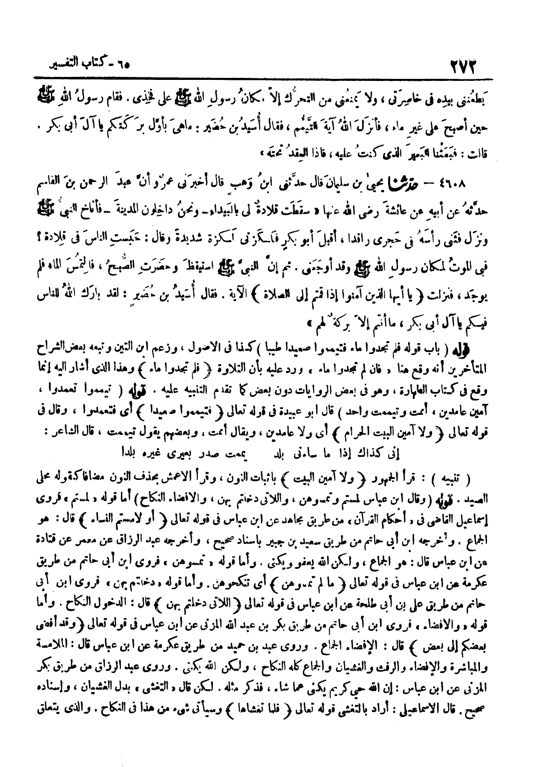 كَذَا فِي الْأُصُول وَزعم بن التِّينِ وَتَبِعَهُ بَعْضُ الشُّرَّاحِ الْمُتَأَخِّرِينَ أَنَّهُ وَقَعَ هُنَا فَإِنْ لَمْ تَجِدُوا مَاءً وَرُدَّ عَلَيْهِ بِأَن التِّلَاوَة فَلم تَجدوا مَاء وَهَذَا الَّذِي أَشَارَ إِلَيْهِ إِنَّمَا وَقَعَ فِي كِتَابِ الطَّهَارَةِ وَهُوَ فِي بَعْضِ الرِّوَايَاتِ دُونَ بَعْضٍ كَمَا تَقَدَّمَ التَّنْبِيهُ عَلَيْهِ قَوْلُهُ تَيَمَّمُوا تَعَمَّدُوا آمِّينَ عَامِدِينَ أَمَّمْتُ وَتَيَمَّمْتُ وَاحِدٌ قَالَ أَبُو عُبَيْدَةَ فِي قَوْلِهِ تَعَالَى فَتَيَمَّمُوا صَعِيدًا أَيْ فَتَعَمَّدُوا وَقَالَ فِي قَوْلِهِ تَعَالَى وَلَا آمين الْبَيْت الْحَرَام أَيْ وَلَا عَامِدِينَ وَيُقَالُ أَمَّمْتُ وَبَعْضُهُمْ يَقُولُ تَيَمَّمْتُ قَالَ الشَّاعِرُ إِنِّي كَذَاكَ إِذَا مَا سَاءَنِي بَلَدٌ يَمَّمْتُ صَدْرَ بَعِيرِي غَيْرَهُ بَلَدَا تَنْبِيه قَرَأَ الْجُمْهُور وَلَا آمين الْبَيْت بِإِثْبَاتِ النُّونِ وَقَرَأَ الْأَعْمَشُ بِحَذْفِ النُّونِ مُضَافًا كَقَوْلِه محلى الصَّيْد قَوْله وَقَالَ بن عَبَّاسٍ لَمَسْتُمْ وَتَمَسُّوهُنَّ وَاللَّاتِي دَخَلْتُمْ بِهِنَّ وَالْإِفْضَاءُ النِّكَاحُ أَمَّا قَوْلُهُ لَمَسْتُمْ فَرَوَى إِسْمَاعِيلُ الْقَاضِي فِي أَحْكَامِ الْقُرْآنِ مِنْ طَرِيقِ مُجَاهِدٍ عَنِ بن عَبَّاسٍ فِي قَوْلِهِ تَعَالَى أَوْ لَامَسْتُمُ النِّسَاءَ قَالَ هُوَ الْجِمَاع وَأخرجه بن أَبِي حَاتِمٍ مِنْ طَرِيقِ سَعِيدِ بْنِ جُبَيْرٍ بِإِسْنَادٍ صَحِيحٍ وَأَخْرَجَهُ عَبْدُ الرَّزَّاقِ عَنْ مَعْمَرٍ عَنْ قَتَادَةَ عَنْ بن عَبَّاسٍ قَالَ هُوَ الْجِمَاعُ وَلَكِنِ اللَّهَ يَعْفُو ويكنى وَأما قَوْله تمَسُّوهُنَّ فروى بن أبي حَاتِم من طَرِيق عِكْرِمَة عَن بن عَبَّاسٍ فِي قَوْلِهِ تَعَالَى مَا لَمْ تَمَسُّوهُنَّ أَيْ تَنْكِحُوهُنَّ وَأَمَّا قَوْلُهُ دَخَلْتُمْ بِهِنَّ فَرَوَى بن أَبِي حَاتِمٍ مِنْ طَرِيقِ عَلِيِّ بْنِ أَبِي طَلْحَةَ عَنِ بْنِ عَبَّاسٍ فِي قَوْلِهِ تَعَالَى اللَّاتِي دَخَلْتُم بِهن قَالَ الدُّخُولُ النِّكَاحُ وَأَمَّا قَوْلُهُ وَالْإِفْضَاءُ فَرَوَى بن أَبِي حَاتِمٍ مِنْ طَرِيقِ بَكْرِ بْنِ عَبْدِ اللَّهِ الْمُزَنِيِّ عَن بن عَبَّاسٍ فِي قَوْلِهِ تَعَالَى وَقَدْ أَفْضَى بَعْضُكُمْ إِلَى بعض قَالَ الْإِفْضَاءُ الْجِمَاعُ وَرَوَى عَبْدُ بْنُ حُمَيْدٍ من طَرِيق عِكْرِمَة عَن بن عَبَّاسٍ قَالَ الْمُلَامَسَةُ وَالْمُبَاشَرَةُ وَالْإِفْضَاءُ وَالرَّفَثُ وَالْغَشَيَانُ وَالْجِمَاعُ كُلُّهُ النِّكَاحُ وَلَكِنَّ اللَّهَ يُكَنِّي وَرَوَى عَبْدُ الرَّزَّاقِ مِنْ طَرِيقِ بَكْرٍ الْمُزَنِيِّ عَنِ بن عَبَّاسٍ إِنَّ اللَّهَ حَيِيٌّ كَرِيمٌ يُكَنِّي عَمَّا شَاءَ فَذَكَرَ مِثْلَهُ لَكِنْ قَالَ التَّغَشِّي بَدَلَ الْغَشَيَانِ وَإِسْنَادُهُ صَحِيحٌ قَالَ الْإِسْمَاعِيلِيُّ أَرَادَ بِالتَّغَشِّي قَوْله تَعَالَى فَلَمَّا تغشاها وَسَيَأْتِي شَيْءٌ مِنْ هَذَا فِي النِّكَاحِ وَالَّذِي يتَعَلَّق