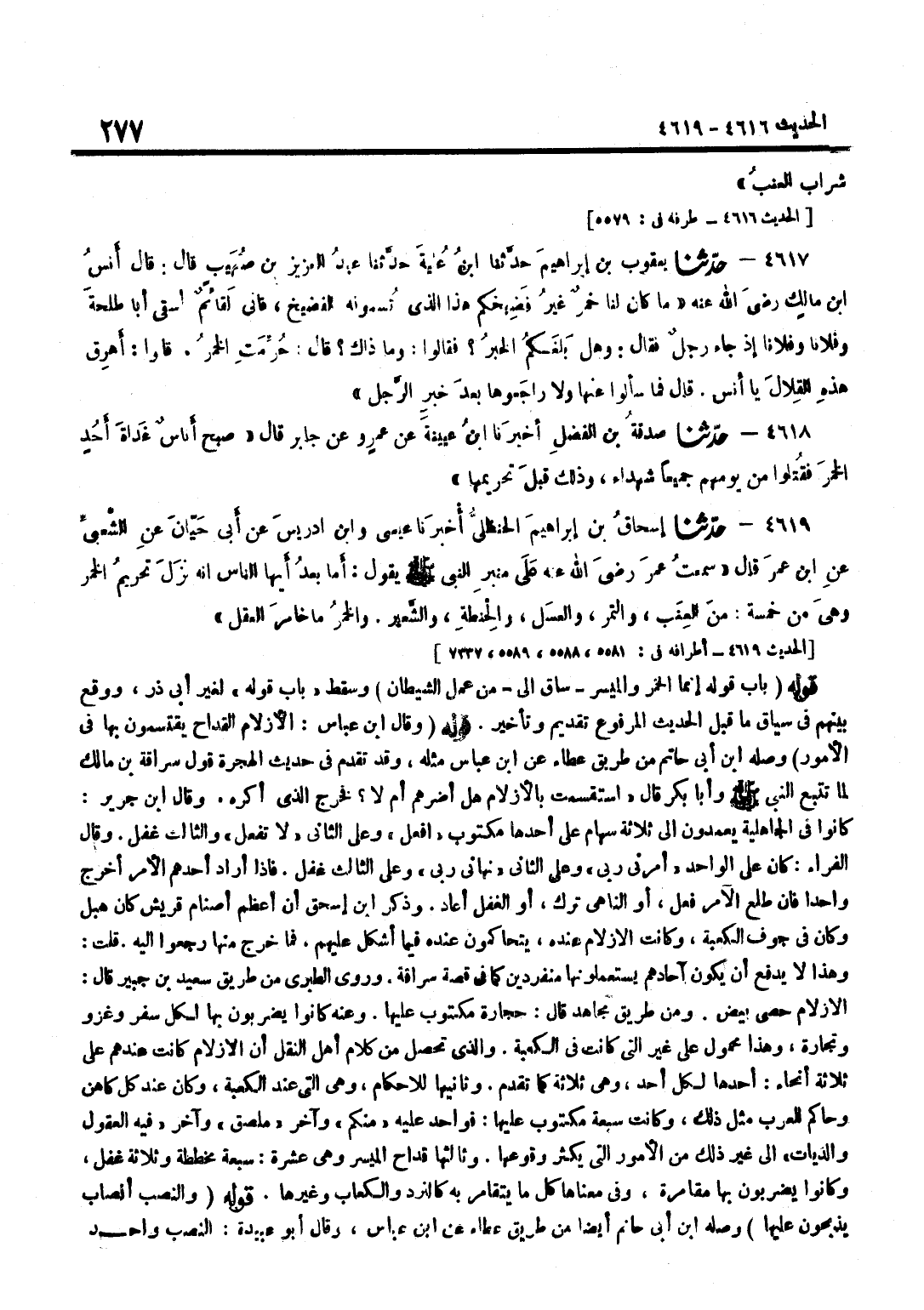 سَاق إِلَى من عمل الشَّيْطَان وَسَقَطَ بَابُ قَوْلِهِ لِغَيْرِ أَبِي ذَرٍّ وَوَقَعَ بَيْنَهُمْ فِي سِيَاقِ مَا قَبْلَ الْحَدِيثِ الْمَرْفُوعِ تَقْدِيم وَتَأْخِير قَوْله وَقَالَ بن عَبَّاسٍ الْأَزْلَامُ الْقِدَاحُ يَقْتَسِمُونَ بِهَا فِي الْأُمُورِ وَصله بن أبي حَاتِم من طَرِيق عَطاء عَن بن عَبَّاسٍ مِثْلَهُ وَقَدْ تَقَدَّمَ فِي حَدِيثِ الْهِجْرَةِ قَوْلُ سُرَاقَةَ بْنِ مَالِكٍ لَمَّا تَتَبَّعَ النَّبِيَّ صَلَّى اللَّهُ عَلَيْهِ وَسَلَّمَ وَأَبَا بَكْرٍ قَالَ اسْتَقْسَمْتُ بِالْأَزْلَامِ هَلْ أَضَرُّهُمْ أَمْ لَا فَخَرَجَ الَّذِي أكره وَقَالَ بن جَرِيرٍ كَانُوا فِي الْجَاهِلِيَّةِ يَعْمِدُونَ إِلَى ثَلَاثَةِ سِهَامٍ عَلَى أَحَدِهَا مَكْتُوبٌ افْعَلْ وَعَلَى الثَّانِي لَا تَفْعَلْ وَالثَّالِثُ غُفْلٌ وَقَالَ الْفَرَّاءُ كَانَ عَلَى الْوَاحِدِ أَمَرَنِي رَبِّي وَعَلَى الثَّانِي نَهَانِي رَبِّي وَعَلَى الثَّالِثِ غُفْلٌ فَإِذَا أَرَادَ أَحَدُهُمُ الْأَمْرَ أَخْرَجَ وَاحِدًا فَإِنْ طَلَعَ الْآمِرُ فَعَلَ أَوِ النَّاهِي تَرَكَ أَوِ الْغُفْلُ أَعَادَ وَذَكَرَ بن إِسْحَاقَ أَنَّ أَعْظَمَ أَصْنَامِ قُرَيْشٍ كَانَ هُبَلَ وَكَانَ فِي جَوْفِ الْكَعْبَةِ وَكَانَتِ الْأَزْلَامُ عِنْدَهُ يَتَحَاكَمُونَ عِنْدَهُ فِيمَا أَشْكَلَ عَلَيْهِمْ فَمَا خَرَجَ مِنْهَا رَجَعُوا إِلَيْهِ قُلْتُ وَهَذَا لَا يَدْفَعُ أَنْ يَكُونَ آحَادُهُمْ يَسْتَعْمِلُونَهَا مُنْفَرِدِينَ كَمَا فِي قِصَّةِ سُرَاقَةَ وَرَوَى الطَّبَرِيُّ مِنْ طَرِيقِ سَعِيدِ بْنِ جُبَيْرٍ قَالَ الْأَزْلَامُ حَصًى بِيضٌ وَمِنْ طَرِيقِ مُجَاهِدٍ قَالَ حِجَارَةٌ مَكْتُوبٌ عَلَيْهَا وَعَنْهُ كَانُوا يَضْرِبُونَ بِهَا لِكُلِّ سَفَرٍ وَغَزْوٍ وَتِجَارَةٍ وَهَذَا مَحْمُولٌ عَلَى غَيْرِ الَّتِي كَانَتْ فِي الْكَعْبَةِ وَالَّذِي تَحَصَّلَ مِنْ كَلَامِ أَهْلِ النَّقْلِ أَنَّ الْأَزْلَامَ كَانَتْ عِنْدَهُمْ عَلَى ثَلَاثَةِ أَنْحَاءٍ أَحَدُهَا لِكُلِّ أَحَدٍ وَهِيَ ثَلَاثَةٌ كَمَا تَقَدَّمَ وَثَانِيهَا لِلْأَحْكَامِ وَهِيَ الَّتِي عِنْدَ الْكَعْبَةِ وَكَانَ عِنْدَ كُلِّ كَاهِنٍ وَحَاكِمٍ لِلْعَرَبِ مِثْلُ ذَلِكَ وَكَانَتْ سَبْعَةً مَكْتُوبٌ عَلَيْهَا فَوَاحِدٌ عَلَيْهِ مِنْكُمْ وَآخَرُ مُلْصَقٌ وَآخَرُ فِيهِ الْعُقُولُ وَالدِّيَاتُ إِلَى غَيْرِ ذَلِكَ مِنَ الْأُمُورِ الَّتِي يَكْثُرُ وُقُوعُهَا وَثَالِثُهَا قِدَاحُ الْمَيْسِرِ وَهِيَ عَشَرَةٌ سَبْعَةٌ مُخَطَّطَةٌ وَثَلَاثَةٌ غُفْلٌ وَكَانُوا يَضْرِبُونَ بِهَا مُقَامَرَةً وَفِي مَعْنَاهَا كُلُّ مَا يُتَقَامَرُ بِهِ كَالنَّرْدِ وَالْكِعَابِ وَغَيْرِهَا قَوْلُهُ وَالنُّصُبُ أَنْصَابٌ يَذْبَحُونَ عَلَيْهَا وَصَلَهُ بن أَبِي حَاتِمٍ أَيْضًا مِنْ طَرِيقِ عَطَاءٍ عَنِ بن عَبَّاسٍ وَقَالَ أَبُو عُبَيْدَةَ النُّصُبُ وَاحِدُ