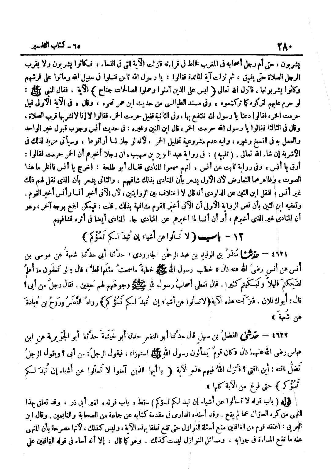 سَقَطَ بَابُ قَوْلِهِ لِغَيْرِ أَبِي ذَرٍّ وَقَدْ تَعَلَّقَ بِهَذَا النَّهْيِ مَنْ كَرِهَ السُّؤَالَ عَمَّا لَمْ يَقَعْ وَقَدْ أَسْنَدَهُ الدَّارِمِيُّ فِي مُقَدَّمَةِ كِتَابِهِ عَنْ جَمَاعَةٍ مِنَ الصَّحَابَةِ وَالتَّابِعِينَ وَقَالَ بن الْعَرَبِيِّ اعْتَقَدَ قَوْمٌ مِنَ الْغَافِلِينَ مَنْعَ أَسْئِلَةِ النَّوَازِلِ حَتَّى تَقَعَ تَعَلُّقًا بِهَذِهِ الْآيَةِ وَلَيْسَ كَذَلِكَ لِأَنَّهَا مُصَرِّحَةٌ بِأَنَّ الْمَنْهِيَّ عَنْهُ مَا تَقَعُ الْمَسَاءَةُ فِي جَوَابِهِ وَمَسَائِلُ النَّوَازِلِ لَيْسَتْ كَذَلِكَ وَهُوَ كَمَا قَالَ إِلَّا أَنَّهُ أَسَاءَ فِي قَوْلِهِ الْغَافِلِينَ عَلَى