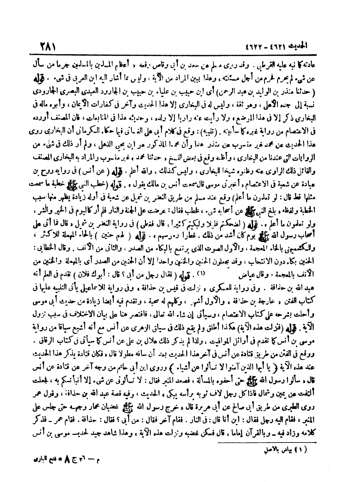 [4621] قَوْلُهُ حَدَّثَنَا مُنْذِرُ بْنُ الْوَلِيد بن عبد الرَّحْمَن أَي بن حَبِيبِ بْنِ عَلْيَاءَ بْنِ حَبِيبِ بْنِ الْجَارُودِ الْعَبْدِيُّ الْبَصْرِيُّ الْجَارُودِيُّ نِسْبَةً إِلَى جَدِّهِ الْأَعْلَى وَهُوَ ثِقَةٌ وَلَيْسَ لَهُ فِي الْبُخَارِيِّ إِلَّا هَذَا الْحَدِيثُ وَآخَرُ فِي كَفَّارَاتِ الْأَيْمَانِ وَأَبُوهُ مَاله فِي الْبُخَارِيِّ ذِكْرٌ إِلَّا فِي هَذَا الْمَوْضِعِ وَلَا رَأَيْتُ عَنْهُ رَاوِيًا إِلَّا وَلَدَهُ وَحَدِيثُهُ هَذَا فِي الْمُتَابَعَاتِ فَإِنَّ الْمُصَنِّفَ أَوْرَدَهُ فِي الِاعْتِصَامِ مِنْ رِوَايَةِ غَيْرِهِ كَمَا سَأُبَيِّنُهُ تَنْبِيهٌ وَقَعَ فِي كَلَامِ أَبِي عَلِيِّ الْغَسَّانِيِّ فِيمَا حَكَاهُ الْكَرْمَانِيُّ أَنَّ الْبُخَارِيَّ رَوَى هَذَا الْحَدِيثَ عَنْ مُحَمَّدٍ غَيْرَ مَنْسُوبٍ عَنْ مُنْذِرٍ هَذَا وَأَن مُحَمَّدًا الْمَذْكُور هُوَ بن يَحْيَى الذُّهْلِيُّ وَلَمْ أَرَ ذَلِكَ فِي شَيْءٍ مِنَ الرِّوَايَاتِ الَّتِي عِنْدَنَا مِنَ الْبُخَارِيِّ وَأَظُنُّهُ وَقَعَ فِي بَعْضِ النُّسَخِ حَدَّثَنَا مُحَمَّدٌ غَيْرَ مَنْسُوبٍ وَالْمُرَادُ بِهِ الْبُخَارِيُّ الْمُصَنِّفُ وَالْقَائِلُ ذَلِكَ الرَّاوِي عَنْهُ وَظَنُّوهُ شَيْخًا لِلْبُخَارِيِّ وَلَيْسَ كَذَلِكَ وَاللَّهُ أَعْلَمُ قَوْلُهُ عَنْ أَنَسٍ فِي رِوَايَةِ رَوْحِ بْنِ عُبَادَةَ عَنْ شُعْبَةَ فِي الِاعْتِصَامِ أَخْبَرَنِي مُوسَى قَالَ سَمِعْتُ أَنَسَ بْنَ مَالِكٍ يَقُولُ قَوْلُهُ خَطَبَ النَّبِيُّ صَلَّى اللَّهُ عَلَيْهِ وَسَلَّمَ خُطْبَةً مَا سَمِعْتُ مِثْلَهَا قَطُّ قَالَ لَوْ تَعْلَمُونَ مَا أَعْلَمُ وَقَعَ عِنْدَ مُسْلِمٍ مِنْ طَرِيقِ النَّضْرِ بْنِ شُمَيْلٍ عَنْ شُعْبَةَ فِي أَوَّلِهِ زِيَادَةٌ يَظْهَرُ مِنْهَا سَبَبُ الْخُطْبَةِ وَلَفْظُهُ بَلَغَ النَّبِيَّ صَلَّى اللَّهُ عَلَيْهِ وَسَلَّمَ عَنْ أَصْحَابِهِ شَيْءٌ فَخَطَبَ فَقَالَ عُرِضَتْ عَلَيَّ الْجَنَّةُ وَالنَّارُ فَلَمْ أَرَ كَالْيَوْمِ فِي الْخَيْرِ وَالشَّرِّ وَلَوْ تَعْلَمُونَ مَا أَعْلَمُ قَوْلُهُ لَضَحِكْتُمْ قَلِيلًا وَلَبَكَيْتُمْ كَثِيرًا قَالَ فَغَطَّى فِي رِوَايَةِ النَّضْرِ بْنِ شُمَيْلٍ قَالَ فَمَا أَتَى عَلَى أَصْحَابِ رَسُولِ اللَّهِ صَلَّى اللَّهُ عَلَيْهِ وَسَلَّمَ يَوْمٌ كَانَ أَشَدَّ من ذَلِك غطوا رؤوسهم قَوْلُهُ لَهُمْ حَنِينٌ بِالْحَاءِ الْمُهْمَلَةِ لِلْأَكْثَرِ وَلِلْكُشْمِيهَنِيِّ بِالْخَاءِ الْمُعْجَمَةِ وَالْأَوَّلُ الصَّوْتُ الَّذِي يَرْتَفِعُ بِالْبُكَاءِ مِنَ الصَّدْرِ وَالثَّانِي مِنَ الْأَنْفِ وَقَالَ الْخَطَّابِيُّ الْحَنِينُ بُكَاءٌ دُونَ الِانْتِحَابِ وَقَدْ يَجْعَلُونَ الْحَنِينَ وَالْخَنِينَ وَاحِدًا إِلَّا أَنَّ الْحَنِينَ مِنَ الصَّدْرِ أَي بِالْمُهْمَلَةِ والخنين من الْأنف بِالْمُعْجَمَةِ وَقَالَ عِيَاض قَوْلُهُ فَقَالَ رَجُلٌ مَنْ أَبِي قَالَ أَبُوكَ فُلَانٌ تَقَدَّمَ فِي الْعِلْمِ أَنَّهُ عَبْدُ اللَّهِ بْنُ حُذَافَةَ وَفِي رِوَايَةٍ لِلْعَسْكَرِيِّ نَزَلَتْ فِي قَيْسِ بْنِ حُذَافَةَ وَفِي رِوَايَةٍ لِلْإِسْمَاعِيلِيِّ يَأْتِي التَّنْبِيهُ عَلَيْهَا فِي كِتَابِ الْفِتَنِ خَارِجَةُ بْنُ حُذَافَةَ وَالْأَوَّلُ أَشْهَرُ وَكُلُّهُمْ لَهُ صُحْبَةٌ وَتَقَدَّمَ فِيهِ أَيْضًا زِيَادَةٌ مِنْ حَدِيثِ أَبِي مُوسَى وَأَحَلْتُ بِشَرْحِهِ عَلَى كِتَابِ الِاعْتِصَامِ وَسَيَأْتِي إِنْ شَاءَ اللَّهُ تَعَالَى فَاقْتَصَرَ هُنَا عَلَى بَيَانِ الِاخْتِلَافِ فِي سَبَبِ نُزُولِ الْآيَةِ قَوْلُهُ فَنَزَلَتْ هَذِهِ الْآيَةُ هَكَذَا أَطْلَقَ وَلَمْ يَقَعْ ذَلِكَ فِي سِيَاقِ الزُّهْرِيِّ عَنْ أَنَسٍ مَعَ أَنَّهُ أَشْبَعُ سِيَاقًا مِنْ رِوَايَةِ مُوسَى بْنِ أَنَسٍ كَمَا تَقَدَّمَ ف