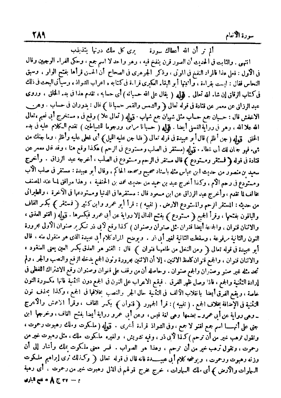 أَلَمْ تَرَ أَنَّ اللَّهَ أَعْطَاكَ سُورَةً يُرَى كُلُّ مَلِكٍ دُونَهَا يَتَذَبْذَبُ انْتَهَى وَالثَّابِتُ فِي الْحَدِيثِ أَنَّ الصُّورَ قَرْنٌ يَنْفُخُ فِيهِ وَهُوَ وَاحِدٌ لَا اسْمَ جَمْعٍ وَحَكَى الْفِرَاءُ الْوَجْهَيْنِ وَقَالَ فِي الْأَوَّلِ فَعَلَى هَذَا فَالْمُرَادُ النَّفْخُ فِي الْمَوْتَى وَذَكَرَ الْجَوْهَرِيُّ فِي الصِّحَاحِ أَنَّ الْحَسَنَ قَرَأَهَا بِفَتْحِ الْوَاوِ وَسَبَقَ النُّحَاسُ فَقَالَ لَيْسَتْ بِقِرَاءَةٍ وَأَثْبَتَهَا أَبُو الْبَقَاءِ الْعُكْبَرِيُّ قِرَاءَةً فِي كِتَابِهِ إِعْرَابِ الشَّوَاذِّ وَسَيَأْتِي الْبَحْثُ فِي ذَلِكَ فِي كِتَابِ الرِّقَاقِ إِنْ شَاءَ اللَّهُ تَعَالَى قَوْلُهُ يُقَالُ عَلَى اللَّهِ حُسْبَانُهُ أَيْ حِسَابُهُ تَقَدَّمَ هَذَا فِي بَدْءِ الْخَلْقِ وَرَوَى عَبْدُ الرَّزَّاقِ عَنْ مَعْمَرٍ عَنْ قَتَادَةَ فِي قَوْلِهِ تَعَالَى وَالشَّمْس وَالْقَمَر حسبانا قَالَ يَدُورَانِ فِي حِسَابٍ وَعَنِ الْأَخْفَشِ قَالَ حُسْبَانٌ جَمْعُ حِسَابٍ مِثْلُ شُهْبَانٍ جَمْعُ شِهَابٍ قَوْلُهُ تَعَالَى عَلَا وَقَعَ فِي مُسْتَخْرَجِ أَبِي نُعَيْمٍ تَعَالَى اللَّهُ عَلَا اللَّهُ وَهُوَ فِي رِوَايَةِ النَّسَفِيِّ أَيْضًا قَوْلُهُ حُسْبَانًا مَرَامِيَ وَرُجُومًا لِلشَّيَاطِينِ تَقَدَّمَ الْكَلَامُ عَلَيْهِ فِي بَدْءِ الْخَلْقِ قَوْلُهُ جَنَّ أَظْلَمَ قَالَ أَبُو عُبَيْدَةَ فِي قَوْلِهِ تَعَالَى فَلَمَّا جَنَّ عَلَيْهِ اللَّيْلُ أَيْ غَطَّى عَلَيْهِ وَأَظْلَمَ وَمَا جَنَّكَ مِنْ شَيْءٍ فَهُوَ جِنَانٌ لَكَ أَيْ غِطَاءٌ قَوْلُهُ مُسْتَقَرٌّ فِي الصُّلْبِ وَمُسْتَوْدَعٌ فِي الرَّحِمِ هَكَذَا وَقَعَ هُنَا وَقَدْ قَالَ مَعْمَرٌ عَنْ قَتَادَةَ فِي قَوْله فمستقر ومستودع قَالَ مُسْتَقَرٌّ فِي الرَّحِمِ وَمُسْتَوْدَعٌ فِي الصُّلْبِ أَخْرَجَهُ عَبْدُ الرَّزَّاقِ وَأَخْرَجَ سَعِيدُ بْنُ مَنْصُورٍ من حَدِيث بن عَبَّاسٍ مِثْلُهُ بِإِسْنَادٍ صَحِيحٍ وَصَحَّحَهُ الْحَاكِمُ وَقَالَ أَبُو عُبَيْدَةَ مُسْتَقَرٌّ فِي صُلْبِ الْأَبِ وَمُسْتَوْدَعٌ فِي رَحِمِ الْأُمِّ وَكَذَا أَخْرَجَ عَبْدُ بْنُ حُمَيْدٍ مِنْ حَدِيثِ مُحَمَّدِ بْنِ الْحَنَفِيَّةِ وَهَذَا مُوَافِقٌ لِمَا عِنْدَ الْمُصَنِّفِ مُخَالِفٌ لِمَا تَقَدَّمَ وَأخرج عبد الرَّزَّاق عَن بن مَسْعُودٍ قَالَ مُسْتَقَرُّهَا فِي الدُّنْيَا وَمُسْتَوْدَعُهَا فِي الْآخِرَةِ وَلِلطَّبَرَانِيِّ مِنْ حَدِيثِهِ الْمُسْتَقَرُّ الرَّحِمُ وَالْمُسْتَوْدَعُ الأَرْض تَنْبِيه قَرَأَ أَبُو عَمْرو وبن كَثِيرٍ فَمُسْتَقِرٌّ بِكَسْرِ الْقَافِ وَالْبَاقُونَ بِفَتْحِهَا وَقَرَأَ الْجَمِيعُ مُسْتَوْدَعٌ بِفَتْحِ الدَّالِ إِلَّا رِوَايَةً عَنْ أَبِي عَمْرٍو فَبِكَسْرِهَا قَوْلُهُ الْقِنْوُ الْعِذْقُ وَالِاثْنَانِ قِنْوَانِ وَالْجَمَاعَةُ أَيْضًا قِنْوَانٌ مثل صنْوَان وَصِنْوَانٍ كَذَا وَقَعَ لِأَبِي ذَرٍّ تَكْرِيرُ صِنْوَانٍ الْأُولَى مَجْرُورَةَ النُّونِ وَالثَّانِيَةُ مَرْفُوعَةٌ وَسَقَطَتِ الثَّانِيَةُ لِغَيْرِ أَبِي ذَرٍّ وَيُوَضِّحُ الْمُرَادَ كَلَامُ أَبِي عُبَيْدَةَ الَّذِي هُوَ مَنْقُولٌ مِنْهُ قَالَ أَبُو عُبَيْدَةَ فِي قَوْلِهِ تَعَالَى وَمِنَ النَّخْلِ مِنْ طلعها قنوان قَالَ الْقِنْوُ هُوَ الْعِذْقُ بِكَسْرِ الْعَيْنِ يَعْنِي الْعُنْقُودَ وَالِاثْنَانِ قِنْوَانِ وَالْجَمْعُ قِنْوَانٌ كَلَفْظِ الِاثْنَيْنِ إِلَّا أَنَّ الِاثْنَيْنِ مَجْرُورَةٌ وَنُونُ الْجَمْعِ يَدْخُلُهُ الرَّفْعُ وَالنَّصْبُ وَالْجَرُّ وَلَمْ نَجِدْ مِثْلَهُ غَيْرَ صِنْوٍ وَصِنْوَانِ وَالْجَمْعُ صِنْوَانٌ وَحَاصِلُهُ أَنَّ مَنْ وَقَفَ عَلَى قِنْوَانٍ وَصِنْوَانٍ وَقَعَ الِاشْتِرَاكُ اللَّفْظِيِّ فِي إِرَادَةِ التَّثْنِيَة