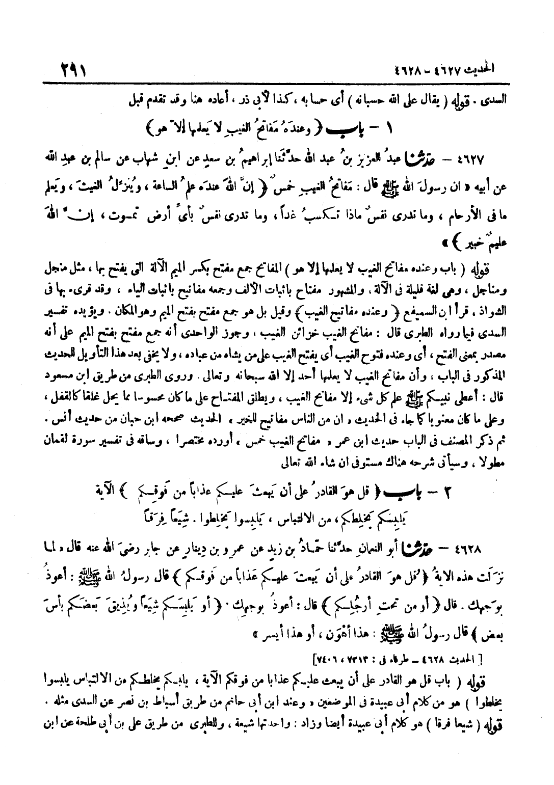 الْمَفَاتِحُ جَمْعُ مِفْتَحٍ بِكَسْرِ الْمِيمِ الْآلَةُ الَّتِي يُفْتَحُ بِهَا مِثْلُ مِنْجَلٍ وَمَنَاجِلٍ وَهِيَ لُغَةٌ قَلِيلَةٌ فِي الْآلَةِ وَالْمَشْهُورُ مِفْتَاحٌ بِإِثْبَاتِ الْأَلِفِ وَجَمْعُهُ مَفَاتِيحُ بِإِثْبَاتِ الْيَاءِ وَقَدْ قُرِئَ بِهَا فِي الشواذ قَرَأَ بن السَّمَيْفَعِ وَعِنْدَهُ مَفَاتِيحُ الْغَيْبِ وَقِيلَ بَلْ هُوَ جَمْعُ مَفْتَحٍ بِفَتْحِ الْمِيمِ وَهُوَ الْمَكَانُ وَيُؤَيِّدُهُ تَفْسِيرُ السُّدِّيِّ فِيمَا رَوَاهُ الطَّبَرِيُّ قَالَ مَفَاتِحُ الْغَيْبِ خَزَائِنُ الْغَيْبِ وَجَوَّزَ الْوَاحِدِيُّ أَنَّهُ جَمْعُ مَفْتَحٍ بِفَتْحِ الْمِيمِ عَلَى أَنَّهُ مَصْدَرٌ بِمَعْنَى الْفَتْحِ أَيْ وَعِنْدَهُ فُتُوحُ الْغَيْبِ أَيْ يَفْتَحُ الْغَيْبَ عَلَى مَنْ يَشَاءُ مِنْ عِبَادِهِ وَلَا يَخْفَى بُعْدَ هَذَا التَّأْوِيلِ لِلْحَدِيثِ الْمَذْكُورِ فِي الْبَابِ وَأَنَّ مَفَاتِحَ الْغَيْبِ لَا يَعْلَمُهَا أَحَدٌ إِلَّا اللَّهَ سُبْحَانَهُ وَتَعَالَى وَرَوَى الطَّبَرِيُّ مِنْ طَرِيق بن مَسْعُودٍ قَالَ أُعْطِيَ نَبِيُّكُمْ صَلَّى اللَّهُ عَلَيْهِ وَسَلَّمَ عِلْمَ كُلِّ شَيْءٍ إِلَّا مَفَاتِحَ الْغَيْبِ وَيُطْلَقُ الْمِفْتَاحُ عَلَى مَا كَانَ مَحْسُوسًا مِمَّا يَحِلُّ غَلْقًا كَالْقُفْلِ وَعَلَى مَا كَانَ مَعْنَوِيًّا كَمَا جَاءَ فِي الْحَدِيثِ إِنَّ مِنَ النَّاسِ مَفَاتِيح للخير الحَدِيث صَححهُ بن حِبَّانَ مِنْ حَدِيثِ أَنَسٍ ثُمَّ ذَكَرَ الْمُصَنِّفُ فِي الْبَاب حَدِيث بن عُمَرَ مَفَاتِحُ الْغَيْبِ خَمْسٌ أَوْرَدَهُ مُخْتَصَرًا وَسَاقَهُ فِي تَفْسِيرِ سُورَةِ لُقْمَانَ مُطَوَّلًا وَسَيَأْتِي شَرْحُهُ هُنَاكَ مُسْتَوْفًى إِنْ شَاءَ اللَّهُ تَعَالَى قَوْلُهُ بَابُ قُلْ هُوَ الْقَادِرُ عَلَى أَنْ يَبْعَثَ عَلَيْكُمْ عذَابا من فَوْقكُم الْآيَةَ يَلْبِسَكُمْ يَخْلِطَكُمْ مِنَ الِالْتِبَاسِ يَلْبِسُوا يَخْلِطُوا هُوَ مِنْ كَلَامِ أَبِي عُبَيْدَةَ فِي الْمَوْضِعَيْنِ وَعند بن أَبِي حَاتِمٍ مِنْ طَرِيقِ أَسْبَاطَ بْنِ نَصْرٍ عَنِ السُّدِّيِّ مِثْلُهُ