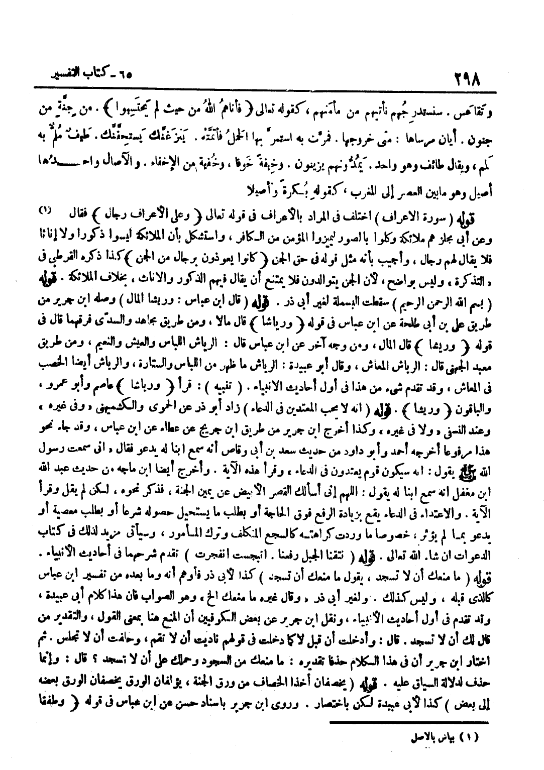 اخْتُلِفَ فِي الْمُرَادِ بِالْأَعْرَافِ فِي قَوْلِهِ تَعَالَى وَعَلَى الْأَعْرَافِ رِجَالٌ فَقَالَ وَعَنْ أَبِي مِجْلَزٍ هُمْ مَلَائِكَةٌ وُكِّلُوا بِالصُّورِ لِيُمَيِّزُوا الْمُؤْمِنَ مِنَ الْكَافِرِ وَاسْتُشْكِلَ بِأَنَّ الْمَلَائِكَةَ لَيْسُوا ذُكُورًا وَلَا إِنَاثًا فَلَا يُقَالُ لَهُمْ رِجَالٌ وَأُجِيبَ بِأَنَّهُ مِثْلُ قَوْلِهِ فِي حَقِّ الْجِنّ كَانُوا يعوذون بِرِجَال من الْجِنّ كَذَا ذَكَرَهُ الْقُرْطُبِيُّ فِي التَّذْكِرَةِ وَلَيْسَ بِوَاضِحٍ لِأَنَّ الْجِنَّ يَتَوَالَدُونَ فَلَا يَمْتَنِعُ أَنْ يُقَالَ فِيهِمُ الذُّكُورُ وَالْإِنَاثُ بِخِلَافِ الْمَلَائِكَةِ قَوْلُهُ بِسْمِ اللَّهِ الرَّحْمَنِ الرَّحِيمِ سَقَطَتِ الْبَسْمَلَةُ لِغَيْرِ أبي ذَر قَوْله قَالَ بن عَبَّاس وريشا المَال وَصله بن جَرِيرٍ مِنْ طَرِيقِ عَلِيِّ بْنِ أَبِي طَلْحَةَ عَنِ بن عَبَّاسٍ فِي قَوْلِهِ وَرِيَاشًا قَالَ مَالًا وَمِنْ طَرِيقِ مُجَاهِدٍ وَالسُّدِّيِّ فَرَّقَهُمَا قَالَ فِي قَوْلِهِ وَرِيشًا قَالَ الْمَالُ وَمِنْ وَجْهٍ آخَرَ عَنِ بن عَبَّاسٍ قَالَ الرِّيَاشُ اللِّبَاسُ وَالْعَيْشُ وَالنَّعِيمُ وَمِنْ طَرِيقِ مَعْبَدِ الْجُهَنِيِّ قَالَ الرِّيَاشُ الْمَعَاشُ وَقَالَ أَبُو عُبَيْدَةَ الرِّيَاشُ مَا ظَهَرَ مِنَ اللِّبَاسِ وَالسِّتَارَةِ وَالرِّيَاشُ أَيْضًا الْخِصْبُ فِي الْمَعَاشِ وَقَدْ تَقَدَّمَ شَيْءٌ مِنْ هَذَا فِي أَوَّلِ أَحَادِيثِ الْأَنْبِيَاءِ تَنْبِيهٌ قَرَأَ وَرِيَاشًا عَاصِمٌ وَأَبُو عَمْرٍو وَالْبَاقُونَ وَرِيشًا قَوْلُهُ إِنَّهُ لَا يُحِبُّ الْمُعْتَدِينَ فِي الدُّعَاءِ زَادَ أَبُو ذَرٍّ عَنِ الْحَمَوِيِّ وَالْكُشْمِيهَنِيِّ وَفِي غَيْرِهِ وَعِنْدَ النَّسَفِيِّ وَلَا فِي غَيره وَكَذَا أخرج بن جرير من طَرِيق بن جريج عَن عَطاء عَن بن عَبَّاسٍ وَقَدْ جَاءَ نَحْوَ هَذَا مَرْفُوعًا أَخْرَجَهُ أَحْمَدُ وَأَبُو دَاوُدَ مِنْ حَدِيثِ سَعْدِ بْنِ أَبِي وَقَّاصٍ أَنَّهُ سَمِعَ ابْنًا لَهُ يَدْعُو فَقَالَ إِنِّي سَمِعْتُ رَسُولَ اللَّهِ صَلَّى اللَّهُ عَلَيْهِ وَسَلَّمَ يَقُولُ إِنَّهُ سَيَكُونُ قَوْمٌ يَعْتَدُونَ فِي الدُّعَاءِ وَقَرَأَ هَذِهِ الْآيَةَ وَأَخْرَجَ أَيْضًا بن مَاجَهْ مِنْ حَدِيثِ عَبْدِ اللَّهِ بْنِ مُغَفَّلٍ أَنَّهُ سَمِعَ ابْنًا لَهُ يَقُولُ اللَّهُمَّ إِنِّي أَسَالُكَ الْقَصْرَ الْأَبْيَضَ عَنْ يَمِينِ الْجَنَّةِ فَذَكَرَ نَحْوَهُ لَكِنْ لَمْ يَقُلْ وَقَرَأَ الْآيَةَ وَالِاعْتِدَاءُ فِي الدُّعَاءِ يَقَعُ بِزِيَادَةِ الرَّفْعِ فَوْقَ الْحَاجَةِ أَوْ بِطَلَبِ مَا يَسْتَحِيلُ حُصُولُهُ شَرْعًا أَوْ بِطَلَبِ مَعْصِيَةٍ أَوْ يَدْعُو بِمَا لَمْ يُؤْثَرْ خُصُوصًا مَا وَرَدَتْ كَرَاهَتُهُ كَالسَّجْعِ الْمُتَكَلَّفِ وَتَرْكِ الْمَأْمُورِ وَسَيَأْتِي مَزِيدٌ لِذَلِكَ فِي كِتَابِ الدَّعَوَاتِ إِنْ شَاءَ اللَّهُ تَعَالَى قَوْلُهُ نَتَقْنَا الْجَبَلَ رَفَعْنَا انْبَجَسَتِ انْفَجَرَتْ تَقَدَّمَ شَرْحُهُمَا فِي أَحَادِيثِ الْأَنْبِيَاءِ قَوْلُهُ مَا مَنَعَكَ أَنْ لَا تَسْجُدَ يَقُولُ مَا مَنَعَكَ أَنْ تَسْجُدَ كَذَا لِأَبِي ذَرٍّ فَأَوْهَمَ أَنَّهُ وَمَا بَعْدَهُ مِنْ تَفْسِيرِ بن عَبَّاسٍ كَالَّذِي قَبْلَهُ وَلَيْسَ كَذَلِكَ وَلِغَيْرِ أَبِي ذَرٍّ وَقَالَ غَيْرُهُ مَا مَنَعَكَ إِلَخْ وَهُوَ الصَّوَابُ فَإِنَّ هَذَا كَلَامَ أَبِي عُبَيْدَةَ وَقَدْ تقدم فِي أول أَحَادِيث الْأَنْبِيَاء وَنقل بن جَرِيرٍ عَنْ بَعْضِ الْكُوفِيِّينَ أَنَّ الْمَنْعَ هُنَا بِمَعْنَى الْقَوْلِ وَالتَّقْدِيرُ مَنْ قَالَ لَكَ أَنْ لَا تَسْجُدَ قَالَ وَأُدْخِلَتْ أَنْ قَبْلَ لَا كَمَا دخلت فِي قَوْلهم ناديت أَن لاتقم وَحلفت أَن لَا تجْلِس ثمَّ أخْتَار بن جَرِيرٍ أَنَّ فِي هَذَا 