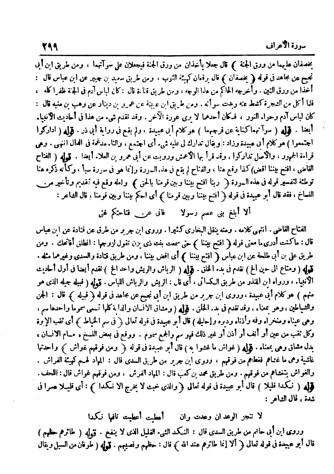 وطفقا يخصفان عَلَيْهِمَا من ورق الْجنَّة قَالَ جَعَلَا يَأْخُذَانِ مِنْ وَرَقِ الْجَنَّةِ فَيَجْعَلَانِ على سوآتهما وَمن طَرِيق بن أَبِي نَجِيحٍ عَنْ مُجَاهِدٍ فِي قَوْلِهِ يَخْصِفَانِ قَالَ يُرَقِّعَانِ كَهَيْئَةِ الثَّوْبِ وَمِنْ طَرِيقِ سَعِيدِ بن جُبَير عَن بن عَبَّاسٍ قَالَ أَخَذَا مِنْ وَرَقِ التِّينِ وَأَخْرَجَهُ الْحَاكِمُ مِنْ هَذَا الْوَجْهِ وَمِنْ طَرِيقِ قَتَادَةَ قَالَ كَانَ لِبَاسُ آدَمَ فِي الْجَنَّةِ ظُفْرًا كُلَّهُ فَلَمَّا أَكَلَ مِنَ الشَّجَرَةِ كُشِطَ عَنْهُ وبدت سوأته وَمن طَرِيق بْنِ عُيَيْنَةَ عَنْ عَمْرِو بْنِ دِينَارٍ عَنْ وَهْبِ بْنِ مُنَبِّهِ قَالَ كَانَ لِبَاسُ آدَمَ وَحَوَّاءَ النُّورَ فَكَانَ أَحَدُهُمَا لَا يَرَى عَوْرَةَ الْآخَرِ وَقَدْ تَقَدَّمَ شَيْءٌ مِنْ هَذَا فِي أَحَادِيثِ الْأَنْبِيَاءِ أَيْضًا قَوْلُهُ سَوْآتُهُمَا كِنَايَةٌ عَنْ فَرْجَيْهِمَا هُوَ كَلَامُ أَبِي عُبَيْدَةَ وَلَمْ يَقَعْ فِي رِوَايَةِ أَبِي ذَرٍّ قَوْلُهُ ادَّارَكُوا اجْتَمَعُوا هُوَ كَلَامُ أَبِي عُبَيْدَةَ وَزَادَ وَيُقَالُ تَدَارَكَ لِي عَلَيْهِ شَيْءٌ أَيِ اجْتَمَعَ وَالتَّاءُ مُدْغَمَةٌ فِي الدَّالِ انْتَهَى وَهِيَ قِرَاءَةُ الْجُمْهُورِ وَالْأَصْلُ تَدَارَكُوا وَقَدْ قَرَأَ بِهَا الْأَعْمَشُ وَرُوِيَتْ عَنْ أَبِي عَمْرِو بْنِ الْعَلَاءِ أَيْضًا قَوْلُهُ الْفَتَّاحُ الْقَاضِي افْتَحْ بَيْنَنَا اقْضِ كَذَا وَقَعَ هُنَا وَالْفَتَّاحُ لَمْ يَقَعْ فِي هَذِهِ السُّورَةِ وَإِنَّمَا هُوَ فِي سُورَةِ سَبَأٍ وَكَأَنَّهُ ذَكَرَهُ هُنَا تَوْطِئَةً لِتَفْسِيرِ قَوْلِهِ فِي هَذِهِ السُّورَةِ رَبَّنَا افْتَحْ بَيْننَا وَبَين قَومنَا بِالْحَقِّ وَلَعَلَّهُ وَقَعَ فِيهِ تَقْدِيمٌ وَتَأْخِيرٌ مِنَ النُّسَّاخِ فَقَدْ قَالَ أَبُو عُبَيْدَةَ فِي قَوْلِهِ افْتَحْ بَيْننَا وَبَين قَومنَا أَيِ احْكُمْ بَيْنَنَا وَبَيْنَ قَوْمِنَا قَالَ الشَّاعِرُ أَلَا أَبْلِغْ بَنِي عَصْمٍ رَسُولَا فَإِنِّي عَنْ فِتَاحَتِكُمْ غَنِيٌّ الْفَتَّاحُ الْقَاضِي انْتَهَى كَلَامُهُ وَمِنْهُ ينْقل البُخَارِيّ كثيرا وروى بن جرير من طرق عَن قَتَادَة عَن بن عَبَّاسٍ قَالَ مَا كُنْتُ أَدْرِي مَا مَعْنَى قَوْلِهِ افْتَحْ بَيْنَنَا حَتَّى سَمِعْتُ بِنْتَ ذِي يَزَنَ تَقُولُ لِزَوْجِهَا انْطَلِقْ أُفَاتِحْكَ وَمِنْ طَرِيقِ عَلِيِّ بْنِ أَبِي طَلْحَةَ عَنِ بْنِ عَبَّاسٍ افْتَحْ بَيْنَنَا أَيِ اقْضِ بَيْنَنَا وَمَنْ طَرِيقِ قَتَادَةَ وَالسُّدِّيِّ وَغَيْرِهِمَا مِثْلُهُ قَوْلُهُ وَمَتَاعٌ إِلَى حِينٍ إِلَخْ تَقَدَّمَ فِي بَدْءِ الْخَلْقِ قَوْلُهُ الرِّيَاشُ وَالرِّيشُ وَاحِدٌ إِلَخْ تَقَدَّمَ أَيْضًا فِي أول أَحَادِيث الْأَنْبِيَاء وَرَوَاهُ بن الْمُنْذِرِ مِنْ طَرِيقِ الْكِسَائِيِّ أَيْ قَالَ الرِّيشُ وَالرِّيَاشُ اللِّبَاسُ قَوْلُهُ قَبِيلُهُ جِيلُهُ الَّذِي هُوَ مِنْهُمْ هُوَ كَلَام أبي عُبَيْدَة وروى بن جرير من طَرِيق بن أَبِي نَجِيحٍ عَنْ مُجَاهِدٍ فِي قَوْلِهِ قَبِيلُهُ قَالَ الْجِنُّ وَالشَّيَاطِينُ وَهُوَ بِمَعْنَاهُ وَقَدْ تَقَدَّمَ فِي بَدْءِ الْخَلْقِ قَوْلُهُ وَمَشَاقُّ الْإِنْسَانِ وَالدَّابَّةِ كُلُّهَا تُسَمَّى سُمُومًا وَاحِدُهَا سَمٌّ وَهِيَ عَيْنَاهُ وَمَنْخِرَاهُ وَفَمُهُ وَأُذُنَاهُ وَدُبُرُهُ وَإِحْلِيلُهُ قَالَ أَبُو عُبَيْدَةَ فِي قَوْلِهِ تَعَالَى فِي سَمِّ الْخِيَاطِ أَيْ ثُقْبِ الْإِبْرَةِ وَكُلُّ ثُقْبٍ مِنْ عَيْنٍ أَوْ أَنْفٍ أَوْ أُذُنٍ أَوْ غَيْرَ ذَلِكَ فَهُوَ سَمٌّ وَالْجَمْعُ سُمُومٌ وَوَقَعَ فِي بَعْضِ النُّسَخِ مَسَامُّ الْإِنْسَانِ بَدَلَ مَشَاقِّ وَهِيَ بِمَعْنَاهُ قَوْلُهُ غَوَاشٍ مَا غُشُّوا بِهِ قَالَ أَبُو عُبَيْدَة فِي قَوْله وَمن فَوْقهم غواش وَاحِد