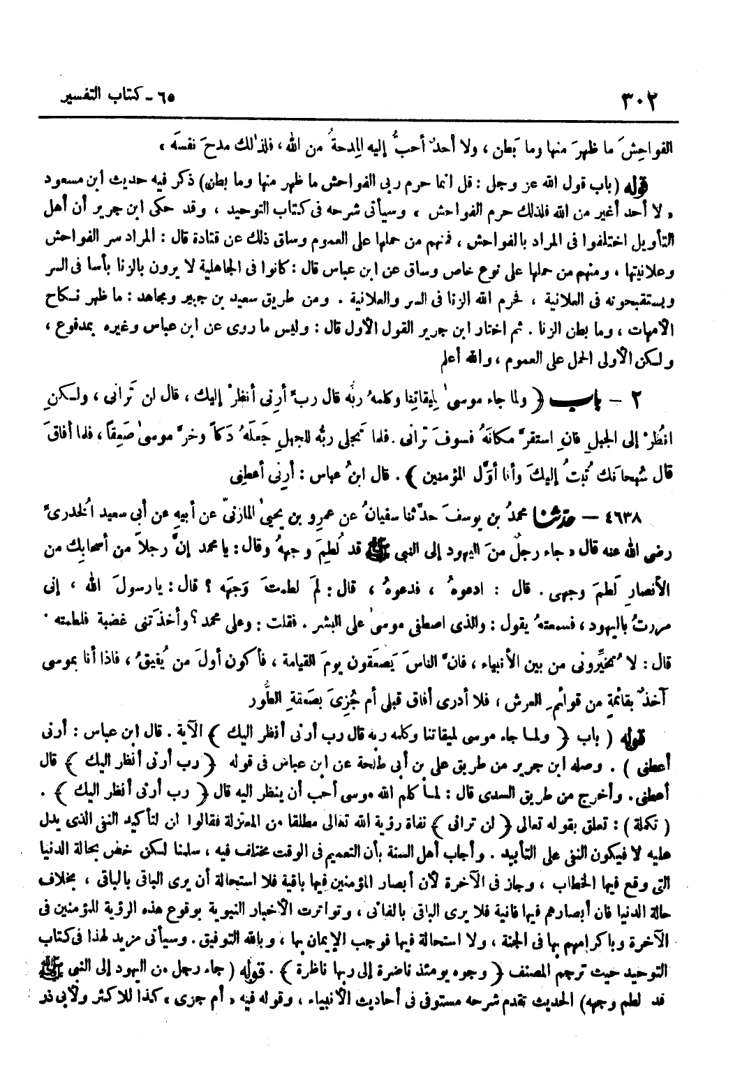 ذكر فِيهِ حَدِيث بن مَسْعُودٍ لَا أَحَدَ أَغْيَرُ مِنَ اللَّهِ فَلِذَلِكَ حَرَّمَ الْفَوَاحِشَ وَسَيَأْتِي شَرْحُهُ فِي كِتَابِ التَّوْحِيدِ وَقد حكى بن جَرِيرٍ أَنَّ أَهْلَ التَّأْوِيلِ اخْتَلَفُوا فِي الْمُرَادِ بِالْفَوَاحِشِ فَمِنْهُمْ مَنْ حَمَلَهَا عَلَى الْعُمُومِ وَسَاقَ ذَلِكَ عَنْ قَتَادَةَ قَالَ الْمُرَادُ سِرُّ الْفَوَاحِشِ وَعَلَانِيَتُهَا وَمِنْهُمْ مَنْ حَمْلَهَا عَلَى نَوْعٍ خَاصٍّ وسَاق عَن بن عَبَّاسٍ قَالَ كَانُوا فِي الْجَاهِلِيَّةِ لَا يَرَوْنَ بِالزِّنَا بَأْسًا فِي السِّرِّ وَيَسْتَقْبِحُونَهُ فِي الْعَلَانِيَةِ فَحَرَّمَ اللَّهُ الزِّنَا فِي السِّرِّ وَالْعَلَانِيَةِ وَمِنْ طَرِيقِ سَعِيدِ بْنِ جُبَيْرٍ وَمُجَاهِدٍ مَا ظَهَرَ نِكَاحَ الْأُمَّهَاتِ وَمَا بَطَنَ الزِّنَا ثُمَّ اخْتَارَ بن جَرِيرٍ الْقَوْلَ الْأَوَّلَ قَالَ وَلَيْسَ مَا رُوِيَ عَن بن عَبَّاسٍ وَغَيْرِهِ بِمَدْفُوعٍ وَلَكِنَّ الْأَوْلَى الْحَمْلُ عَلَى الْعُمُوم وَالله أعلم قَوْلُهُ بَابُ وَلَمَّا جَاءَ مُوسَى لِمِيقَاتِنَا وَكَلَّمَهُ ربه قَالَ رب أَرِنِي أنظر إِلَيْك الْآيَة قَالَ بن عَبَّاس أَرِنِي أَعْطِنِي وَصله بن جَرِيرٍ مِنْ طَرِيقِ عَلِيِّ بْنِ أَبِي طَلْحَةَ عَنِ بن عَبَّاسٍ فِي قَوْلِهِ رَبِّ أَرِنِي أَنْظُرْ إِلَيْكَ قَالَ أَعْطِنِي وَأَخْرَجَ مِنْ طَرِيقِ السُّدِّيِّ قَالَ لَمَّا كَلَّمَ اللَّهُ مُوسَى أَحَبَّ أَنْ يَنْظُرَ إِلَيْهِ قَالَ رب أَرِنِي أنظر إِلَيْك تَكْمِلَة تعلق بقوله تَعَالَى لن تراني نَفَاةُ رُؤْيَةِ اللَّهِ تَعَالَى مُطْلَقًا مِنَ الْمُعْتَزِلَةِ فَقَالُوا لَنْ لِتَأْكِيدِ النَّفْيِ الَّذِي يَدُلُّ عَلَيْهِ لَا فَيَكُونُ النَّفْيُ عَلَى التَّأْيِيدِ وَأَجَابَ أَهْلُ السُّنَّةِ بِأَنَّ التَّعْمِيمَ فِي الْوَقْتِ مُخْتَلَفٌ فِيهِ سَلَّمْنَا لَكِنْ خُصَّ بِحَالَةِ الدُّنْيَا الَّتِي وَقَعَ فِيهَا الْخِطَابُ وَجَازَ فِي الْآخِرَةِ لِأَنَّ أَبْصَارَ الْمُؤْمِنِينَ فِيهَا بَاقِيَةٌ فَلَا اسْتِحَالَةَ أَنْ يُرَى الْبَاقِي بِالْبَاقِي بِخِلَافِ حَالَةِ الدُّنْيَا فَإِنَّ أَبْصَارَهُمْ فِيهَا فَانِيَةٌ فَلَا يُرَى الْبَاقِي بِالْفَانِي وَتَوَاتَرَتِ الْأَخْبَارُ النَّبَوِيَّةُ بِوُقُوعِ هَذِهِ الرُّؤْيَةِ لِلْمُؤْمِنِينَ فِي الْآخِرَةِ وَبِإِكْرَامِهِمْ بِهَا فِي الْجَنَّةِ وَلَا اسْتِحَالَةَ فِيهَا فَوَجَبَ الْإِيمَانُ بِهَا وَبِاللَّهِ التَّوْفِيقِ وَسَيَأْتِي مَزِيدٌ لِهَذَا فِي كِتَابِ التَّوْحِيدِ حَيْثُ تَرْجَمَ الْمُصَنِّفُ وُجُوهٌ يَوْمَئِذٍ نَاضِرَةٌ إِلَى رَبِّهَا نَاظِرَةٌ