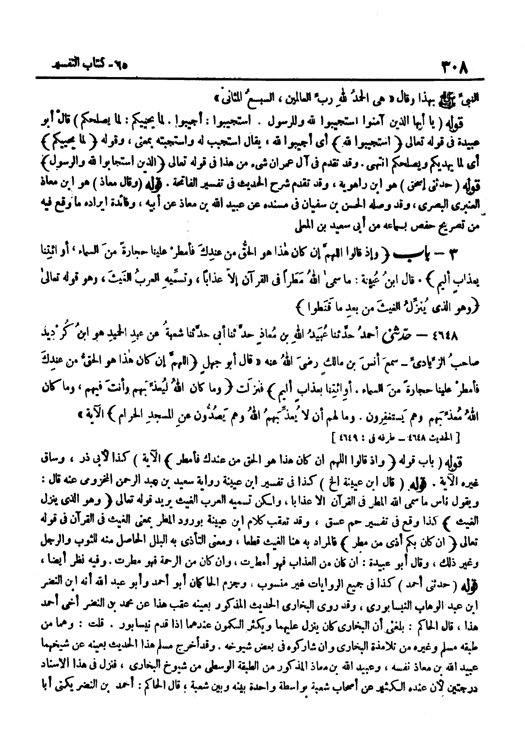 [4648] قَوْلُهُ حَدَّثَنِي أَحْمَدُ كَذَا فِي جَمِيعِ الرِّوَايَاتِ غَيْرِ مَنْسُوبٍ وَجَزَمَ الْحَاكِمَانِ أَبُو أَحْمَدَ وَأَبُو عَبْدِ اللَّهِ أَنَّهُ بن النَّضِرِ بْنِ عَبْدِ الْوَهَّابِ النَّيْسَابُورِيُّ وَقَدْ رَوَى الْبُخَارِيُّ الْحَدِيثَ الْمَذْكُورَ بِعَيْنِهِ عَقِبَ هَذَا عَنْ مُحَمَّدِ بْنِ النَّضِرِ أَخِي أَحْمَدَ هَذَا قَالَ الْحَاكِمُ بَلَغَنِي أَنَّ الْبُخَارِيَّ كَانَ يَنْزِلُ عَلَيْهِمَا وَيُكْثِرُ الْكُمُونَ عِنْدَهُمَا إِذَا قَدِمَ نَيْسَابُورَ قُلْتُ وَهُمَا مِنْ طَبَقَةِ مُسْلِمٍ وَغَيْرِهِ مِنْ تَلَامِذَةِ الْبُخَارِيِّ وَإِنْ شَارَكُوهُ فِي بَعْضِ شُيُوخِهِ وَقَدْ أَخْرَجَ مُسْلِمٌ هَذَا الْحَدِيثَ بِعَيْنِهِ عَنْ شَيْخِهِمَا عُبَيْدِ اللَّهِ بْنِ مُعَاذٍ نَفْسِهِ وَعُبَيْدُ اللَّهِ بْنِ مُعَاذٍ الْمَذْكُورُ مِنَ الطَّبَقَةِ الْوُسْطَى مِنْ شُيُوخِ الْبُخَارِيِّ فَنَزَلَ فِي هَذَا الْإِسْنَادِ دَرَجَتَيْنِ لِأَنَّ عِنْدَهُ الْكَثِيرَ عَنْ أَصْحَابِ شُعْبَةَ بِوَاسِطَةِ وَاحِدَةِ بَيْنَهُ وَبَيْنَ شُعْبَةَ قَالَ الْحَاكِمُ أَحْمَدُ بْنُ النَّضِرِ يُكَنَّى أَبَا