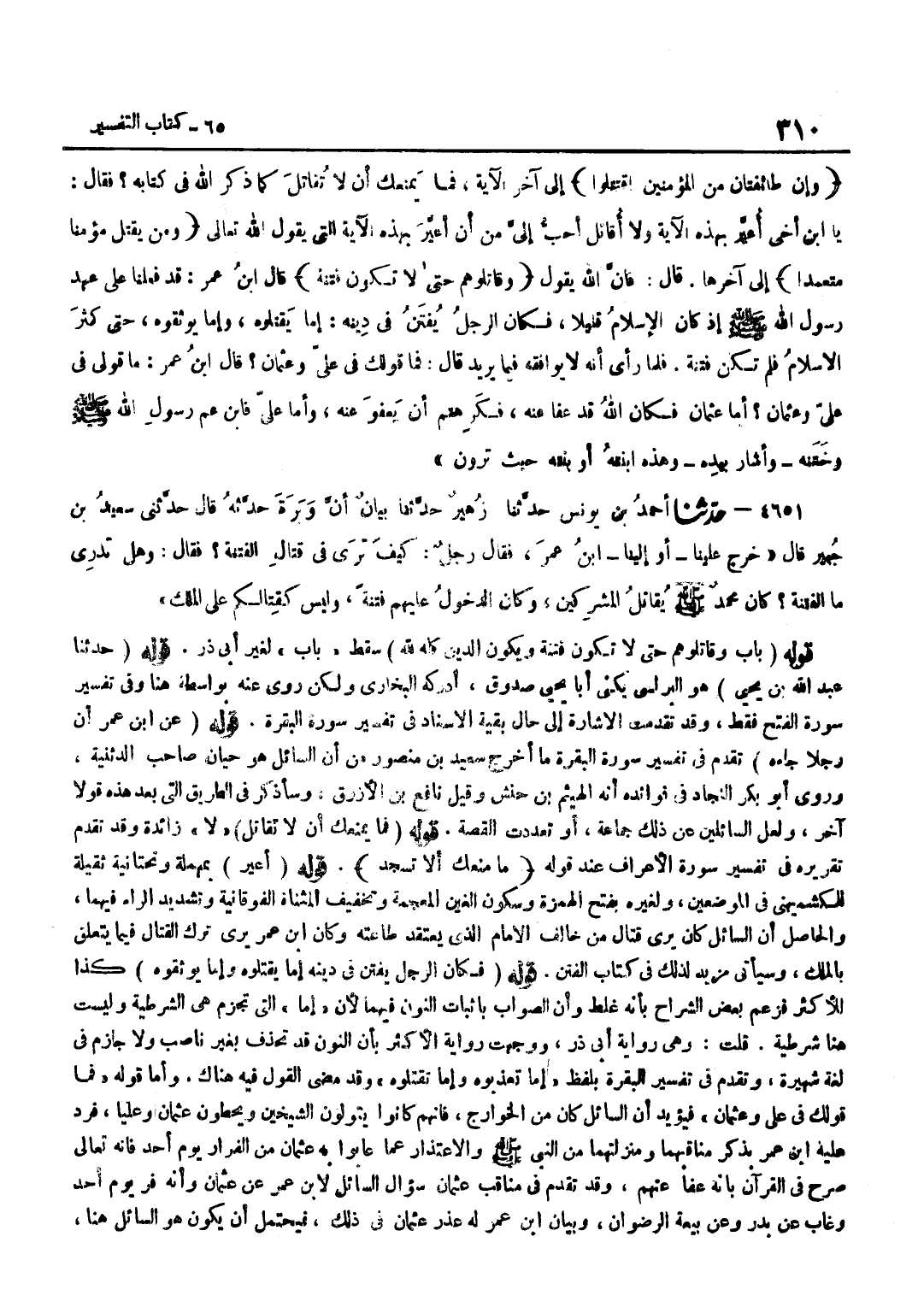 [4650] قَوْلُهُ حَدَّثَنَا عَبْدُ اللَّهِ بْنِ يَحْيَى هُوَ الْبُرُلُّسِيُّ يُكَنَّى أَبَا يَحْيَى صَدُوقٌ أَدْرَكَهُ الْبُخَارِيُّ وَلَكِنْ رَوَى عَنْهُ بِوَاسِطَةٍ هُنَا وَفِي تَفْسِيرِ سُورَةِ الْفَتْحِ فَقَطْ وَقَدْ تَقَدَّمَتِ الْإِشَارَةُ إِلَى حَالِ بَقِيَّةِ الْإِسْنَادِ فِي تَفْسِيرِ سُورَةِ الْبَقَرَةِ قَوْلُهُ عَنِ بن عُمَرَ أَنَّ رَجُلًا جَاءَهُ تَقَدَّمَ فِي تَفْسِيرِ سُورَةِ الْبَقَرَةِ مَا أَخْرَجَ سَعِيدُ بْنُ مَنْصُورٍ مِنْ أَنَّ السَّائِلَ هُوَ حَيَّانُ صَاحِبُ الدِّثِنِّيَّةِ وَرَوَى أَبُو بَكْرٍ النَّجَّادُ فِي فَوَائِدِهِ أَنَّهُ الْهَيْثَمُ بْنُ حَنَشٍ وَقِيلَ نَافِعُ بْنُ الْأَزْرَقِ وَسَأَذْكُرُ فِي الطَّرِيقِ الَّتِي بَعْدَ هَذِهِ قَوْلًا آخَرَ وَلَعَلَّ السَّائِلِينَ عَنْ ذَلِكَ جَمَاعَةٌ أَوْ تَعَدَّدَتِ الْقِصَّةُ قَوْلُهُ فَمَا يَمْنَعُكَ أَنْ لَا تُقَاتِلَ لَا زَائِدَةٌ وَقَدْ تَقَدَّمَ تَقْرِيرُهُ فِي تَفْسِيرِ سُورَةِ الْأَعْرَافِ عِنْدَ قَوْلِهِ مَا مَنَعَكَ أَلا تسْجد قَوْله أعير بِمُهْمَلَةٍ وَتَحْتَانِيَّةٍ ثَقِيلَةٍ لِلْكُشْمِيهَنِيِّ فِي الْمَوْضِعَيْنِ وَلِغَيْرِهِ بِفَتْحِ الْهَمْزَةِ وَسُكُونِ الْغَيْنِ الْمُعْجَمَةِ وَتَخْفِيفِ الْمُثَنَّاةِ الْفَوْقَانِيَّةِ وَتَشْدِيدِ الرَّاءِ فِيهِمَا وَالْحَاصِلُ أَنَّ السَّائِلَ كَانَ يَرَى قِتَالَ مَنْ خَالَفَ الْإِمَامَ الَّذِي يعْتَقد طَاعَته وَكَانَ بن عُمَرَ يَرَى تَرْكَ الْقِتَالِ فِيمَا يَتَعَلَّقُ بِالْمُلْكِ وَسَيَأْتِي مَزِيدٌ لِذَلِكَ فِي كِتَابِ الْفِتَنِ قَوْلُهُ فَكَانَ الرَّجُلُ يُفْتَنُ فِي دِينِهِ إِمَّا يَقْتُلُوهُ وَإِمَّا يُوثِقُوهُ كَذَا لِلْأَكْثَرِ فَزَعَمَ بَعْضُ الشُّرَّاحِ بِأَنَّهُ غَلَطٌ وَأَنَّ الصَّوَابَ بِإِثْبَاتِ النُّونِ فِيهِمَا لِأَنَّ إِمَّا الَّتِي تَجْزِمُ هِيَ الشَّرْطِيَّةُ وَلَيْسَتْ هُنَا شَرْطِيَّةٌ قُلْتُ وَهِيَ رِوَايَةُ أَبِي ذَرٍّ وَوُجِّهَتْ رِوَايَةُ الْأَكْثَرِ بِأَنَّ النُّونَ قَدْ تُحْذَفُ بِغَيْرِ نَاصِبٍ وَلَا جَازِمَ فِي لُغَةٍ شَهِيرَةٍ وَتَقَدَّمَ فِي تَفْسِيرِ الْبَقَرَةِ بِلَفْظِ إِمَّا تُعَذِّبُوهُ وَإِمَّا تَقْتُلُوهُ وَقَدْ مَضَى الْقَوْلُ فِيهِ هُنَاكَ وَأَمَّا قَوْلُهُ فَمَا قَوْلُكَ فِي عَلِيٍّ وَعُثْمَانَ فيؤيد أَن السَّائِل كَانَ مِنَ الْخَوَارِجِ فَإِنَّهُمْ كَانُوا يَتَوَلَّوْنَ الشَّيْخَيْنِ وَيَحُطُّونَ عُثْمَان وعليا فَرد عَلَيْهِ بن عُمَرَ بِذِكْرِ مَنَاقِبِهِمَا وَمَنْزِلَتِهِمَا مِنَ النَّبِيِّ صَلَّى اللَّهُ عَلَيْهِ وَسَلَّمَ وَالِاعْتِذَارُ عَمَّا عَابُوا بِهِ عُثْمَانَ مِنَ الْفِرَارِ يَوْمَ أُحُدٍ فَإِنَّهُ تَعَالَى صَرَّحَ فِي الْقُرْآنِ بِأَنَّهُ عَفَا عَنْهُمْ وَقَدْ تَقَدَّمَ فِي مَنَاقِبِ عُثْمَانَ سُؤَالُ السَّائِلِ لِابْنِ عُمَرَ عَنْ عُثْمَانَ وَأَنَّهُ فَرَّ يَوْمَ أُحُدٍ وَغَابَ عَنْ بَدْرٍ وَعَنْ بَيْعَةِ الرِّضْوَانِ وَبَيَانُ بن عُمَرَ لَهُ عُذْرُ عُثْمَانَ فِي ذَلِكَ فَيَحْتَمِلُ أَنْ يَكُونَ هُوَ السَّائِلَ هُنَا