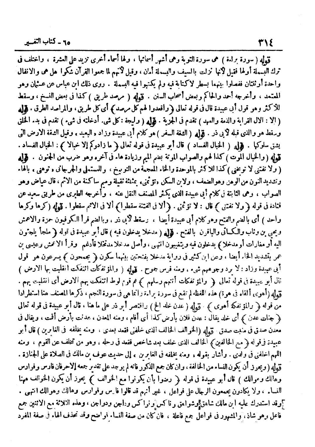 وَهِيَ أَشْهَرُ أَسْمَائِهَا وَلَهَا أَسْمَاءٌ أُخْرَى تَزِيدُ عَلَى الْعَشَرَةِ وَاخْتُلِفَ فِي تَرْكِ الْبَسْمَلَةِ أَوَّلَهَا فَقِيلَ لِأَنَّهَا نَزَلَتْ بِالسَّيْفِ وَالْبَسْمَلَةُ أَمَانٌ وَقِيلَ لِأَنَّهُمْ لَمَّا جَمَعُوا الْقُرْآنَ شَكُّوا هَلْ هِيَ وَالْأَنْفَالُ وَاحِدَة أَو اثْنَتَانِ فَفَصَلُوا بَيْنَهُمَا بِسَطْرٍ لَا كِتَابَةَ فِيهِ وَلَمْ يكتبوا فِيهِ الْبَسْمَلَة روى ذَلِك بن عَبَّاسٍ عَنْ عُثْمَانَ وَهُوَ الْمُعْتَمَدُ وَأَخْرَجَهُ أَحْمَدُ وَالْحَاكِمُ وَبَعْضُ أَصْحَابِ السُّنَنِ قَوْلُهُ مَرْصَدٍ طَرِيقٍ كَذَا فِي بَعْضِ النُّسَخِ وَسَقَطَ لِلْأَكْثَرِ وَهُوَ قَوْلُ أَبِي عُبَيْدَةَ قَالَ فِي قَوْلِهِ تَعَالَى واقعدوا لَهُم كل مرصد أَيْ كُلُّ طَرِيقٍ وَالْمَرَاصِدُ الطُّرُقُ قَوْلُهُ إِلًّا الْإِلُّ الْقَرَابَةُ وَالذِّمَّةُ وَالْعَهْدُ تَقَدَّمَ فِي الْجِزْيَةِ قَوْلُهُ وَلِيجَةً كُلُّ شَيْءٍ أَدْخَلْتَهُ فِي شَيْءٍ تَقَدَّمَ فِي بَدْءِ الْخَلْقِ وَسَقَطَ هُوَ وَالَّذِي قَبْلَهُ لِأَبِي ذَرٍّ قَوْلُهُ الشُّقَّةُ السَّفَرُ هُوَ كَلَامُ أَبِي عُبَيْدَةَ وَزَادَ الْبَعِيدُ وَقِيلَ الشُّقَّةُ الْأَرْضُ الَّتِي يَشُقُّ سُلُوكُهَا قَوْلُهُ الْخَبَالُ الْفَسَادُ قَالَ أَبُو عُبَيْدَةَ فِي قَوْلِهِ تَعَالَى مَا زادوكم إِلَّا خبالا الْخَبَالُ الْفَسَادُ قَوْلُهُ وَالْخَبَالُ الْمَوْتُ كَذَا لَهُمْ وَالصَّوَابُ الْمُوتَةُ بِضَمِّ الْمِيمِ وَزِيَادَةِ هَاءٍ فِي آخِرِهِ وَهُوَ ضَرْبٌ مِنَ الْجُنُونِ قَوْلُهُ وَلَا تَفْتِنِّي لَا تُوَبِّخْنِي كَذَا لِلْأَكْثَرِ بِالْمُوَحَّدَةِ وَالْخَاءُ الْمُعْجَمَةِ مِنَ التَّوْبِيخِ وَلِلْمُسْتَمْلِيِّ وَالْجُرْجَانِيِّ تُوَهِّنِّي بِالْهَاءِ وَتَشْدِيدِ النُّونِ مِنَ الْوَهَنِ وَهُوَ الضَّعْفُ وَلِابْنِ السَّكَنِ تُؤَثِّمْنِي بِمُثَلَّثَةٍ ثَقِيلَةٍ وَمِيمٍ سَاكِنَةٍ مِنَ الْإِثْمِ قَالَ عِيَاضٌ وَهُوَ الصَّوَابُ وَهِيَ الثَّابِتَةُ فِي كَلَامِ أَبِي عُبَيْدَةَ الَّذِي يُكْثِرُ الْمُصَنِّفُ النَّقْلَ عَنْهُ وَأَخْرَجَهُ الطَّبَرِيُّ مِنْ طَرِيقِ سَعِيدٍ عَنْ قَتَادَةَ فِي قَوْلِهِ وَلَا تَفْتِنِّي قَالَ لَا تؤثمني أَلا فِي الْفِتْنَة سقطوا أَلَا فِي الْإِثْمِ سَقَطُوا قَوْلُهُ كَرْهًا وَكُرْهًا وَاحِدٌ أَيْ بِالضَّمِّ وَالْفَتْحِ وَهُوَ كَلَامُ أَبِي عُبَيْدَةَ أَيْضًا وَسَقَطَ لِأَبِي ذَرٍّ وَبِالضَّمِّ قَرَأَ الْكُوفِيُّونَ حَمْزَةُ وَالْأَعْمَشُ وَيَحْيَى بْنُ وَثَّابٍ وَالْكِسَائِيُّ وَالْبَاقُونَ بِالْفَتْحِ قَوْلُهُ مَدْخَلًا يَدْخُلُونَ فِيهِ قَالَ أَبُو عُبَيْدَةَ فِي قَوْلِهِ مَلْجَأً يَلْجَئُونَ إِلَيْهِ أَوْ مَغَارَاتٍ أَوْ مُدَّخَلًا يَدْخُلُونَ فِيهِ وَيَتَغَيَّبُونَ انْتَهَى وَأَصْلُ مُدَّخَلًا مُدْتَخَلًا فَأُدْغِمَ وَقَرَأَ الْأَعْمَشُ وَعِيسَى بْنُ عُمَرَ بِتَشْدِيدِ الْخَاءِ أَيْضًا وَعَنِ بن كَثِيرٍ فِي رِوَايَةِ مَدْخَلًا بِفَتْحَتَيْنِ بَيْنَهُمَا سُكُونٌ يَجْمَحُونَ يُسْرِعُونَ هُوَ قَوْلُ أَبِي عُبَيْدَةَ وَزَادَ لَا يَرُدُّ وُجُوهَهُمْ شَيْءٌ وَمِنْهُ فَرَسٌ جَمُوحٌ قَوْلُهُ وَالْمُؤْتَفِكَاتِ ائْتَفَكَتِ انْقَلَبَتْ بِهَا الْأَرْضُ قَالَ أَبُو عُبَيْدَةَ فِي قَوْلِهِ تَعَالَى وَالْمُؤْتَفِكَاتِ أَتَتْهُمْ رسلهم هُمْ قَوْمُ لُوطٍ ائْتَفَكَتْ بِهِمُ الْأَرْضُ أَيِ انْقَلَبَتْ بِهِمْ قَوْلُهُ أَهْوَى أَلْقَاهُ فِي هُوَّةٍ هَذِهِ اللَّفْظَةُ لَمْ تَقَعْ فِي سُورَةِ بَرَاءَةِ وَإِنَّمَا هِيَ فِي سُورَةِ النَّجْمِ ذَكَرَهَا الْمُصَنِّفُ هُنَا اسْتِطْرَادًا من قَوْله والمؤتفكة أَهْوى قَوْلُهُ عَدْنٍ خُلْدٍ إِلَخْ وَاقْتَصَرَ أَبُو ذَرٍّ عَلَى مَا هُنَا قَالَ أَ