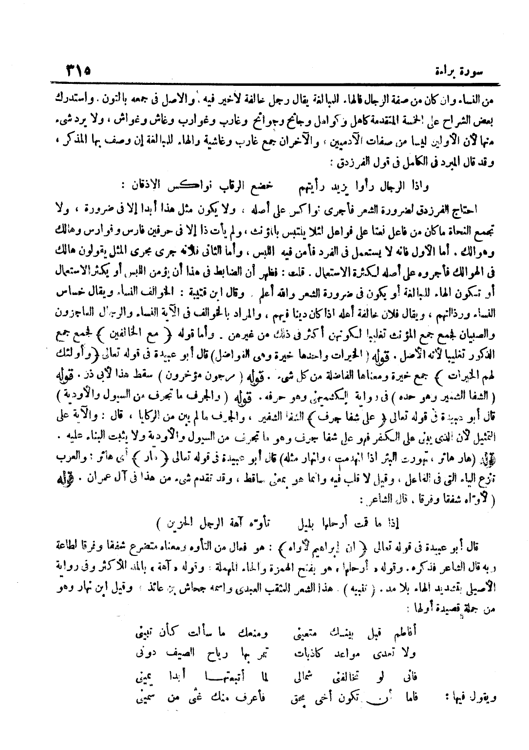 مِنَ النِّسَاءِ وَإِنْ كَانَ مِنْ صِفَةِ الرِّجَالِ فَالْهَاءُ لِلْمُبَالَغَةِ يُقَالُ رَجُلٌ خَالِفَةٌ لَا خَيْرَ فِيهِ وَالْأَصْلُ فِي جَمْعِهِ بِالنُّونِ وَاسْتَدْرَكَ بَعْضُ الشُّرَّاحِ عَلَى الْخَمْسَةِ الْمُتَقَدِّمَةِ كَاهِلٌ وَكَوَاهِلُ وَجَائِحٌ وَجَوَائِحُ وَغَارِبٌ وَغَوَارِبُ وَغَاشٍ وَغَوَاشٍ وَلَا يَرِدُ شَيْءٌ مِنْهَا لِأَنَّ الْأَوَّلَيْنِ لَيْسَا مِنْ صِفَاتِ الْآدَمِيِّينَ وَالْآخَرَانِ جَمْعُ غَارِبٍ وَغَاشِيَةٌ وَالْهَاءُ لِلْمُبَالَغَةِ إِنْ وُصِفَ بِهَا الْمُذَكَّرُ وَقَدْ قَالَ الْمُبَرِّدُ فِي الْكَامِلِ فِي قَوْلِ الْفَرَزْدَقِ وَإِذَا الرِّجَالُ رَأَوْا يَزِيدَ رَأَيْتُهُمْ خُضُعَ الرِّقَابِ نَوَاكِسَ الْأَذْقَانِ احْتَاجَ الْفَرَزْدَقُ لِضَرُورَةِ الشِّعْرِ فَأَجْرَى نَوَاكِسَ عَلَى أَصْلِهِ وَلَا يَكُونُ مِثْلُ هَذَا أَبَدًا إِلَّا فِي ضَرُورَةٍ وَلَا تَجْمَعُ النُّحَاةُ مَا كَانَ مِنْ فَاعِلٍ نَعْتًا عَلَى فَوَاعِلَ لِئَلَّا يَلْتَبِسُ بِالْمُؤَنَّثِ وَلَمْ يَأْتِ ذَا إِلَّا فِي حَرْفَيْنِ فَارِسٍ وَفَوَارِسَ وَهَالِكٍ وَهَوَالِكَ أَمَّا الْأَوَّلُ فَإِنَّهُ لَا يُسْتَعْمَلُ فِي الْفَرْدِ فَأُمِنَ فِيهِ اللَّبْسُ وَأَمَّا الثَّانِي فَلِأَنَّهُ جَرَى مَجْرَى الْمِثْلِ يَقُولُونَ هَالِكٌ فِي الْهَوَالِكِ فَأَجْرَوْهُ عَلَى أَصْلِهِ لِكَثْرَةِ الِاسْتِعْمَالِ قُلْتُ فَظَهَرَ أَنَّ الضَّابِطَ فِي هَذَا أَنْ يُؤْمَنَ اللَّبْسُ أَوْ يَكْثُرَ الِاسْتِعْمَالُ أَوْ تَكُونُ الْهَاءُ لِلْمُبَالَغَةِ أَوْ يَكُونُ فِي ضَرُورَةِ الشّعْر وَالله أعلم وَقَالَ بن قُتَيْبَةَ الْخَوَالِفُ النِّسَاءُ وَيُقَالُ خِسَاسُ النِّسَاءِ وَرَذَالَتُهُمْ وَيُقَالُ فُلَانٌ خَالِفَةُ أَهْلِهِ إِذَا كَانَ دَيِّنًا فِيهِمْ وَالْمُرَادُ بِالْخَوَالِفِ فِي الْآيَةِ النِّسَاءُ وَالرِّجَالُ الْعَاجِزُونَ وَالصِّبْيَانُ فَجُمِعَ جَمْعَ الْمُؤَنَّثِ تَغْلِيبًا لِكَوْنِهِنَّ أَكْثَرَ فِي ذَلِكَ مِنْ غَيْرِهِنَّ وَأَمَّا قَوْلُهُ مَعَ الخالفين فَجُمِعَ جَمْعَ الذُّكُورِ تَغْلِيبًا لِأَنَّهُ الْأَصْلُ قَوْلُهُ الْخَيْرَاتُ وَاحِدُهَا خَيْرَةٌ وَهِيَ الْفَوَاضِلُ قَالَ أَبُو عُبَيْدَةَ فِي قَوْلِهِ تَعَالَى وَأُولَئِكَ لَهُمُ الْخَيْرَاتُ جَمْعُ خَيْرَةٍ وَمَعْنَاهَا الْفَاضِلَةُ مِنْ كُلِّ شَيْءٍ قَوْلُهُ مُرْجَوْنَ مُؤَخَّرُونَ سَقَطَ هَذَا لِأَبِي ذَرٍّ قَوْلُهُ الشَّفَا الشَّفِيرُ وَهُوَ حَدُّهُ فِي رِوَايَةِ الْكُشْمِيهَنِيِّ وَهُوَ حَرْفُهُ قَوْلُهُ وَالْجُرُفُ مَا تَجَرَّفَ مِنَ السُّيُولِ وَالْأَوْدِيَةِ قَالَ أَبُو عُبَيْدَةَ فِي قَوْله تَعَالَى على شفا جرف الشَّفَا الشَّفِيرُ وَالْجُرُفُ مَا لَمْ يُبْنَ مِنَ الرَّكَايَا قَالَ وَالْآيَةُ عَلَى التَّمْثِيلِ لِأَنَّ الَّذِي يَبْنِي عَلَى الْكُفْرِ فَهُوَ عَلَى شَفَا جُرُفٍ وَهُوَ مَا تَجَرَّفَ مِنَ السُّيُولِ وَالْأَوْدِيَةِ وَلَا يَثْبُتُ الْبِنَاءُ عَلَيْهِ قَوْلُهُ هَارٍ هَائِرٍ تَهَوَّرَتِ الْبِئْرُ إِذَا انْهَدَمَتْ وَانْهَارَ مِثْلُهُ قَالَ أَبُو عُبَيْدَةَ فِي قَوْلِهِ تَعَالَى هَارٍ أَيْ هَائِرٍ وَالْعَرَبُ تَنْزِعُ الْيَاءَ الَّتِي فِي الْفَاعِلِ وَقِيلَ لاقلب فِيهِ وَإِنَّمَا هُوَ بِمَعْنَى سَاقِطٍ وَقَدْ تَقَدَّمَ شَيْءٌ مِنْ هَذَا فِي آلِ عِمْرَانَ قَوْلُهُ لَأَوَّاهٌ شَفَقًا وَفَرَقًا قَالَ الشَّاعِرُ إِذَا مَا قُمْت أرحلها بلَيْل تأوه آهة الرجل الحزين قَالَ أَبُو عُبَيْدَة فِي قَوْله تَعَالَى إِن إِبْرَاهِيم لأواه هُوَ فَعَّالٌ مِنَ التَّأَوُّهِ وَمَعْنَاهُ مُتَضَرِّعٌ شَفَقًا وَفَرَقًا لِطَاعَةِ رَبِّهِ قَالَ الشَّاعِرُ فَذَكَرَهُ وَقَوْلُهُ أَرْحَلُهَا هُوَ بِفَتْحِ الْ