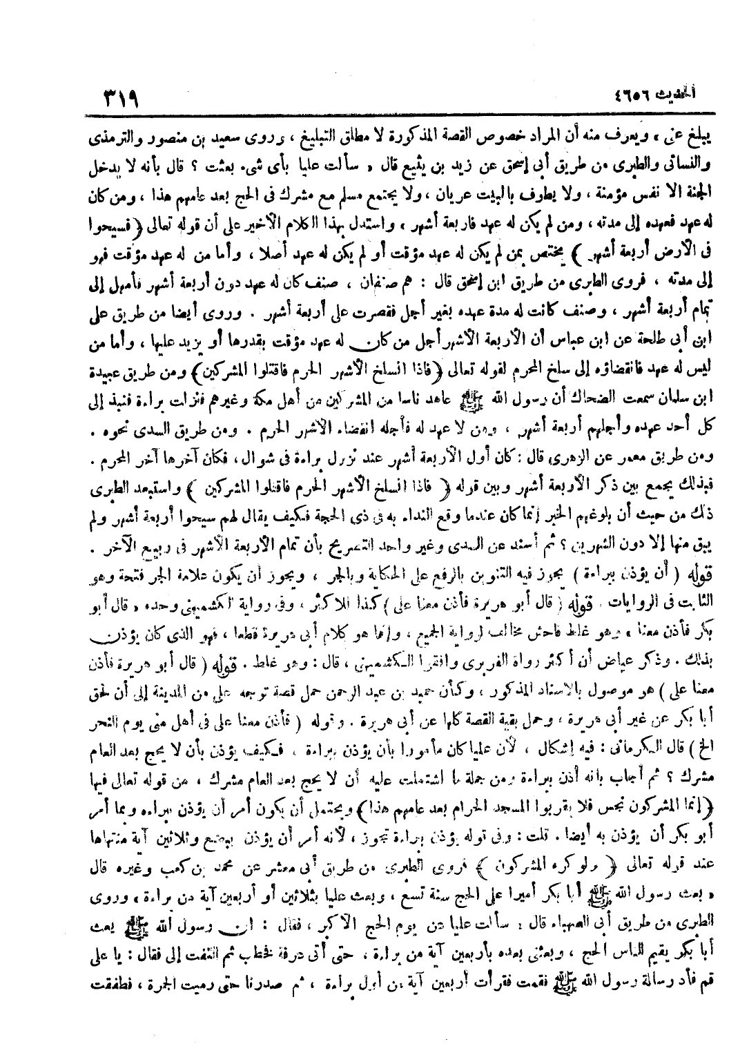 يُبَلِّغُ عَنِّي وَيُعْرَفُ مِنْهُ أَنَّ الْمُرَادَ خُصُوصُ الْقِصَّةِ الْمَذْكُورَةِ لَا مُطْلَقُ التَّبْلِيغِ وَرَوَى سَعِيدُ بْنُ مَنْصُورٍ وَالتِّرْمِذِيُّ وَالنَّسَائِيُّ وَالطَّبَرِيُّ مِنْ طَرِيقِ أَبِي إِسْحَاقَ عَنْ زَيْدِ بْنِ يُثَيْعٍ قَالَ سَأَلْتُ عَلِيًّا بِأَيِّ شَيْءٍ بُعِثْتَ قَالَ بِأَنَّهُ لَا يَدْخُلُ الْجَنَّةَ إِلَّا نَفْسٌ مُؤْمِنَةٌ وَلَا يَطُوفُ بِالْبَيْتِ عُرْيَانٌ وَلَا يَجْتَمِعُ مُسْلِمٌ مَعَ مُشْرِكٍ فِي الْحَجِّ بَعْدَ عَامِهِمْ هَذَا وَمَنْ كَانَ لَهُ عَهْدٌ فَعَهْدُهُ إِلَى مُدَّتِهِ وَمَنْ لَمْ يَكُنْ لَهُ عَهْدٌ فَأَرْبَعَةُ أَشْهُرٍ وَاسْتُدِلَّ بِهَذَا الْكَلَامِ الْأَخِيرِ عَلَى أَنَّ قَوْلَهُ تَعَالَى فسيحوا فِي الأَرْض أَرْبَعَة أشهر يَخْتَصُّ بِمَنْ لَمْ يَكُنْ لَهُ عَهْدٌ مُؤَقَّتٌ أَوْ لَمْ يَكُنْ لَهُ عَهْدٌ أَصْلًا وَأَمَّا مَنْ لَهُ عَهْدٌ مُؤَقَّتٌ فَهُوَ إِلَى مُدَّتِهِ فروى الطَّبَرِيّ من طَرِيق بن إِسْحَاقَ قَالَ هُمْ صِنْفَانِ صِنْفٌ كَانَ لَهُ عَهْدٌ دُونَ أَرْبَعَةِ أَشْهُرٍ فَأُمْهِلَ إِلَى تَمَامِ أَرْبَعَة أشهر وصنف كَانَت لَهُ مُدَّة عَهْدُهُ بِغَيْرِ أَجَلٍ فَقُصِرَتْ عَلَى أَرْبَعَةِ أَشْهُرٍ وَرُوِيَ أَيْضًا مِنْ طَرِيقِ عَلِيِّ بْنِ أَبِي طَلْحَةَ عَنِ بن عَبَّاسٍ أَنَّ الْأَرْبَعَةَ الْأَشْهُرَ أَجَلُ مَنْ كَانَ لَهُ عهد مُؤَقّت بِقَدْرِهَا أَوْ يَزِيدُ عَلَيْهَا وَأَمَّا مَنْ لَيْسَ لَهُ عَهْدٌ فَانْقِضَاؤُهُ إِلَى سَلْخِ الْمُحَرَّمِ لِقَوْلِهِ تَعَالَى فَإِذَا انْسَلَخَ الْأَشْهُرُ الْحُرُمُ فَاقْتُلُوا الْمُشْرِكِينَ وَمِنْ طَرِيقِ عَبِيدَةَ بْنِ سَلْمَانَ سَمِعْتُ الضَّحَّاكَ أَنَّ رَسُولَ اللَّهِ صَلَّى اللَّهُ عَلَيْهِ وَسَلَّمَ عَاهَدَ نَاسًا مِنَ الْمُشْرِكِينَ مِنْ أَهْلِ مَكَّةَ وَغَيْرِهِمْ فَنَزَلَتْ بَرَاءَةٌ فَنَبَذَ إِلَى كُلِّ أَحَدٍ عَهْدَهُ وَأَجَّلَهُمْ أَرْبَعَةَ أَشْهُرٍ وَمَنْ لَا عَهْدَ لَهُ فَأَجَلُهُ انْقِضَاءُ الْأَشْهُرِ الْحُرُمِ وَمِنْ طَرِيقِ السُّدِّيِّ نَحْوَهُ وَمِنْ طَرِيقِ مَعْمَرٍ عَنِ الزُّهْرِيِّ قَالَ كَانَ أَوَّلُ الْأَرْبَعَةِ أَشْهُرٍ عِنْدَ نُزُولِ بَرَاءَةٍ فِي شَوَّالٍ فَكَانَ آخِرُهَا آخَرَ الْمُحَرَّمِ فَبِذَلِكَ يُجْمَعُ بَيْنَ ذِكْرِ الْأَرْبَعَةِ أَشْهُرٍ وَبَيْنَ قَوْلِهِ فَإِذَا انْسَلَخَ الْأَشْهُرُ الْحُرُمُ فَاقْتُلُوا الْمُشْرِكِينَ وَاسْتَبْعَدَ الطَّبَرِيُّ ذَلِكَ مِنْ حَيْثُ إِنَّ بُلُوغَهُمُ الْخَبَر إِنَّمَا كَانَ عِنْدَمَا وَقَعَ النِّدَاءُ بِهِ فِي ذِي الْحِجَّةِ فَكَيْفَ يُقَالُ لَهُمْ سِيحُوا أَرْبَعَةَ أَشْهُرٍ وَلَمْ يَبْقَ مِنْهَا إِلَّا دُونَ الشَّهْرَيْنِ ثُمَّ أُسْنِدَ عَنِ السُّدِّيِّ وَغَيْرِ وَاحِدٍ التَّصْرِيحُ بِأَنَّ تَمَامَ الْأَرْبَعَةِ الْأَشْهُرِ فِي رَبِيعٍ الْآخِرِ قَوْلُهُ أَنْ يُؤَذِّنَ بِبَرَاءَةٍ يَجُوزُ فِيهِ التَّنْوِينُ بِالرَّفْعِ عَلَى الْحِكَايَةِ وَبِالْجَرِّ وَيَجُوزُ أَنْ يَكُونَ عَلَامَةُ الْجَرِّ فَتْحَةً وَهُوَ الثَّابِتُ فِي الرِّوَايَاتِ قَوْلُهُ قَالَ أَبُو هُرَيْرَةَ فَأَذَّنَ مَعَنَا عَلِيٌّ كَذَا لِلْأَكْثَرِ وَفِي رِوَايَةِ الْكُشْمِيهَنِيِّ وَحْدَهُ قَالَ أَبُو بَكْرٍ فَأَذَّنَ مَعَنَا وَهُوَ غَلَطٌ فَاحِشٌ مُخَالِفٌ لِرِوَايَةِ الْجَمِيعِ وَإِنَّمَا هُوَ كَلَامُ أَبِي هُرَيْرَةَ قَطْعًا فَهُوَ الَّذِي كَانَ يُؤَذِّنُ بِذَلِكَ وَذَكَرَ عِيَاضٌ أَنَّ أَكْثَرَ رُوَاةِ الْفَرَبْرِيِّ وَافَقُوا الْكُشْمِيهَنِيَّ قَالَ وَهُوَ غَلَطٌ قَوْلُهُ قَالَ أَبُو هُرَيْرَةَ فَأَذَّنَ مَعَنَا عَلِيٌّ هُوَ مَوْصُولٌ بِالْإِسْنَادِ الْمَذْكُورِ وَكَأَنَّ حُمَيْدَ بْنَ عَبْدِ الرَّح