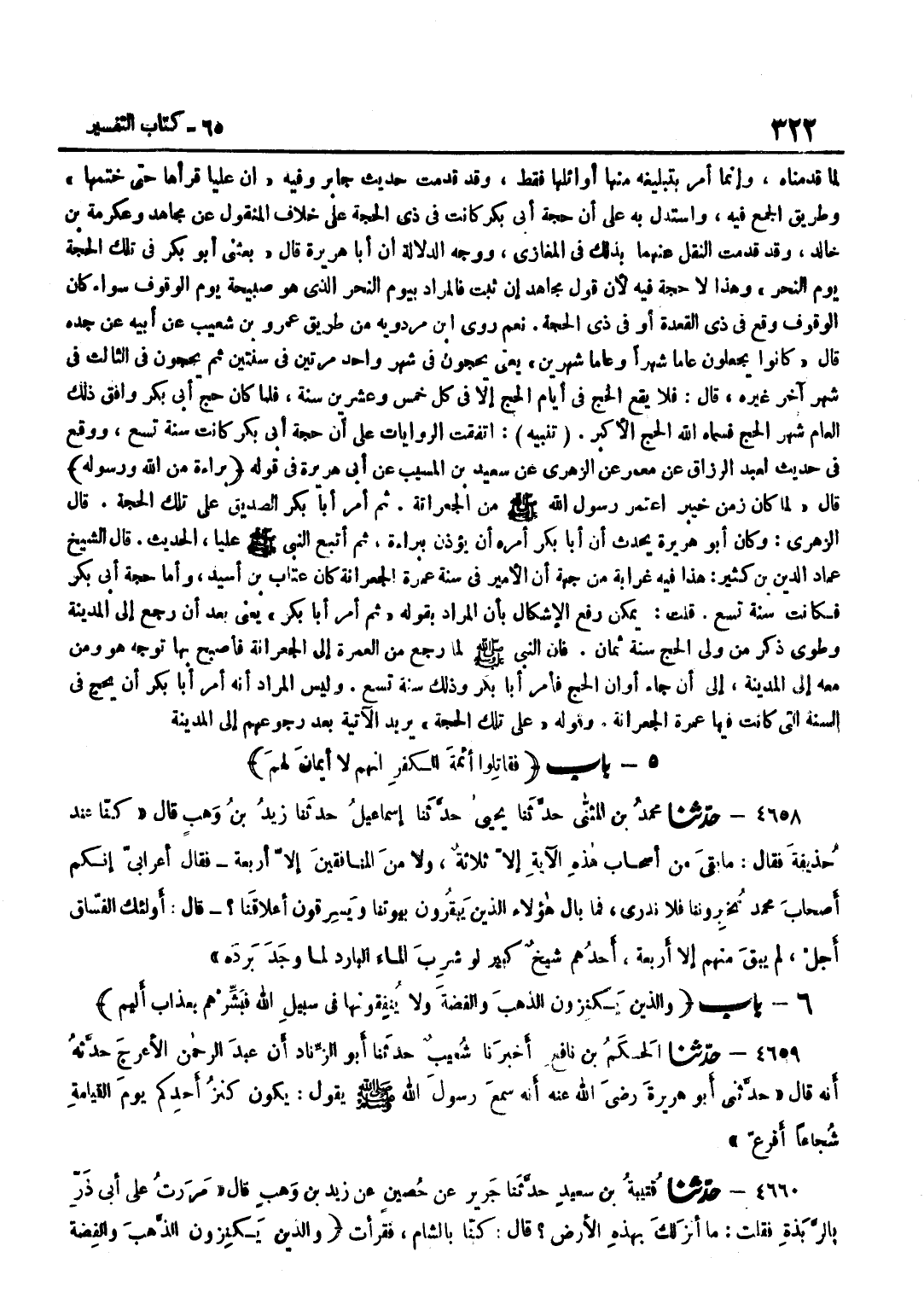 لِمَا قَدَّمْنَاهُ وَإِنَّمَا أُمِرَ بِتَبْلِيغِهِ مِنْهَا أَوَائِلِهَا فَقَطْ وَقَدْ قَدَّمْتُ حَدِيثَ جَابِرٍ وَفِيهِ أَنَّ عَلِيًّا قَرَأَهَا حَتَّى خَتَمَهَا وَطَرِيقُ الْجَمْعِ فِيهِ وَاسْتُدِلَّ بِهِ عَلَى أَنَّ حَجَّةَ أَبِي بَكْرٍ كَانَتْ فِي ذِي الْحَجَّةِ عَلَى خِلَافِ الْمَنْقُولِ عَنْ مُجَاهِدٍ وَعِكْرِمَةَ بْنِ خَالِدٍ وَقَدْ قَدَّمْتُ النَّقْلَ عَنْهُمَا بِذَلِكَ فِي الْمَغَازِي وَوَجْهُ الدَّلَالَةِ أَنَّ أَبَا هُرَيْرَةَ قَالَ بَعَثَنِي أَبُو بَكْرٍ فِي تِلْكَ الْحَجَّةِ يَوْمَ النَّحْرِ وَهَذَا لَا حُجَّةَ فِيهِ لِأَنَّ قَوْلَ مُجَاهِدٍ إِنْ ثَبَتَ فَالْمُرَادُ بِيَوْمِ النَّحْرِ الَّذِي هُوَ صَبِيحَةُ يَوْمِ الْوُقُوفِ سَوَاءً كَانَ الْوُقُوفُ وَقَعَ فِي ذِي الْقَعْدَةِ أَوْ فِي ذِي الْحِجَّةِ نَعَمْ رَوَى بن مَرْدَوَيْهِ مِنْ طَرِيقِ عَمْرِو بْنِ شُعَيْبٍ عَنْ أَبِيهِ عَنْ جَدِّهِ قَالَ كَانُوا يَجْعَلُونَ عَامًا شَهْرًا وَعَامًا شَهْرَيْنِ يَعْنِي يَحُجُّونَ فِي شَهْرٍ وَاحِدٍ مَرَّتَيْنِ فِي سَنَتَيْنِ ثُمَّ يَحُجُّونَ فِي الثَّالِثِ فِي شَهْرٍ آخَرَ غَيْرِهِ قَالَ فَلَا يَقَعُ الْحَجُّ فِي أَيَّامِ الْحَجِّ إِلَّا فِي كل خمس وَعِشْرِينَ سَنَةً فَلَمَّا كَانَ حَجُّ أَبِي بَكْرٍ وَافَقَ ذَلِكَ الْعَامَ شَهْرَ الْحَجِّ فَسَمَّاهُ اللَّهُ الْحَجَّ الْأَكْبَرَ تَنْبِيهٌ اتَّفَقَتِ الرِّوَايَاتُ عَلَى أَنَّ حَجَّةَ أَبِي بَكْرٍ كَانَتْ سَنَةَ تِسْعٍ وَوَقَعَ فِي حَدِيثٍ لِعَبْدِ الرَّزَّاقِ عَنْ مَعْمَرٍ عَنِ الزُّهْرِيِّ عَنْ سَعِيدِ بْنِ الْمُسَيَّبِ عَنْ أَبِي هُرَيْرَةَ فِي قَوْلِهِ بَرَاءَةٌ مِنَ اللَّهِ وَرَسُولِهِ قَالَ لَمَّا كَانَ زَمَنُ خَيْبَرَ اعْتَمَرَ رَسُولِ اللَّهِ صَلَّى اللَّهُ عَلَيْهِ وَسَلَّمَ مِنَ الْجِعِرَّانَةِ ثُمَّ أَمَّرَ أَبَا بَكْرٍ الصِّدِّيقَ عَلَى تِلْكَ الْحَجَّةِ قَالَ الزُّهْرِيُّ وَكَانَ أَبُو هُرَيْرَةَ يُحَدِّثُ أَنَّ أَبَا بَكْرٍ أَمَرَهُ أَنْ يُؤَذِّنَ بِبَرَاءَةٍ ثُمَّ أَتْبَعَ النَّبِيُّ صَلَّى اللَّهُ عَلَيْهِ وَسَلَّمَ عَلِيًّا الْحَدِيثَ قَالَ الشَّيْخُ عِمَادُ الدِّينِ بْنُ كَثِيرٍ هَذَا فِيهِ غَرَابَةٌ مِنْ جِهَةِ أَنَّ الْأَمِيرَ فِي سَنَةِ عُمْرَةِ الْجِعِرَّانَةِ كَانَ عَتَّابُ بْنُ أَسِيدٍ وَأَمَّا حَجَّةُ أَبِي بَكْرٍ فَكَانَتْ سَنَةَ تِسْعٍ قُلْتُ يُمْكِنُ رَفْعُ الْإِشْكَالِ بِأَنَّ الْمُرَادَ بِقَوْلِهِ ثُمَّ أَمَّرَ أَبَا بَكْرٍ يَعْنِي بعد أَن رَجَعَ إِلَى الْمَدِينَة وطوى ذكر مَنْ وَلِيَ الْحَجَّ سَنَةَ ثَمَانٍ فَإِنَّ النَّبِيَّ صَلَّى اللَّهُ عَلَيْهِ وَسَلَّمَ لَمَّا رَجَعَ مِنَ الْعُمْرَةِ إِلَى الْجِعِرَّانَةِ فَأَصْبَحَ بِهَا تَوَجَّهَ هُوَ وَمَنْ مَعَهُ إِلَى الْمَدِينَةِ إِلَى أَنْ جَاءَ أَوَانُ الْحَجِّ فَأَمَّرَ أَبَا بَكْرٍ وَذَلِكَ سَنَةَ تِسْعٍ وَلَيْسَ الْمُرَادُ أَنَّهُ أَمَّرَ أَبَا بَكْرٍ أَنْ يَحُجَّ فِي السَّنَةِ الَّتِي كَانَتْ فِيهَا عُمْرَةُ الْجِعِرَّانَةِ وَقَوْلُهُ عَلَى تِلْكَ الْحَجَّةِ يُرِيدُ الْآتِيَة بعد رجوعهم إِلَى الْمَدِينَة