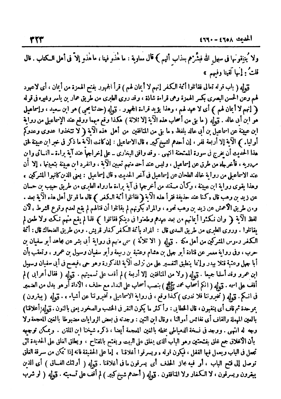 [4658] قَوْله حَدثنَا يحيي هُوَ بن سعيد وَإِسْمَاعِيل هُوَ بن أَبِي خَالِدٍ قَوْلُهُ مَا بَقِيَ مِنْ أَصْحَابِ هَذِهِ الْآيَةِ إِلَّا ثَلَاثَةٌ هَكَذَا وَقَعَ مُبْهَمًا وَوَقع عِنْد الْإِسْمَاعِيلِيّ من رِوَايَة بن عُيَيْنَة عَن إِسْمَاعِيل بن أبي خَالِدٍ بِلَفْظِ مَا بَقِيَ مِنَ الْمُنَافِقِينَ مِنْ أَهْلِ هَذِهِ الْآيَةِ لَا تَتَّخِذُوا عَدُوِّي وَعَدُوَّكُمْ أَوْلِيَاء الْآيَةَ إِلَّا أَرْبَعَةَ نَفَرٍ إِنَّ أَحَدَهُمْ لَشَيْخٌ كَبِيرٌ قَالَ الْإِسْمَاعِيلِيُّ إِنْ كَانَتِ الْآيَةُ مَا ذكر فِي خبر بن عُيَيْنَةَ فَحَقُّ هَذَا الْحَدِيثِ أَنْ يَخْرُجَ فِي سُورَةِ الْمُمْتَحَنَةِ انْتَهَى وَقَدْ وَافَقَ الْبُخَارِيُّ عَلَى إخْرَاجهَا عِنْد آيَة بَرَاءَة النَّسَائِيّ وبن مَرْدَوَيْهِ فَأَخْرَجَاهُ مِنْ طُرُقٍ عَنْ إِسْمَاعِيلَ وَلَيْسَ عِنْد أحد مِنْهُم تعْيين الْآيَة وَانْفَرَدَ بن عُيَيْنَةَ بِتَعْيِينِهَا إِلَّا أَنَّ عِنْدَ الْإِسْمَاعِيلِيِّ مِنْ رِوَايَةِ خَالِدٍ الطَّحَّانِ عَنْ إِسْمَاعِيلَ فِي آخِرِ الْحَدِيثِ قَالَ إِسْمَاعِيلُ يَعْنِي الَّذِينَ كَاتَبُوا الْمُشْرِكِينَ وَهَذَا يُقَوي رِوَايَة بن عُيَيْنَةَ وَكَأَنَّ مُسْتَنَدَ مَنْ أَخْرَجَهَا فِي آيَةِ بَرَاءَةٍ مَا رَوَاهُ الطَّبَرِيُّ مِنْ طَرِيقِ حَبِيبِ بْنُ حَسَّانَ عَنْ زَيْدِ بْنِ وَهْبٍ قَالَ كُنَّا عِنْدَ حُذَيْفَةَ فَقَرَأَ هَذِه الْآيَة فَقَاتلُوا أَئِمَّة الْكفْر قَالَ مَا قُوتِلَ أَهْلُ هَذِهِ الْآيَةِ بَعْدُ وَمِنْ طَرِيقِ الْأَعْمَشِ عَنْ زَيْدِ بْنِ وَهْبٍ نَحْوَهُ وَالْمُرَادُ بِكَوْنِهِمْ لَمْ يُقَاتَلُوا أَنَّ قِتَالَهُمْ لَمْ يَقَعْ لِعَدَمِ وُقُوعِ الشَّرْطِ لِأَنَّ لَفْظَ الْآيَةِ وَإِنْ نَكَثُوا أَيْمَانَهُمْ مِنْ بَعْدِ عَهْدِهِمْ وطعنوا فِي دينكُمْ فَقَاتلُوا فَلَمَّا لَمْ يَقَعْ مِنْهُمْ نَكْثٌ وَلَا طَعْنٌ لَمْ يُقَاتَلُوا وَرَوَى الطَّبَرِيُّ مِنْ طَرِيقِ السُّدِّيِّ قَالَ الْمُرَادُ بِأَئِمَّةِ الْكُفْرِ كُفَّارُ قُرَيْشٍ وَمِنْ طَرِيق الضَّحَّاك قَالَ أَئِمَّة الْكفْر رُؤُوس الْمُشْرِكِينَ مِنْ أَهْلِ مَكَّةَ قَوْلُهُ إِلَّا ثَلَاثَةٌ سُمِّيَ مِنْهُمْ فِي رِوَايَةِ أَبِي بِشْرٍ عَنْ مُجَاهِدٍ أَبُو سُفْيَانَ بْنُ حَرْبٍ وَفِي رِوَايَةِ مَعْمَرٍ عَنْ قَتَادَةَ أَبُو جَهْلِ بْنُ هِشَامٍ وَعُتْبَةُ بْنُ رَبِيعَةَ وَأَبُو سُفْيَانَ وَسُهَيْلُ بْنُ عَمْرٍو وَتُعُقِّبَ بِأَنَّ أَبَا جَهْلٍ وَعُتْبَةَ قُتِلَا بِبَدْرٍ وَإِنَّمَا يَنْطَبِقُ التَّفْسِيرُ عَلَى مَنْ نَزَلَتِ الْآيَةُ الْمَذْكُورَةُ وَهُوَ حَيٌّ فَيَصِحُّ فِي أَبِي سُفْيَانَ وَسُهَيْلِ بْنِ عَمْرٍو وَقَدْ أَسْلَمَا جَمِيعًا قَوْلُهُ وَلَا مِنَ الْمُنَافِقِينَ إِلَّا أَرْبَعَةٌ لَمْ أَقِفْ عَلَى تَسْمِيَتِهِمْ قَوْلُهُ فَقَالَ أَعْرَابِيٌّ لَمْ أَقِفْ عَلَى اسْمِهِ قَوْلُهُ إِنَّكُمْ أَصْحَابَ مُحَمَّدٍ صَلَّى اللَّهُ عَلَيْهِ وَسَلَّمَ بِنَصْبِ أَصْحَابٍ عَلَى النِّدَاءِ مَعَ حَذْفِ الْأَدَاةِ أَوْ هُوَ بَدَلٌ مِنَ الضَّمِيرِ فِي إِنَّكُمْ قَوْلُهُ تُخْبِرُونَنَا فَلَا نَدْرِي كَذَا وَقَعَ فِي رِوَايَةِ الْإِسْمَاعِيلِيِّ تُخْبِرُونَنَا عَنْ أَشْيَاءَ قَوْلُهُ يَبْقُرُونَ بِمُوَحَّدَةٍ ثُمَّ قَافٍ أَيْ يَنْقُبُونَ قَالَ الْخَطَّابِيُّ وَأَكْثَرُ مَا يَكُونُ النَّقْرُ فِي الْخَشَبِ وَالصُّخُورِ يَعْنِي بِالنُّونِ قَوْلُهُ أَعَلَاقَنَا بِالْعَيْنِ الْمُهْمَلَةِ وَالْقَافِ أَيْ نَفَائِسَ أَمْوَالِنَا وَقَالَ بن التِّينِ وَجَدْتُهُ فِي بَعْضِ الرِّوَايَاتِ مَضْبُوطًا بَالِغَيْنِ الْمُعْجَمَةِ وَلَا وَجْهَ لَهُ انْتَهَى وَوُجِدَ فِي نُسْخَةِ الدِّمْيَاطِيِّ بِخَطِّهِ بَالِغَيْنِ الْمُعْجَمَةِ أَي