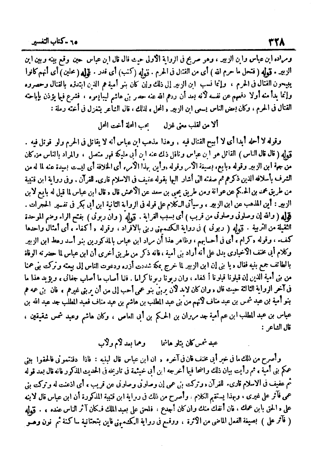 وَمرَاده بن عَبَّاس وبن الزُّبَيْرِ وَهُوَ صَرِيحٌ فِي الرِّوَايَةِ الْأُولَى حَيْثُ قَالَ قَالَ بن عَبَّاس حِين وَقع بَينه وَبَين بن الزُّبَيْرِ قَوْلُهُ فَتَحِلُّ مَا حَرَّمَ اللَّهُ أَيْ مِنَ الْقِتَالِ فِي الْحَرَمِ قَوْلُهُ كَتَبَ أَيْ قَدَّرَ قَوْلُهُ مُحِلِّينَ أَيْ أَنَّهُمْ كَانُوا يُبِيحُونَ الْقِتَال فِي الْحرم وَإِنَّمَا نسب بن الزُّبَيْرِ إِلَى ذَلِكَ وَإِنْ كَانَ بَنُو أُمَيَّةَ هُمُ الَّذِينَ ابْتَدَءُوهُ بِالْقِتَالِ وَحَصَرُوهُ وَإِنَّمَا بَدَأَ مِنْهُ أَوَّلًا دَفْعُهُمْ عَنْ نَفْسِهِ لِأَنَّهُ بَعْدَ أَنْ رَدَّهُمُ اللَّهُ عَنْهُ حَصَرَ بَنِي هَاشِمٍ لِيُبَايِعُوهُ فَشَرَعَ فِيمَا يُؤْذِنُ بِإِبَاحَتِهِ الْقِتَالَ فِي الْحرم وَكَانَ بعض النَّاس يُسمى بن الزُّبَيْرِ الْمُحِلُّ لِذَلِكَ قَالَ الشَّاعِرُ يَتَغَزَّلُ فِي أُخْتِهِ رَمْلَةَ أَلَا مَنْ لِقَلْبِ مَعْنَى غَزَلٍ بِحُبِّ الْمُحِلَّةِ أُخْتِ الْمُحِلّ وَقَوْلُهُ لَا أُحِلُّهُ أَبَدًا أَيْ لَا أُبِيحُ الْقِتَالَ فِيهِ وَهَذَا مَذْهَب بن عَبَّاسٍ أَنَّهُ لَا يُقَاتِلُ فِي الْحَرَمِ وَلَوْ قُوتِلَ فِيهِ قَوْلُهُ قَالَ قَالَ النَّاسُ الْقَائِلُ هُوَ بن عَبَّاس وناقل ذَلِك عَنهُ بن أَبِي مُلَيْكَةَ فَهُوَ مُتَّصِلٌ وَالْمُرَادُ بِالنَّاسِ مَنْ كَانَ من جِهَة بن الزُّبَيْرِ وَقَوْلُهُ بَايِعْ بِصِيغَةِ الْأَمْرِ وَقَوْلُهُ وَأَيْنَ بِهَذَا الْأَمْرِ أَيِ الْخِلَافَةِ أَيْ لَيْسَتْ بَعِيدَةً عَنْهُ لِمَا لَهُ مِنَ الشَّرَفِ بِأَسْلَافِهِ الَّذِينَ ذَكَرَهُمْ ثُمَّ صِفَتِهِ الَّتِي أَشَارَ إِلَيْهَا بِقَوْلِهِ عَفِيفٌ فِي الْإِسْلَامِ قَارِئٌ لِلْقُرْآنِ وَفِي رِوَايَةِ بن قُتَيْبَةَ مِنْ طَرِيقِ مُحَمَّدِ بْنِ الْحَكَمِ عَنْ عَوَانَةَ وَمِنْ طَرِيقِ يَحْيَى بْنِ سَعْدٍ عَنِ الْأَعْمَش قَالَ قَالَ بن عَبَّاسٍ لَمَّا قِيلَ لَهُ بَايِعْ لِابْنِ الزُّبَيْرِ أَيْن الْمَذْهَب عَن بن الزُّبَيْرِ وَسَيَأْتِي الْكَلَامُ عَلَى قَوْلِهِ فِي الرِّوَايَةِ الثَّانِيَة بن أَبِي بَكْرٍ فِي تَفْسِيرِ الْحُجُرَاتِ قَوْلُهُ وَاللَّهِ إِنْ وَصَلُونِي وَصَلُونِي مِنْ قَرِيبٍ أَيْ بِسَبَبِ الْقَرَابَةِ قَوْلُهُ وَإِنْ رَبُّونِي بِفَتْحِ الرَّاءِ وَضَمِّ الْمُوَحَّدَةِ الثَّقِيلَةِ مِنَ التَّرْبِيَةِ قَوْلُهُ رَبُّونِي فِي رِوَايَةِ الْكُشْمِيهَنِيِّ رَبَّنِي بِالْإِفْرَادِ وَقَوْلُهُ أَكْفَاءٌ أَيْ أَمْثَالٌ وَاحِدُهَا كُفْءٌ وَقَوْلُهُ كِرَامٌ أَيْ فِي أحسابهم وَظَاهر هَذَا أَن مُرَاد بن عَبَّاس بالمذكورين بَنو أَسد رَهْط بن الزُّبَيْرِ وَكَلَامُ أَبِي مِخْنَفٍ الْأَخْبَارِيِّ يَدُلُّ عَلَى أَنَّهُ أَرَادَ بَنِي أُمَيَّةَ فَإِنَّهُ ذَكَرَ مِنْ طَرِيق أُخْرَى أَن بن عَبَّاسٍ لَمَّا حَضَرَتْهُ الْوَفَاةُ بِالطَّائِفِ جَمَعَ بَنِيهِ فَقَالَ يَا بني إِن بن الزُّبَيْرِ لَمَّا خَرَجَ بِمَكَّةَ شَدَدْتُ أَزْرَهُ وَدَعَوْتُ النَّاسَ إِلَى بَيْعَتِهِ وَتَرَكْتُ بَنِي عَمِّنَا مِنْ بَنِي أُمَيَّةَ الَّذِينَ إِنْ قَبِلُونَا قَبِلُونَا أَكْفَاءً وَإِنْ رَبُّونَا رَبُّونَا كِرَامًا فَلَمَّا أَصَابَ مَا أَصَابَ جَفَانِي وَيُؤَيِّدُ هَذَا مَا فِي آخِرِ الرِّوَايَةِ الثَّالِثَةِ حَيْثُ قَالَ وَإِنْ كَانَ لَا بُد لِأَن يربنى بَنو عمي أحب إِلَى من أَن يربنِي غَيرهم فَإِن بني عَمه هُمْ بَنُو أُمَيَّةَ بْنِ عَبْدِ شَمْسِ بْنِ عَبْدِ مَنَافٍ لأَنهم من بني عبد الْمطلب بن هَاشم بن عبد منَاف فعبد الْمطلب جَدُّ عَبْدِ اللَّهِ بْنِ عَبَّاسِ بْنِ عَبْدِ الْمطلب بن عَمِّ أُمَيَّةَ جَدِّ مَرْوَانَ بْنِ الْحَكَمِ بْنِ أَبِي الْعَاصِ وَكَانَ هَاشِمٌ وَعَبْدُ شَمْسٍ شَقِيقَيْنِ قَالَ الشَّاعِرُ عَبْدُ شَمْسٍ كَانَ يَتْلُو هَاشِمًا وهم
