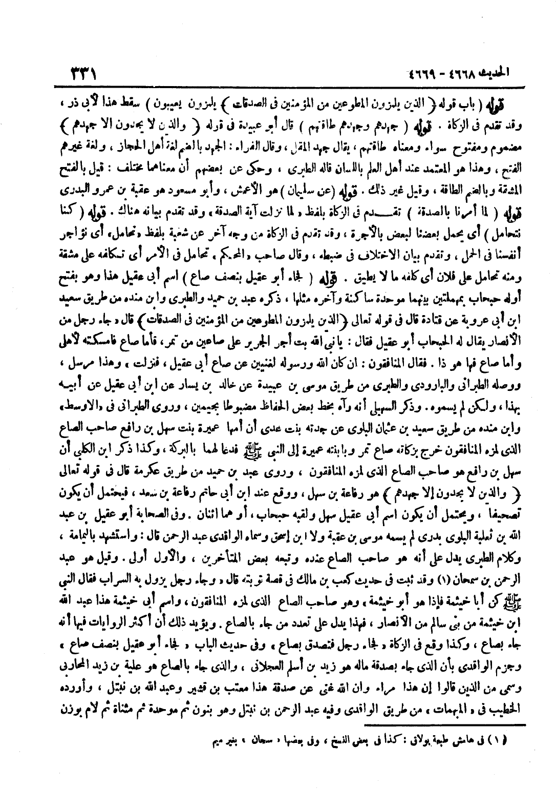 [4668] قَوْلُهُ عَنْ سُلَيْمَانَ هُوَ الْأَعْمَشُ وَأَبُو مَسْعُودٍ هُوَ عُقْبَةُ بْنُ عَمْرٍو الْبَدْرِيُّ قَوْلُهُ لَمَّا أُمِرْنَا بِالصَّدَقَةِ تَقَدَّمَ فِي الزَّكَاةِ بِلَفْظِ لَمَّا نَزَلَتْ آيَةُ الصَّدَقَةِ وَقَدْ تَقَدَّمَ بَيَانُهُ هُنَاكَ قَوْلُهُ كُنَّا نَتَحَامَلُ أَيْ يَحْمِلُ بَعْضُنَا لِبَعْضٍ بِالْأُجْرَةِ وَقَدْ تَقَدَّمَ فِي الزَّكَاةِ مِنْ وَجْهٍ آخَرَ عَن شُعْبَة بِلَفْظ تحامل أَيْ نُؤَاجِرُ أَنْفُسَنَا فِي الْحَمْلِ وَتَقَدَّمَ بَيَانُ الِاخْتِلَافِ فِي ضَبْطِهِ وَقَالَ صَاحِبُ الْمُحْكَمِ تَحَامَلَ فِي الْأَمْرِ أَيْ تَكَلَّفَهُ عَلَى مَشَقَّةٍ وَمِنْهُ تَحَامَلَ عَلَى فُلَانٍ أَيْ كَلَّفَهُ مَا لَا يُطِيقُ قَوْلُهُ فَجَاءَ أَبُو عَقِيلٍ بِنِصْفِ صَاعٍ اسْمُ أَبِي عَقِيلٍ هَذَا وَهُوَ بِفَتْحِ أَوَّلِهِ حَبْحَابٌ بِمُهْمَلَتَيْنِ بَيْنَهُمَا مُوَحَّدَةٌ سَاكِنَةٌ وَآخِرُهُ مِثْلُهَا ذكره عبد بن حميد والطبري وبن مَنْدَهْ مِنْ طَرِيقِ سَعِيدِ بْنِ أَبِي عَرُوبَةَ عَنْ قَتَادَةَ قَالَ فِي قَوْلِهِ تَعَالَى الَّذِينَ يَلْمِزُونَ الْمُطوِّعين من الْمُؤمنِينَ فِي الصَّدقَات قَالَ جَاءَ رَجُلٌ مِنَ الْأَنْصَارِ يُقَالُ لَهُ الْحَبْحَابُ أَبُو عَقِيلٍ فَقَالَ يَا نَبِيَّ اللَّهِ بِتُّ أَجُرُّ الْجَرِيرَ عَلَى صَاعَيْنِ مِنْ تَمْرٍ فَأَمَّا صَاعٌ فَأَمْسَكْتُهُ لِأَهْلِي وَأَمَّا صَاعٌ فَهَا هُوَ ذَا فَقَالَ الْمُنَافِقُونَ إِنْ كَانَ اللَّهُ وَرَسُولُهُ لَغَنِيَّيْنِ عَنْ صَاعِ أَبِي عَقِيلٍ فَنَزَلَتْ وَهَذَا مُرْسَلٌ وَوَصَلَهُ الطَّبَرَانِيُّ وَالْبَارُودِيُّ وَالطَّبَرِيُّ مِنْ طَرِيقِ مُوسَى بْنِ عُبَيْدَةَ عَنْ خَالِدِ بْنِ يَسَارٍ عَن بن أَبِي عَقِيلٍ عَنْ أَبِيهِ بِهَذَا وَلَكِنْ لَمْ يُسَمُّوهُ وَذَكَرَ السُّهَيْلِيُّ أَنَّهُ رَآهُ بِخَطِّ بَعْضِ الْحُفَّاظِ مَضْبُوطًا بِجِيمَيْنِ وَرَوَى الطَّبَرَانِيُّ فِي الْأَوْسَطِ وبن مَنْدَهْ مِنْ طَرِيقِ سَعِيدِ بْنِ عُثْمَانَ الْبَلَوِيِّ عَنْ جَدَّتِهِ بِنْتِ عَدِيٍّ أَنَّ أُمَّهَا عُمَيْرَةَ بِنْتَ سَهْلِ بْنِ رَافِعٍ صَاحِبِ الصَّاعِ الَّذِي لَمَزَهُ الْمُنَافِقُونَ خَرَجَ بِزَكَاتِهِ صَاعِ تَمْرٍ وَبِابْنَتِهِ عُمَيْرَةَ إِلَى النَّبِيِّ صَلَّى اللَّهُ عَلَيْهِ وَسَلَّمَ فَدَعَا لَهما بِالْبركَةِ وَكَذَا ذكر بن الْكَلْبِيِّ أَنَّ سَهْلَ بْنَ رَافِعٍ هُوَ صَاحِبُ الصَّاعِ الَّذِي لَمَزَهُ الْمُنَافِقُونَ وَرَوَى عَبْدُ بْنُ حُمَيْدٍ مِنْ طَرِيقِ عِكْرِمَةَ قَالَ فِي قَوْلِهِ تَعَالَى وَالَّذِينَ لَا يَجِدُونَ إِلَّا جُهْدَهُمْ هُوَ رِفَاعَة بن سهل وَوَقع عِنْد بن أَبِي حَاتِمٍ رِفَاعَةُ بْنُ سَعْدٍ فَيَحْتَمِلُ أَنْ يَكُونَ تَصْحِيفًا وَيَحْتَمِلُ أَنْ يَكُونَ اسْمُ أَبِي عقيل سهل وَلَقَبُهُ حَبْحَابٌ أَوْ هُمَا اثْنَانِ وَفِي الصَّحَابَةِ أَبُو عَقِيلِ بْنُ عَبْدِ اللَّهِ بْنِ ثَعْلَبَةَ الْبَلَوِيِّ بَدْرِيٌّ لَمْ يُسَمِّهِ مُوسَى بْنُ عُقْبَةَ وَلَا بن إِسْحَاقَ وَسَمَّاهُ الْوَاقِدِيُّ عَبْدَ الرَّحْمَنِ قَالَ وَاسْتُشْهِدَ بِالْيَمَامَةِ وَكَلَامُ الطَّبَرِيِّ يَدُلُّ عَلَى أَنَّهُ هُوَ صَاحِبُ الصَّاعِ عِنْدَهُ وَتَبِعَهُ بَعْضُ الْمُتَأَخِّرِينَ وَالْأَوَّلُ أَوْلَى وَقِيلَ هُوَ عَبْدُ الرَّحْمَنِ بْنُ سَمْحَانَ وَقَدْ ثَبَتَ فِي حَدِيثِ كَعْبِ بْنِ مَالِكٍ فِي قِصَّةِ تَوْبَتِهِ قَالَ وَجَاءَ رَجُلٌ يَزُولُ بِهِ السَّرَابُ فَقَالَ النَّبِيُّ صَلَّى اللَّهُ عَلَيْهِ وَسَلَّمَ كُنْ أَبَا خَيْثَمَةَ فَإِذَا هُوَ أَبُو خَيْثَمَةَ وَهُوَ صَاحِبُ الصَّاعِ الَّذِي لَمَزَهُ الْمُنَافِقُونَ وَاسْمُ أَبِي خَيْثَمَةَ هَذَا عَبْدُ اللَّهِ بْنُ خَيْثَمَةَ مِنْ بَنِي سَالِمٍ مِ