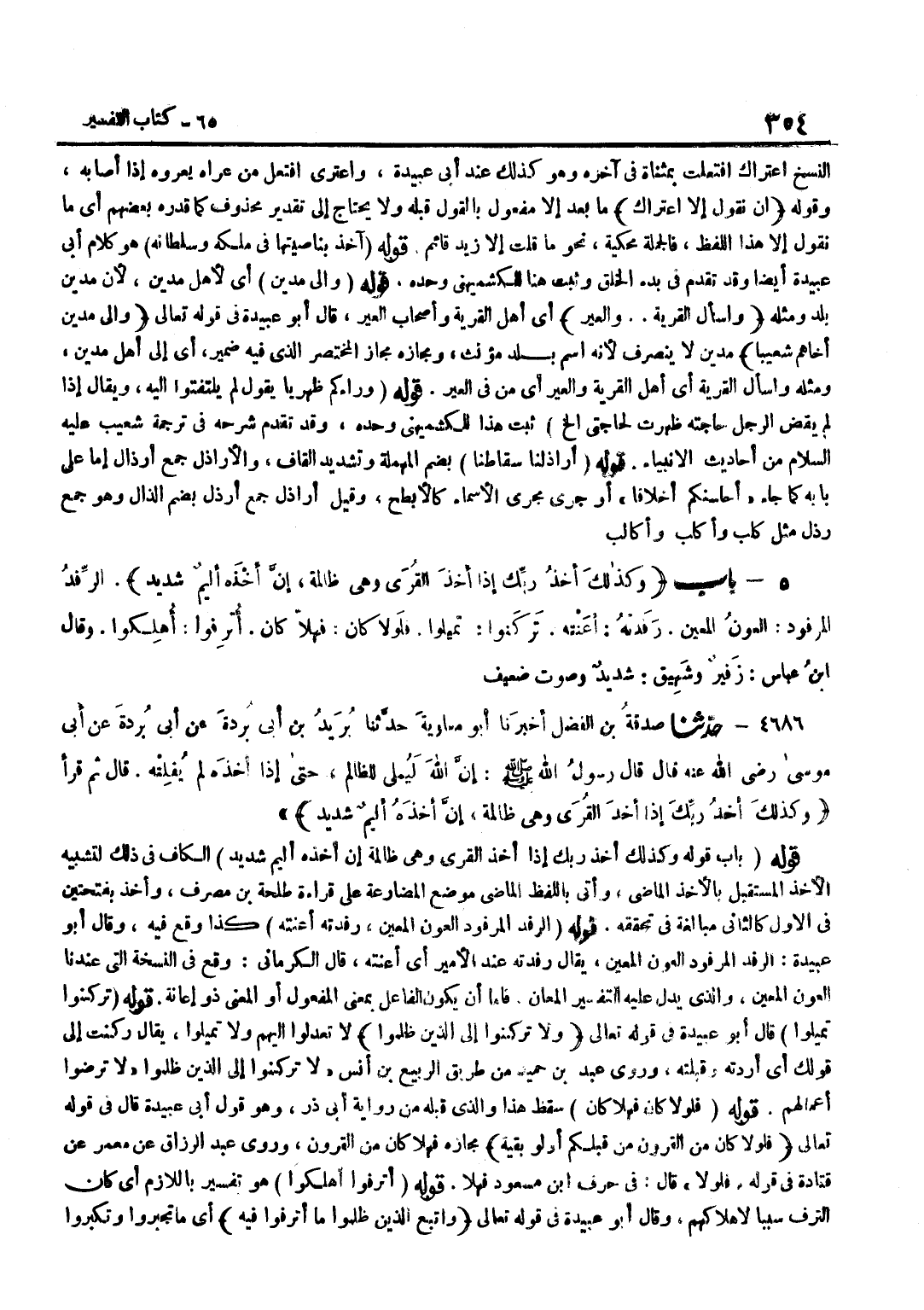 الْكَاف فِي ذَلِك لتشبيه الْأَخْذ الْمُسْتَقْبل بِالْأَخْذِ الْمَاضِي وأتى بِاللَّفْظِ الْمَاضِي مَوضِع المضارعة على قِرَاءَة طَلْحَة بن مصرف وَأخذ بِفتْحَتَيْنِ فِي الأول كالثاني مُبَالغَة فِي تحَققه قَوْله الرفد المرفود العون الْمعِين رفدته أعنته كَذَا وَقع فِيهِ وَقَالَ أَبُو عُبَيْدَة الرفد المرفود العون الْمعِين يُقَال رفدته عِنْد الْأَمِير أَي أعنته قَالَ الْكرْمَانِي وَقع فِي النُّسْخَة الَّتِي عندنَا العون الْمعِين وَالَّذِي يدل عَلَيْهِ التَّفْسِير المعان فَأَما أَن يكون الْفَاعِل بِمَعْنى الْمَفْعُول أَو الْمَعْنى ذُو إِعَانَة قَوْلُهُ تَرْكَنُوا تَمِيلُوا قَالَ أَبُو عُبَيْدَةَ فِي قَوْلُهُ تَعَالَى وَلَا تَرْكَنُوا إِلَى الَّذِينَ ظَلَمُوا لَا تعدلوا إِلَيْهِم وَلَا تميلوا يُقَال ركنت إِلَى قَوْلك أَي أردته وقبلته وروى عَبْدُ بْنُ حُمَيْدٍ مِنْ طَرِيقِ الرَّبِيعِ بْنِ أنس لَا تركنوا إِلَى الَّذين ظلمُوا لَا ترضوا أَعْمَالهم قَوْله فلولا كَانَ فَهَلا كَانَ سقط هَذَا وَالَّذِي قبله من رِوَايَةِ أَبِي ذَرٍّ وَهُوَ قَوْلُ أَبِي عُبَيْدَةَ قَالَ فِي قَوْلِهِ تَعَالَى فَلَوْلَا كَانَ مِنَ الْقُرُونِ مِنْ قَبْلِكُمْ أُولُو بَقِيَّة مجازه فَهَلا كَانَ من الْقُرُون وَرَوَى عَبْدُ الرَّزَّاقِ عَنْ مَعْمَرٍ عَنْ قَتَادَةَ فِي قَوْله فلولا قَالَ فِي حرف بن مَسْعُود فَهَلا قَوْله أترفوا أهلكوا هُوَ تَفْسِير باللازم أَي كَانَ الترف سَببا لاهلاكهم وَقَالَ أَبُو عُبَيْدَةَ فِي قَوْلِهِ تَعَالَى وَاتَّبَعَ الَّذين ظلمُوا مَا أترفوا فِيهِ أَيْ مَا تَجَبَّرُوا وَتَكَبَّرُوا