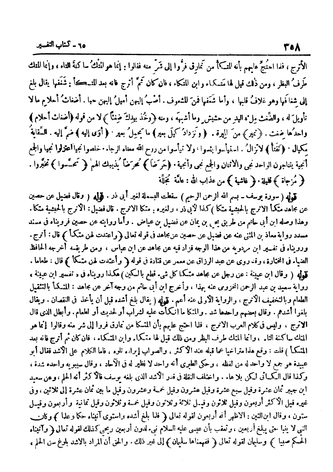 سَقَطَتِ الْبَسْمَلَةُ لِغَيْرِ أَبِي ذَرٍّ قَوْلُهُ وَقَالَ فُضَيْل عَن حُصَيْن عَن مُجَاهِد متكأ الأترج بِالْحَبَشِيَّةِ مُتْكًا كَذَا لِأَبِي ذَرٍّ وَلِغَيْرِهِ مُتْكًا الْأُتْرُجُّ قَالَ فُضَيْلٌ الْأُتْرُجُّ بِالْحَبَشِيَّةِ مُتْكًا وَهَذَا وَصله بن أَبِي حَاتِمٍ مِنْ طَرِيقِ يَحْيَى بْنِ يَمَانٍ عَنْ فُضَيْلِ بْنِ عِيَاضٍ وَأَمَّا رِوَايَتُهُ عَنْ حُصَيْنٍ فَرَوَيْنَاهُ فِي مُسْنَدِ مُسَدَّدٍ رِوَايَةُ مُعَاذِ بْنِ الْمُثَنَّى عَنْهُ عَنْ فُضَيْلٍ عَنْ حُصَيْنٍ عَنْ مُجَاهِدٍ فِي قَوْلِهِ تَعَالَى وَأَعْتَدَتْ لَهُنَّ متكأ قَالَ أترج ورويناه فِي تَفْسِير بن مَرْدَوَيْهِ مِنْ هَذَا الْوَجْهِ فَزَادَ فِيهِ عَنْ مُجَاهِد عَن بن عَبَّاسٍ وَمِنْ طَرِيقِهِ أَخْرَجَهُ الْحَافِظُ الضِّيَاءُ فِي المختارة وَقد روى عَن عَبْدُ الرَّزَّاقِ عَنْ مَعْمَرٍ عَنْ قَتَادَةَ فِي قَوْله وأعتدت لَهُنَّ متكا قَالَ طَعَاما قَوْله وَقَالَ بن عُيَيْنَة عَن رجل عَن مُجَاهِد متكأ كل شَيْءٍ قُطِعَ بِالسِّكِّينِ هَكَذَا رَوَيْنَاهُ فِي تَفْسِيرِ بن عُيَيْنَةَ رِوَايَةَ سَعِيدِ بْنِ عَبْدِ الرَّحْمَنِ الْمَخْزُومِيِّ عَنْهُ بِهَذَا وَأخرج بن أَبِي حَاتِمٍ مِنْ وَجْهٍ آخَرَ عَنْ مُجَاهِدٍ الْمُتَّكَأُ بِالتَّثْقِيلِ الطَّعَامُ وَبِالتَّخْفِيفِ الْأُتْرُجُّ وَالرِّوَايَةُ الْأُولَى عَنْهُ أَعَمُّ قَوْلُهُ يُقَالُ بَلَغَ أَشُدَّهُ قَبْلَ أَنْ يَأْخُذَ فِي النُّقْصَانِ وَيُقَالُ بَلَغُوا أَشُدَّهُمْ وَقَالَ بَعضهم وَاحِدهَا شدّ والمتكأ مَا اتكأت عَلَيْهِ لِشَرَابٍ أَوْ لِحَدِيثٍ أَوْ لِطَعَامٍ وَأَبْطَلَ الَّذِي قَالَ الْأُتْرُجُّ وَلَيْسَ فِي كَلَامِ الْعَرَبِ الْأُتْرُجُّ فَلَمَّا احْتُجَّ عَلَيْهِمْ بِأَنَّ الْمُتَّكَأَ مِنْ نَمَارِقَ فَرُّوا إِلَى شَرٍّ مِنْهُ وَقَالُوا إِنَّمَا هُوَ المتك سَاكِنة التَّاء وَإِنَّمَا المتك طرف البظر وَمن ذَلِك قيل لَهَا متكاء وبن المتكاء فَإِن كَانَ ثمَّ أترج فَإِنَّهُ بعد الْمُتَّكَأِ قُلْتُ وَقَعَ هَذَا مُتَرَاخِيًا عَمَّا قَبْلَهُ عِنْدَ الْأَكْثَرِ وَالصَّوَابُ إِيرَادُهُ تِلْوَهُ فَأَمَّا الْكَلَامُ عَلَى الْأَشُدِّ فَقَالَ أَبُو عُبَيْدَةَ هُوَ جَمْعٌ لَا وَاحِدَ لَهُ مِنْ لَفْظِهِ وَحَكَى الطَّبَرِيُّ أَنَّهُ وَاحِدٌ لَا نَظِيرَ لَهُ فِي الْآحَادِ وَقَالَ سِيبَوَيْهِ وَاحِدُهُ شِدَّةٌ وَكَذَا قَالَ الْكِسَائِيُّ لَكِنْ بِلَا هَاءٍ وَاخْتَلَفَ النَّقَلَةُ فِي قَدْرِ الْأَشَدِّ الَّذِي بَلَغَهُ يُوسُفُ فَالْأَكْثَرُ أَنَّهُ الْحُلُمُ وَعَنْ سَعِيدِ بْنِ جُبَيْرٍ ثَمَانِ عَشْرَةَ وَقِيلَ سَبْعَ عَشْرَةَ وَقِيلَ عِشْرُونَ وَقِيلَ خَمْسَةٌ وَعِشْرُونَ وَقِيلَ مَا بَيْنَ ثَمَانِ عَشْرَةَ إِلَى ثَلَاثِينَ وَفِي غَيْرِهِ قِيلَ الْأَكْثَرُ أَرْبَعُونَ وَقِيلَ ثَلَاثُونَ وَقِيلَ ثَلَاثَةٌ وَثَلَاثُونَ وَقِيلَ خَمْسَةٌ وَثَلَاثُونَ وَقِيلَ ثَمَانِيَة وَأَرْبَعُونَ وَقيل سِتُّونَ وَقَالَ بن التِّين الْأَظْهر أَنه أَرْبَعُونَ لقَوْله تَعَالَى فَلَمَّا بلغ أشده واستوى آتيناه حكما وعلما وَكَانَ النَّبِيُّ لَا يُنَبَّأُ حَتَّى يَبْلُغَ أَرْبَعِينَ وَتُعُقِّبَ بِأَنَّ عِيسَى عَلَيْهِ السَّلَامُ نُبِّئَ لِدُونِ أَرْبَعِينَ وَيَحْيَى كَذَلِكَ لِقَوْلِهِ تَعَالَى وَآتَيْنَاهُ الْحُكْمَ صَبيا وَسليمَان لقَوْله تَعَالَى ففهمناها سُلَيْمَان إِلَى غَيْرِ ذَلِكَ وَالْحَقُّ أَنَّ الْمُرَادَ بِالْأَشُدِّ بُلُوغُ سِنِّ الْحُلُمِ