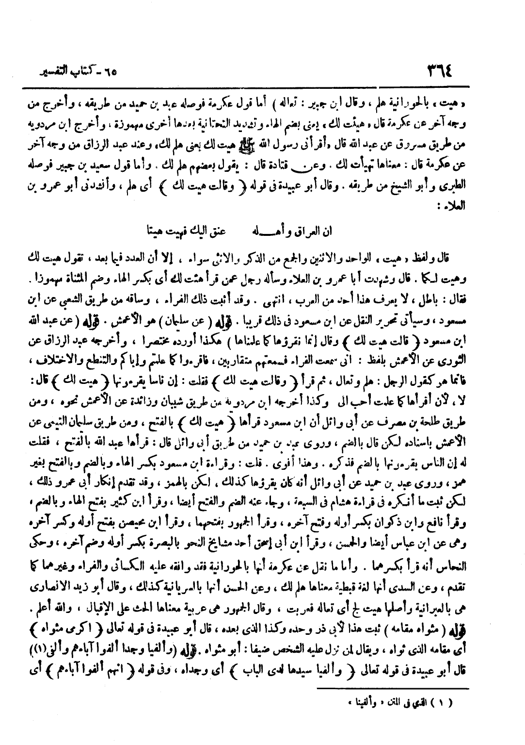 هيت بالحورانية هَلُمَّ وَقَالَ بن جُبَيْرٍ تَعَالَهْ أَمَّا قَوْلُ عِكْرِمَةَ فَوَصَلَهُ عَبْدُ بْنُ حُمَيْدٍ مِنْ طَرِيقِهِ وَأَخْرَجَ مِنْ وَجْهٍ آخَرَ عَنْ عِكْرِمَةَ قَالَ هُيِّئْتُ لَكَ يَعْنِي بِضَمِّ الْهَاءِ وَتَشْدِيدِ التَّحْتَانِيَّةِ بَعْدَهَا أُخْرَى مَهْمُوزَةٌ وَأخرج بن مَرْدَوَيْهِ مِنْ طَرِيقِ مَسْرُوقٍ عَنْ عَبْدِ اللَّهِ قَالَ أَقْرَأَنِي رَسُولُ اللَّهِ صَلَّى اللَّهُ عَلَيْهِ وَسلم هيت لَك يَعْنِي هَلُمَّ لَكَ وَعِنْدَ عَبْدِ الرَّزَّاقِ مِنْ وَجْهٍ آخَرَ عَنْ عِكْرِمَةَ قَالَ مَعْنَاهَا تَهَيَّأْتُ لَكَ وَعَنْ قَتَادَةَ قَالَ يَقُولُ بَعْضُهُمْ هَلُمَّ لَكَ وَأَمَّا قَوْلُ سَعِيدِ بْنِ جُبَيْرٍ فَوَصَلَهُ الطَّبَرِيُّ وَأَبُو الشَّيْخِ مِنْ طَرِيقِهِ وَقَالَ أَبُو عُبَيْدَةَ فِي قَوْلِهِ وَقَالَت هيت لَك أَيْ هَلُمَّ وَأَنْشَدَنِي أَبُو عَمْرِو بْنُ الْعَلَاءِ إِنَّ الْعِرَاقَ وَأَهْلَهُ عُنُقٌ إِلَيْكَ فَهِيتَ هِيتًا قَالَ وَلَفْظُ هَيْتَ لِلْوَاحِدِ وَالِاثْنَيْنِ وَالْجَمْعِ مِنَ الذَّكَرِ وَالْأُنْثَى سَوَاءٌ إِلَّا أَنَّ الْعَدَدَ فِيمَا بَعْدُ تَقُولُ هَيْتَ لَكَ وَهَيْتَ لَكُمَا قَالَ وَشَهِدْتُ أَبَا عَمْرِو بْنَ الْعَلَاءِ وَسَأَلَهُ رَجُلٌ عَمَّنْ قَرَأَ هِئْتُ لَكَ أَيْ بِكَسْرِ الْهَاءِ وَضَمِّ الْمُثَنَّاةِ مَهْمُوزًا فَقَالَ بَاطِلٌ لَا يَعْرِفُ هَذَا أَحَدٌ مِنَ الْعَرَبِ انْتَهَى وَقَدْ أَثْبَتَ ذَلِكَ الْفَرَّاءُ وَسَاقَهُ مِنْ طَرِيقِ الشَّعْبِيِّ عَنِ بن مَسْعُود وَسَيَأْتِي تَحْرِير النَّقْل عَن بن مَسْعُودٍ فِي ذَلِكَ قَرِيبًا قَوْلُهُ
