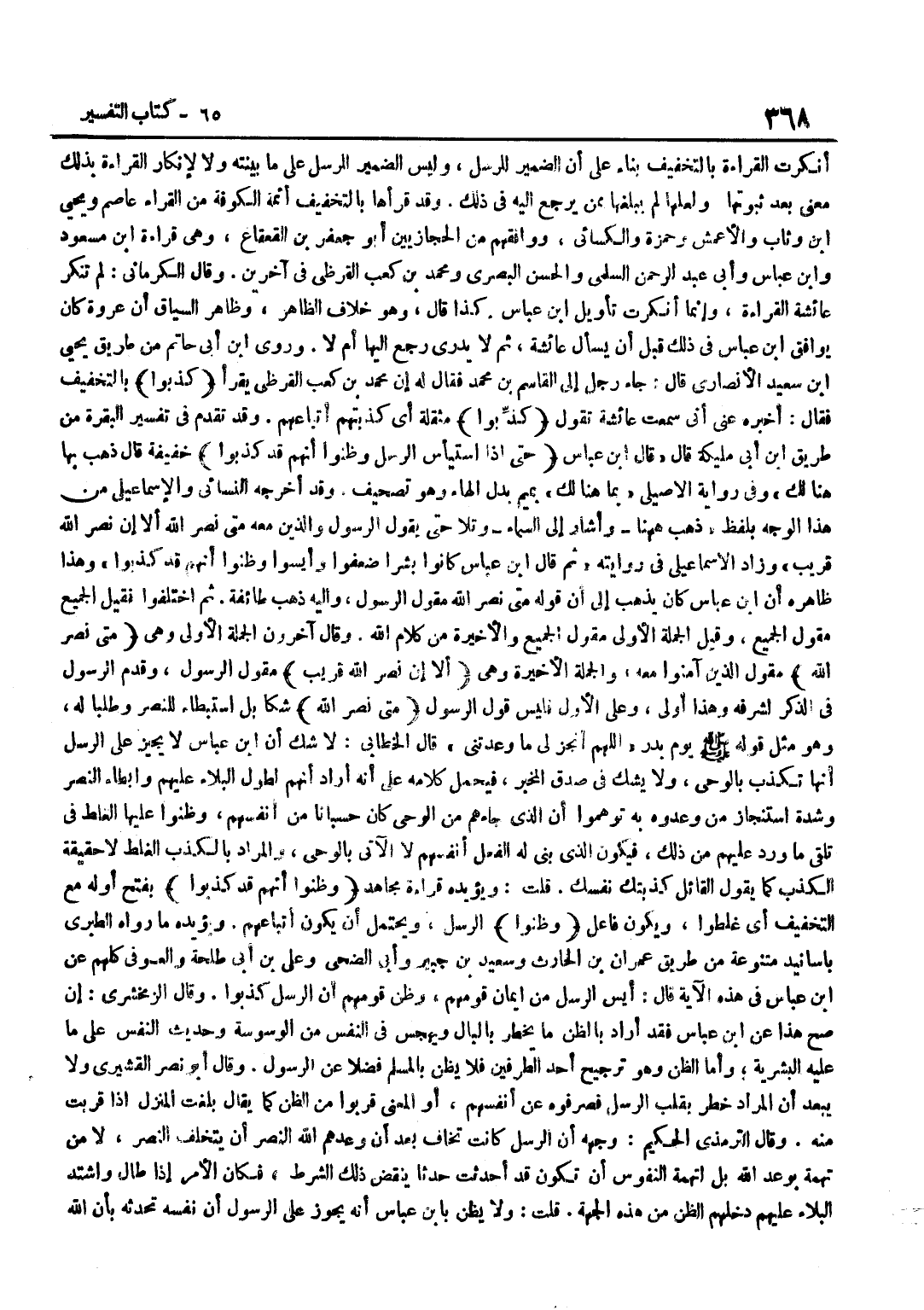 أَنْكَرَتِ الْقِرَاءَةَ بِالتَّخْفِيفِ بِنَاءً عَلَى أَنَّ الضَّمِيرَ لِلرُّسُلِ وَلَيْسَ الضَّمِيرُ لِلرُّسُلِ عَلَى مَا بَيَّنْتُهُ وَلَا لِإِنْكَارِ الْقِرَاءَةِ بِذَلِكَ مَعْنًى بَعْدَ ثُبُوتِهَا وَلَعَلَّهَا لَمْ يَبْلُغُهَا مِمَّنْ يُرْجَعُ إِلَيْهِ فِي ذَلِكَ وَقَدْ قَرَأَهَا بِالتَّخْفِيفِ أَئِمَّةُ الْكُوفَةِ مِنَ الْقُرَّاءِ عَاصِمٌ وَيَحْيَى بْنُ وَثَّابٍ وَالْأَعْمَشُ وَحَمْزَةُ وَالْكِسَائِيُّ وَوَافَقَهُمْ مِنَ الْحِجَازِيِّينَ أَبُو جَعْفَرِ بْنِ الْقَعْقَاع وَهِي قِرَاءَة بن مَسْعُود وبن عَبَّاسٍ وَأَبِي عَبْدِ الرَّحْمَنِ السُّلَمِيِّ وَالْحَسَنِ الْبَصْرِيِّ وَمُحَمَّدِ بْنِ كَعْبِ الْقُرَظِيِّ فِي آخَرِينَ وَقَالَ الْكَرْمَانِيُّ لَمْ تُنْكِرْ عَائِشَةُ الْقِرَاءَةَ وَإِنَّمَا أَنْكَرَتْ تَأْوِيل بن عَبَّاسٍ كَذَا قَالَ وَهُوَ خِلَافُ الظَّاهِرِ وَظَاهِرُ السِّيَاق أَن عُرْوَة كَانَ يُوَافق بن عَبَّاسٍ فِي ذَلِكَ قَبْلَ أَنْ يَسْأَلَ عَائِشَةَ ثُمَّ لَا يَدْرِي رَجَعَ إِلَيْهَا أَمْ لَا وروى بن أَبِي حَاتِمٍ مِنْ طَرِيقِ يَحْيَى بْنِ سَعِيدٍ الْأَنْصَارِيِّ قَالَ جَاءَ رَجُلٌ إِلَى الْقَاسِمِ بْنِ مُحَمَّدٍ فَقَالَ لَهُ إِنَّ مُحَمَّدَ بْنِ كَعْبٍ الْقُرَظِيَّ يَقْرَأُ كُذِبُوا بِالتَّخْفِيفِ فَقَالَ أَخْبِرْهُ عَنِّي أَنِّي سَمِعْتُ عَائِشَةَ تَقُولُ كُذِّبُوا مُثَقَّلَةٌ أَيْ كَذَّبَتْهُمْ أَتْبَاعُهُمْ وَقَدْ تَقَدَّمَ فِي تَفْسِيرِ الْبَقَرَةِ من طَرِيق بن أبي مليكَة قَالَ قَالَ بن عَبَّاس حَتَّى إِذا استيأس الرُّسُل وظنوا أَنهم قد كذبُوا خَفِيفَةٌ قَالَ ذَهَبَ بِهَا هُنَالِكَ وَفِي رِوَايَةِ الْأَصِيلِيِّ بِمَا هُنَالِكَ بِمِيمٍ بَدَلَ الْهَاءِ وَهُوَ تَصْحِيفٌ وَقَدْ أَخْرَجَهُ النَّسَائِيُّ وَالْإِسْمَاعِيلِيُّ مِنْ هَذَا الْوَجْه بِلَفْظ ذهب هَا هُنَا وَأَشَارَ إلىالسماء وتلا حَتَّى يَقُول الرَّسُول وَالَّذين مَعَهُ مَتَى نَصْرُ اللَّهِ أَلَا إِنَّ نَصْرَ الله قريب وَزَاد الْإِسْمَاعِيلِيّ فِي رِوَايَته ثمَّ قَالَ بن عَبَّاسٍ كَانُوا بَشَرًا ضَعُفُوا وَأَيِسُوا وَظَنُّوا أَنَّهُمْ قد كذبُوا وَهَذَا ظَاهره أَن بن عَبَّاسٍ كَانَ يَذْهَبُ إِلَى أَنَّ قَوْلَهُ مَتَى نَصْرُ اللَّهِ مَقُولُ الرَّسُولِ وَإِلَيْهِ ذَهَبَ طَائِفَةٌ ثُمَّ اخْتَلَفُوا فَقِيلَ الْجَمِيعُ مَقُولُ الْجَمِيعِ وَقِيلَ الْجُمْلَةُ الْأُولَى مَقُولُ الْجَمِيعِ وَالْأَخِيرَةُ مِنْ كَلَامِ اللَّهِ وَقَالَ آخَرُونَ الْجُمْلَةُ الْأُولَى وَهِيَ مَتَى نصر الله مَقُولُ الَّذِينَ آمَنُوا مَعَهُ وَالْجُمْلَةُ الْأَخِيرَةُ وَهِيَ الا أَن نصر الله قريب مَقُولُ الرَّسُولِ وَقُدِّمَ الرَّسُولُ فِي الذِّكْرِ لِشَرَفِهِ وَهَذَا أَوْلَى وَعَلَى الْأَوَّلِ فَلَيْسَ قَوْلُ الرَّسُولِ مَتى نصر الله شَكًّا بَلِ اسْتِبْطَاءً لِلنَّصْرِ وَطَلَبًا لَهُ وَهُوَ مِثْلُ قَوْلِهِ صَلَّى اللَّهُ عَلَيْهِ وَسَلَّمَ يَوْمَ بَدْرٍ اللَّهُمَّ أَنْجِزْ لِي مَا وَعَدْتَنِي قَالَ الْخطابِيّ لَا شكّ أَن بن عَبَّاسٍ لَا يُجِيزُ عَلَى الرُّسُلِ أَنَّهَا تُكَذِّبُ بِالْوَحْيِ وَلَا يُشَكُّ فِي صِدْقِ الْمُخْبِرِ فَيُحْمَلُ كَلَامه على أَنه أَرَادَ أَنهم لِطُولِ الْبَلَاءِ عَلَيْهِمْ وَإِبْطَاءِ النَّصْرِ وَشِدَّةِ اسْتِنْجَازِ مَنْ وَعَدُوهُ بِهِ تَوَهَّمُوا أَنَّ الَّذِي جَاءَهُمْ مِنَ الْوَحْيِ كَانَ حُسْبَانًا مِنْ أَنْفُسِهِمْ وَظَنُّوا عَلَيْهَا الْغَلَطَ فِي تَلَقِّي مَا وَرَدَ عَلَيْهِمْ مِنْ ذَلِكَ فَيَكُونُ الَّذِي بُنِيَ لَهُ الْفِعْلُ أَنْفُسُهُمْ لَا الْآتِي بِالْوَحْيِ وَالْمُرَادُ بِالْكَذِبِ الْغَلَطُ لَا حَقِيقَةُ الْكَذِبِ كَمَا يَقُولُ الْقَائِلُ كَذَبَتْكَ نَفْسُك