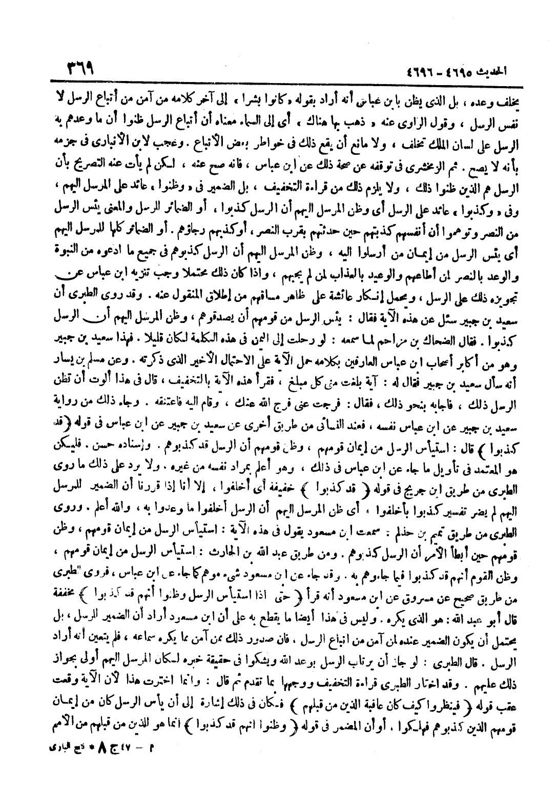 يُخْلِفُ وَعْدَهُ بَلِ الَّذِي يُظَنُّ بِابْنِ عَبَّاسٍ أَنَّهُ أَرَادَ بِقَوْلِهِ كَانُوا بَشَرًا إِلَى آخِرِ كَلَامِهِ مَنْ آمَنَ مِنْ أَتْبَاعِ الرُّسُلِ لَا نَفْسِ الرُّسُلِ وَقَوْلُ الرَّاوِي عَنْهُ ذَهَبَ بِهَا هُنَاكَ أَيْ إِلَى السَّمَاءِ مَعْنَاهُ أَنَّ أَتْبَاعَ الرُّسُلِ ظَنُّوا أَنَّ مَا وَعَدَهُمْ بِهِ الرُّسُلُ عَلَى لِسَانِ الْمَلِكِ تَخَلَّفَ وَلَا مَانِعَ أَنْ يَقَعَ ذَلِكَ فِي خَوَاطِرِ بَعْضِ الْأَتْبَاعِ وَعَجَبٌ لِابْنِ الْأَنْبَارِيِّ فِي جَزْمِهِ بِأَنَّهُ لَا يَصِحُّ ثُمَّ الزَّمَخْشَرِيُّ فِي تَوَقُّفِهِ عَنْ صِحَّةِ ذَلِكَ عَن بن عَبَّاسٍ فَإِنَّهُ صَحَّ عَنْهُ لَكِنْ لَمْ يَأْتِ عَنْهُ التَّصْرِيحُ بِأَنَّ الرُّسُلَ هُمُ الَّذِينَ ظَنُّوا ذَلِكَ وَلَا يَلْزَمُ ذَلِكَ مِنْ قِرَاءَةِ التَّخْفِيفِ بَلِ الضَّمِيرُ فِي وَظَنُّوا عَائِدٌ عَلَى الْمُرْسَلِ إِلَيْهِمْ وَفِي وَكُذِبُوا عَائِدٌ عَلَى الرُّسُلِ أَيْ وَظَنَّ الْمُرْسَلُ إِلَيْهِمْ أَنَّ الرُّسُلَ كُذِبُوا أَوِ الضَّمَائِرُ لِلرُّسُلِ وَالْمَعْنَى يَئِسَ الرُّسُلُ مِنَ النَّصْرِ وَتَوَهَّمُوا أَنَّ أَنْفُسَهُمْ كَذَبَتْهُمْ حِينَ حَدَّثَتْهُمْ بِقُرْبِ النَّصْرِ أَوْ كَذَبَهُمْ رَجَاؤُهُمْ أَوِ الضَّمَائِرُ كُلُّهَا لِلْمُرْسَلِ إِلَيْهِمْ أَيْ يَئِسَ الرُّسُلُ مِنْ إِيمَانِ مَنْ أُرْسِلُوا إِلَيْهِ وَظَنَّ الْمُرْسَلُ إِلَيْهِمْ أَنَّ الرُّسُلَ كَذَّبُوهُمْ فِي جَمِيعِ مَا ادَّعُوهُ مِنَ النُّبُوَّةِ وَالْوَعْدِ بِالنَّصْرِ لِمَنْ أَطَاعَهُمْ وَالْوَعِيدِ بِالْعَذَابِ لِمَنْ لَمْ يُجِبْهُمْ وَإِذَا كَانَ ذَلِكَ مُحْتَمَلًا وَجب تَنْزِيه بن عَبَّاسٍ عَنْ تَجْوِيزِهِ ذَلِكَ عَلَى الرُّسُلِ وَيُحْمَلُ إِنْكَارُ عَائِشَةَ عَلَى ظَاهِرِ مَسَاقِهِمْ مِنْ إِطْلَاقِ الْمَنْقُولِ عَنْهُ وَقَدْ رَوَى الطَّبَرِيُّ أَنَّ سَعِيدَ بْنَ جُبَيْرٍ سُئِلَ عَنْ هَذِهِ الْآيَةِ فَقَالَ يَئِسَ الرُّسُلُ مِنْ قَوْمِهِمْ أَنْ يُصَدِّقُوهُمْ وَظَنَّ الْمُرْسَلُ إِلَيْهِمْ أَنَّ الرُّسُلَ كَذَبُوا فَقَالَ الضَّحَّاكُ بْنُ مُزَاحِمٍ لَمَّا سَمِعَهُ لَوْ رَحَلْتُ إِلَى الْيَمَنِ فِي هَذِهِ الْكَلِمَةِ لَكَانَ قَلِيلًا فَهَذَا سَعِيدُ بْنُ جُبَيْرٍ وَهُوَ مِنْ أَكَابِرَ أَصْحَابِ بن عَبَّاسٍ الْعَارِفِينَ بِكَلَامِهِ حَمَلَ الْآيَةَ عَلَى الِاحْتِمَالِ الْأَخِيرِ الَّذِي ذَكَرْتُهُ وَعَنْ مُسْلِمِ بْنِ يَسَارٍ أَنَّهُ سَأَلَ سَعِيدَ بْنِ جُبَيْرٍ فَقَالَ لَهُ آيَةٌ بَلَغَتْ مِنِّي كُلَّ مَبْلَغٍ فَقَرَأَ هَذِهِ الْآيَةَ بِالتَّخْفِيفِ قَالَ فِي هَذَا أَلَوْتَ أَنْ تَظُنَّ الرُّسُلُ ذَلِكَ فَأَجَابَهُ بِنَحْوِ ذَلِكَ فَقَالَ فَرَّجْتَ عَنِّي فَرَّجَ اللَّهُ عَنْكَ وَقَامَ إِلَيْهِ فَاعْتَنَقَهُ وَجَاءَ ذَلِكَ مِنْ رِوَايَةِ سَعِيدِ بْنِ جُبَير عَن بن عَبَّاسٍ نَفْسِهِ فَعِنْدَ النَّسَائِيِّ مِنْ طَرِيقٍ أُخْرَى عَنْ سَعِيدِ بْنِ جُبَيْرٍ عَن بن عَبَّاسٍ فِي قَوْلِهِ قَدْ كُذِبُوا قَالَ اسْتَيْأَسَ الرُّسُلُ مِنْ إِيمَانِ قَوْمِهِمْ وَظَنَّ قَوْمُهُمْ أَنَّ الرُّسُلَ قَدْ كَذَبُوهُمْ وَإِسْنَادُهُ حَسَنٌ فَلْيَكُنْ هُوَ الْمُعْتَمد فِي تَأْوِيل مَا جَاءَ عَن بن عَبَّاسٍ فِي ذَلِكَ وَهُوَ أَعْلَمُ بِمُرَادِ نَفْسِهِ مِنْ غَيْرِهِ وَلَا يَرِدُ عَلَى ذَلِكَ مَا روى الطَّبَرِيّ من طَرِيق بن جُرَيْجٍ فِي قَوْلِهِ قَدْ كُذِبُوا خَفِيفَةٌ أَيْ أَخْلَفُوا أَلَا إِنَّا إِذَا قَرَّرْنَا أَنَّ الضَّمِيرَ لِلْمُرْسَلِ إِلَيْهِمْ لَمْ يَضُرَّ تَفْسِيرَ كُذِبُوا بِأَخْلَفُوا أَيْ ظَنَّ الْمُرْسَلُ إِلَيْهِمْ أَنَّ الرُّسُلَ أَخْلَفُوا مَا وَعَدُوا بِهِ وَاللَّهُ أَعْلَمُ وَرَوَى الطَّبَرِيُّ من طَرِي
