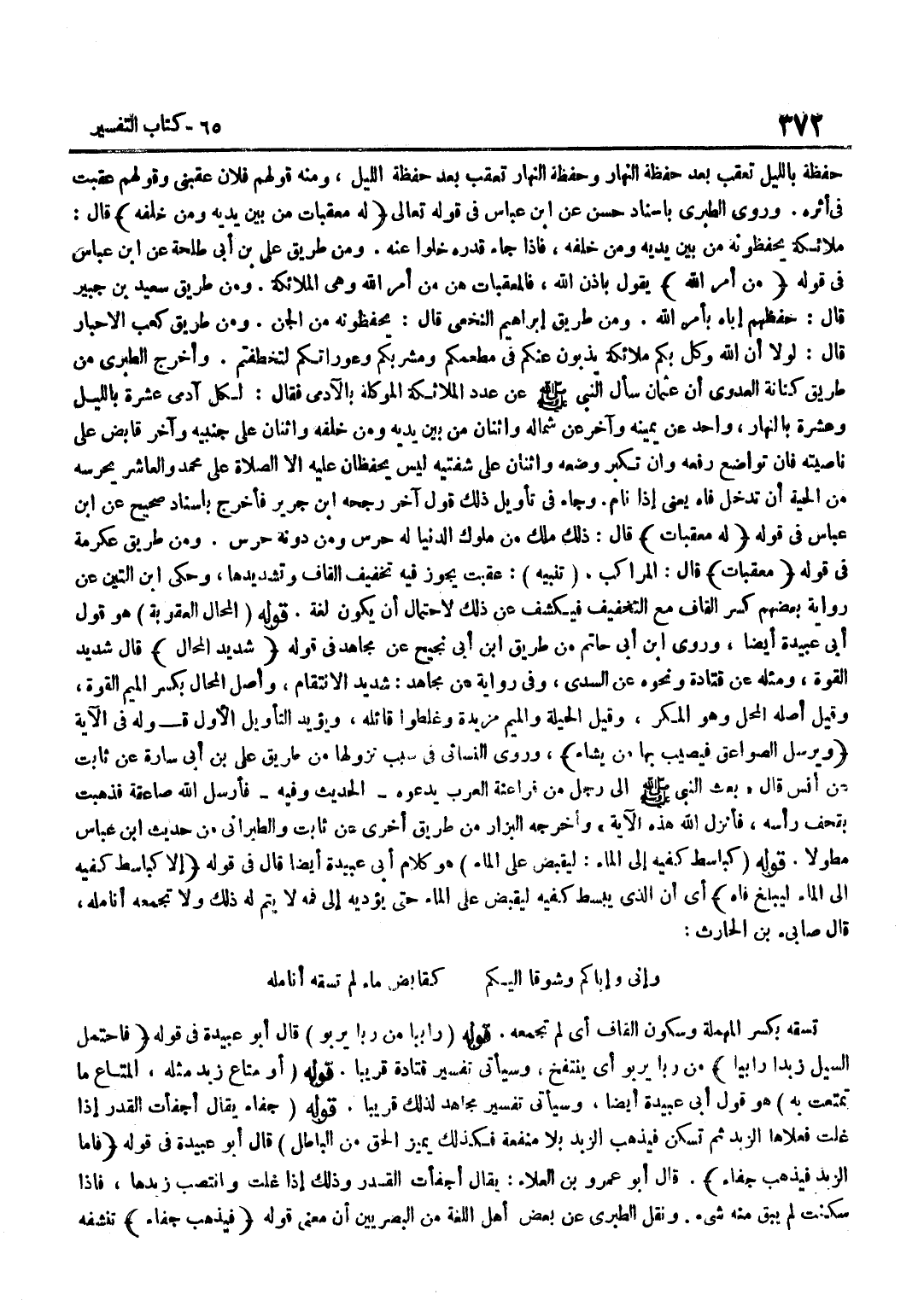 حَفَظَةٌ بِاللَّيْلِ تُعَقِّبُ بَعْدَ حَفَظَةِ النَّهَارِ وَحَفَظَةُ النَّهَارِ تُعَقِّبُ بَعْدَ حَفَظَةِ اللَّيْلِ وَمِنْهُ قَوْلُهُمْ فُلَانٌ عَقَّبَنِي وَقَوْلُهُمْ عَقَّبْتُ فِي أَثَرِهِ وَرَوَى الطَّبَرِيّ بِإِسْنَاد حسن عَن بن عَبَّاسٍ فِي قَوْلِهِ تَعَالَى لَهُ مُعَقِّبَاتٌ مِنْ بَين يَدَيْهِ وَمن خَلفه قَالَ مَلَائِكَةٌ يَحْفَظُونَهُ مِنْ بَيْنَ يَدَيْهِ وَمِنْ خَلْفِهِ فَإِذَا جَاءَ قَدَرُهُ خَلَوْا عَنْهُ وَمِنْ طَرِيقِ عَلِيِّ بْنِ أَبِي طَلْحَةَ عَنِ بْنِ عَبَّاس فِي قَوْله من أَمر الله يَقُولُ بِإِذْنِ اللَّهِ فَالْمُعَقِّبَاتُ هُنَّ مِنْ أَمْرِ اللَّهِ وَهِيَ الْمَلَائِكَةُ وَمِنْ طَرِيقِ سَعِيدِ بْنِ جُبَيْرٍ قَالَ حِفْظُهُمْ إِيَّاهُ بِأَمْرِ اللَّهِ وَمِنْ طَرِيقِ إِبْرَاهِيمَ النَّخَعِيِّ قَالَ يَحْفَظُونَهُ مِنَ الْجِنِّ وَمِنْ طَرِيقِ كَعْبِ الْأَحْبَارِ قَالَ لَوْلَا أَنَّ اللَّهَ وَكَّلَ بِكُمْ مَلَائِكَةً يَذُبُّونَ عَنْكُمْ فِي مَطْعَمِكُمْ وَمَشْرَبِكُمْ وَعَوْرَاتِكُمْ لَتُخُطِّفْتُمْ وَأَخْرَجَ الطَّبَرِيُّ مِنْ طَرِيقِ كِنَانَةِ الْعَدَوِيِّ أَنَّ عُثْمَانَ سَأَلَ النَّبِيَّ صَلَّى اللَّهُ عَلَيْهِ وَسَلَّمَ عَنِ عَدَدِ الْمَلَائِكَةِ الْمُوَكَّلَةِ بِالْآدَمِيِّ فَقَالَ لِكُلِّ آدَمِيٌّ عَشَرَةٌ بِاللَّيْلِ وَعَشَرَةٌ بِالنَّهَارِ وَاحِدٌ عَنْ يَمِينِهِ وَآخَرُ عَنْ شِمَالِهِ وَاثْنَانِ مِنْ بَيْنِ يَدَيْهِ وَمِنْ خَلْفِهِ وَاثْنَانِ عَلَى جَنْبَيْهِ وَآخَرُ قَابِضٌ عَلَى نَاصِيَتِهِ فَإِنْ تَوَاضَعَ رَفَعَهُ وَإِنْ تَكَبَّرَ وَضَعَهُ وَاثْنَانِ عَلَى شَفَتَيْهِ لَيْسَ يَحْفَظَانِ عَلَيْهِ إِلَّا الصَّلَاةَ عَلَى مُحَمَّدٍ وَالْعَاشِرُ يَحْرُسُهُ مِنَ الْحَيَّةِ أَنْ تَدْخُلَ فَاهُ يَعْنِي إِذَا نَامَ وَجَاءَ فِي تَأْوِيل ذَلِك قَول آخر رَجحه بن جرير فَأخْرج بِإِسْنَاد صَحِيح عَن بن عَبَّاس فِي قَوْله لَهُ مُعَقِّبَات قَالَ ذَلِكَ مَلِكٌ مِنْ مُلُوكِ الدُّنْيَا لَهُ حَرَسٌ وَمِنْ دُونِهِ حَرَسٌ وَمِنْ طَرِيقِ عِكْرِمَةَ فِي قَوْلِهِ مُعَقِّبَاتٌ قَالَ الْمَرَاكِبُ تَنْبِيهٌ عَقَّبْتُ يجوز فِيهِ تَخْفيف الْقَاف وتشديدها وَحكى بن التِّينِ عَنْ رِوَايَةِ بَعْضِهِمْ كَسْرُ الْقَافِ مَعَ التَّخْفِيفِ فَيَكْشِفُ عَنْ ذَلِكَ لِاحْتِمَالِ أَنْ يَكُونَ لُغَةً قَوْلُهُ الْمِحَالُ الْعُقُوبَةُ هُوَ قَوْلُ أَبِي عُبَيْدَة أَيْضا وروى بن أبي حَاتِم من طَرِيق بن أَبِي نَجِيحٍ عَنْ مُجَاهِدٍ فِي قَوْلِهِ شَدِيدُ الْمحَال قَالَ شَدِيدُ الْقُوَّةِ وَمِثْلَهُ عَنْ قَتَادَةَ وَنَحْوَهُ عَنِ السُّدِّيِّ وَفِي رِوَايَةٍ عَنْ مُجَاهِدٍ شَدِيدُ الِانْتِقَامِ وَأَصْلُ الْمِحَالِ بِكَسْرِ الْمِيمِ الْقُوَّةُ وَقِيلَ أَصْلُهُ الْمَحْلُ وَهُوَ الْمَكْرُ وَقِيلَ الْحِيلَةُ وَالْمِيمُ مَزِيدَةٌ وَغَلَّطُوا قَائِلُهُ وَيُؤَيِّدُ التَّأْوِيلَ الْأَوَّلَ قَوْلُهُ فِي الْآيَةِ وَيُرْسِلُ الصَّوَاعِقَ فَيُصِيبُ بِهَا مَنْ يَشَاء وَرَوَى النَّسَائِيُّ فِي سَبَبِ نُزُولِهَا مِنْ طَرِيقِ عَلِيِّ بْنِ أَبِي سَارَّةَ عَنْ ثَابِتٍ عَنْ أَنَسٍ قَالَ بَعَثَ النَّبِيُّ صَلَّى اللَّهُ عَلَيْهِ وَسَلَّمَ إِلَى رَجُلٍ مِنْ فَرَاعِنَةِ الْعَرَبِ يَدْعُوهُ الْحَدِيثَ وَفِيهِ فَأَرْسَلَ اللَّهُ صَاعِقَةً فَذَهَبَتْ بِقَحْفِ رَأْسِهِ فَأَنْزَلَ اللَّهُ هَذِهِ الْآيَةَ وَأَخْرَجَهُ الْبَزَّارُ مِنْ طَرِيقِ أُخْرَى عَنْ ثَابِتٍ وَالطَّبَرَانِيِّ مِنْ حَدِيث بن عَبَّاسٍ مُطَوَّلًا قَوْلُهُ كَبَاسِطِ كَفَّيْهِ إِلَى الْمَاءِ لِيَقْبِضَ عَلَى الْمَاءِ هُوَ كَلَامُ أَبِي عُبَيْدَةَ أَيْضًا قَالَ فِي قَوْلِهِ إِلَّا كَبَاسِطِ كَفَّيْهِ إِلَى المَاء ليبلغ فَاه أَ