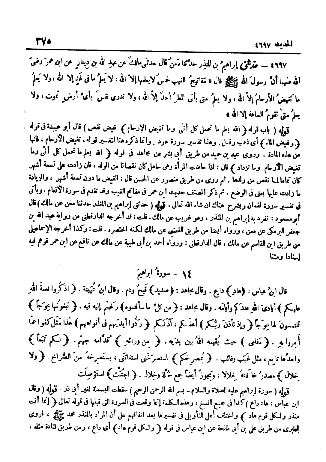 غِيضَ نَقَصَ قَالَ أَبُو عُبَيْدَةَ فِي قَوْلِهِ وغيض المَاء أَيْ ذَهَبَ وَقَلَّ وَهَذَا تَفْسِيرُ سُورَةِ هُودٍ وَإِنَّمَا ذَكَرَهُ هُنَا لِتَفْسِيرِ قَوْلِهِ تَغِيضُ الْأَرْحَامُ فَإِنَّهَا مِنْ هَذِهِ الْمَادَّةِ وَرَوَى عَبْدُ بْنُ حُمَيْدٍ مِنْ طَرِيقِ أَبِي بِشْرٍ عَنْ مُجَاهِدٍ فِي قَوْلِهِ اللَّهُ يَعْلَمُ مَا تَحْمِلُ كُلُّ أُنْثَى وَمَا تغيض الْأَرْحَام وَمَا تزداد قَالَ إِذَا حَاضَتِ الْمَرْأَةُ وَهِيَ حَامِلٌ كَانَ نُقْصَانًا مِنَ الْوَلَدِ فَإِنْ زَادَتْ عَلَى تِسْعَةِ أَشْهُرٍ كَانَ تَمَامًا لِمَا نَقَصَ مِنْ وَلَدِهَا ثُمَّ رُوِيَ مِنْ طَرِيقِ مَنْصُورٍ عَنِ الْحَسَنِ قَالَ الْغِيضُ مَا دُونَ تِسْعَةِ أَشْهُرٍ وَالزِّيَادَةُ مَا زَادَتْ عَلَيْهَا يَعْنِي فِي الْوَضْعِ ثُمَّ ذكر المُصَنّف حَدِيث بن عُمَرَ فِي مَفَاتِحِ الْغَيْبِ وَقَدْ تَقَدَّمَ فِي سُورَة الْأَنْعَام وَيَأْتِي فِي تَفْسِيرُ سُورَةِ لُقْمَانَ وَيُشْرَحُ هُنَاكَ إِنْ شَاءَ اللَّهُ تَعَالَى