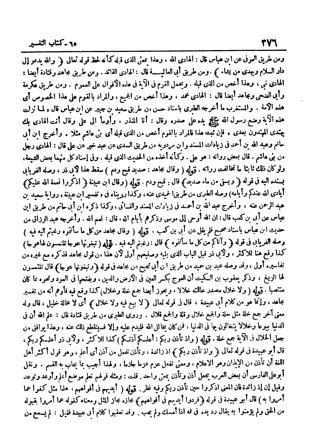 وَمن طَرِيق الْعَوْفِيّ عَن بن عَبَّاسٍ قَالَ الْهَادِي اللَّهُ وَهَذَا بِمَعْنَى الَّذِي قَبْلَهُ كَأَنَّهُ لَحَظَ قَوْلَهُ تَعَالَى وَاللَّهُ يَدْعُو إِلَى دَار السَّلَام وَيهْدِي من يَشَاء وَمِنْ طَرِيقِ أَبِي الْعَالِيَةِ قَالَ الْهَادِي الْقَائِدُ وَمِنْ طَرِيقِ مُجَاهِدٍ وَقَتَادَةَ أَيْضًا الْهَادِي نَبِيٌّ وَهَذَا أَخَصُّ مِنَ الَّذِي قَبْلَهُ وَيُحْمَلُ الْقَوْمُ فِي الْآيَةِ فِي هَذِهِ الْأَقْوَالِ عَلَى الْعُمُومِ وَمِنْ طَرِيقِ عِكْرِمَةَ وَأَبِي الضُّحَى وَمُجَاهِدٍ أَيْضًا قَالَ الْهَادِي مُحَمَّدٌ وَهَذَا أَخَصُّ مِنَ الْجَمِيعِ وَالْمُرَادُ بِالْقَوْمِ عَلَى هَذَا الْخُصُوصِ أَيْ هَذِهِ الْأُمَّةِ وَالْمُسْتَغْرَبُ مَا أَخْرَجَهُ الطَّبَرِيُّ بِإِسْنَادٍ حَسَنٍ مِنْ طَرِيقِ سَعِيدِ بْنِ جُبَيْرٍ عَنِ بن عَبَّاسٍ قَالَ لَمَّا نَزَلَتْ هَذِهِ الْآيَةُ وَضَعَ رَسُولُ اللَّهِ صَلَّى اللَّهُ عَلَيْهِ وَسَلَّمَ يَدَهُ عَلَى صَدْرِهِ وَقَالَ أَنَا الْمُنْذِرُ وَأَوْمَأَ إِلَى عَلِيٍّ وَقَالَ أَنْتَ الْهَادِي بِكَ يَهْتَدِي الْمُهْتَدُونَ بَعْدِي فَإِنْ ثَبَتَ هَذَا فَالْمُرَادُ بِالْقَوْمِ أَخَصُّ مِنَ الَّذِي قَبْلَهُ أَيْ بَنِي هَاشِمٍ مَثَلًا وَأخرج بن أَبِي حَاتِمٍ وَعَبْدُ اللَّهِ بْنُ أَحْمَدَ فِي زِيَادَاتِ الْمُسْنَدِ وبن مَرْدَوَيْهِ مِنْ طَرِيقِ السُّدِّيِّ عَنْ عَبْدِ خَيْرٍ عَنْ عَلِيٍّ قَالَ الْهَادِي رَجُلٌ مِنْ بَنِي هَاشِمٍ قَالَ بَعْضُ رُوَاتِهِ هُوَ عَلِيٌّ وَكَأَنَّهُ أَخَذَهُ مِنَ الْحَدِيثِ الَّذِي قَبْلَهُ وَفِي إِسْنَادِ كُلٍّ مِنْهُمَا بَعْضُ الشِّيعَةِ وَلَوْ كَانَ ذَلِكَ ثَابِتًا مَا تَخَالَفَتْ رُوَاتُهُ قَوْلُهُ وَقَالَ مُجَاهِدٌ صَدِيدٌ قَيْحٌ وَدَمٌ سَقَطَ هَذَا لِأَبِي ذَرٍّ وَصَلَهُ الْفِرْيَابِيُّ بِسَنَدِهِ إِلَيْهِ فِي قَوْلِهِ وَيُسْقَى من مَاء صديد قَالَ قيح وَدم قَوْله وَقَالَ بن عُيَيْنَة اذْكروا نعْمَة الله عَلَيْكُم أَيَادِيَ اللَّهِ عِنْدَكُمْ وَأَيَّامَهُ وَصَلَهُ الطَّبَرِيُّ مِنْ طَرِيقِ الْحُمَيْدِيِّ عَنْهُ وَكَذَا رَوَيْنَاهُ فِي تَفْسِيرِ بن عُيَيْنَةَ رِوَايَةَ سَعِيدِ بْنِ عَبْدِ الرَّحْمَنِ عَنْهُ وَأَخْرَجَ عَبْدُ اللَّهِ بْنُ أَحْمَدَ فِي زِيَادَاتِ الْمُسْنَدِ وَالنَّسَائِيّ وَكَذَا ذكره بن أبي حَاتِم من طَرِيق بن عَبَّاسٍ عَنْ أُبَيِّ بْنِ كَعْبٍ قَالَ إِنَّ اللَّهَ أَوْحَى إِلَى مُوسَى وَذَكَّرَهُمْ بِأَيَّامِ اللَّهِ قَالَ نِعَمِ اللَّهِ وَأَخْرَجَهُ عَبْدُ الرَّزَّاقِ مِنْ حَدِيث بن عَبَّاسٍ بِإِسْنَادٍ صَحِيحٍ فَلَمْ يَقُلْ عَنْ أُبَيِّ بْنِ كَعْبٍ قَوْلُهُ وَقَالَ مُجَاهِدٌ مِنْ كُلِّ مَا سَأَلْتُمُوهُ رَغِبْتُمْ إِلَيْهِ فِيهِ وَصَلَهُ الْفِرْيَابِيُّ فِي قَوْلِهِ وَآتَاكُمْ مِنْ كُلِّ مَا سَأَلْتُمُوهُ قَالَ رَغِبْتُمْ إِلَيْهِ فِيهِ قَوْلُهُ تَبْغُونَهَا عِوَجًا تَلْتَمِسُونَ لَهَا عِوَجًا كَذَا وَقَعَ هُنَا لِلْأَكْثَرِ وَلِأَبِي ذَرٍّ قَبْلَ الْبَابِ الَّذِي يَلِيهِ وَصَنِيعِهِمْ أَوْلَى لِأَنَّ هَذَا مِنْ قَوْلِ مُجَاهِدٍ فَذِكْرُهُ مَعَ غَيْرِهِ مِنْ تَفَاسِيرِهِ أَوْلَى وَقَدْ وَصَلَهُ عَبْدُ بْنُ حُمَيْدٍ مِنْ طَرِيقِ بن أبي نَجِيحٍ عَنْ مُجَاهِدٍ فِي قَوْلِهِ وَتَبْغُونَهَا عِوَجًا قَالَ تَلْتَمِسُونَ لَهَا الزَّيْغَ وَذَكَرَ يَعْقُوبُ بْنُ السِّكِّيتِ أَنَّ الْعِوَجَ بِكَسْرِ الْعَيْنِ فِي الْأَرْضِ وَالدِّينِ وَبِفَتْحِهَا فِي الْعَوْدِ وَنَحْوَهُ مِمَّا كَانَ مُنْتَصِبًا قَوْلُهُ وَلَا خِلَالَ مَصْدَرُ خَالَلْتُهُ خِلَالًا وَيَجُوزُ أَيْضًا جَمْعُ خُلَّةٍ وَخِلَالِ كَذَا وَقَعَ فِيهِ فَأَوْهَمَ أَنَّهُ مِنْ تَفْسِيرِ مُجَاهِدٍ وَإِنَّمَا هُوَ مِنْ كَلَامِ أَب
