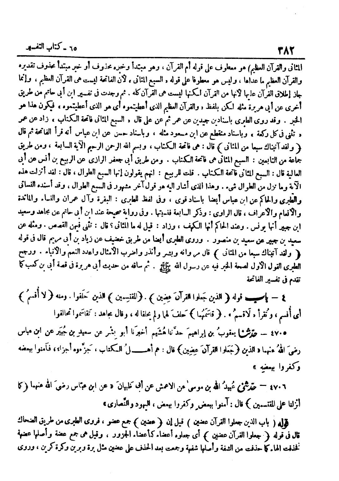 الْمَثَانِي وَالْقُرْآنُ الْعَظِيمُ هُوَ مَعْطُوفٌ عَلَى قَوْلِهِ أَمُّ الْقُرْآنِ وَهُوَ مُبْتَدَأٌ وَخَبَرُهُ مَحْذُوفٌ أَوْ خَبَرُ مُبْتَدَأٍ مَحْذُوفٍ تَقْدِيرُهُ وَالْقُرْآنَ الْعَظِيمَ مَا عَدَاهَا وَلَيْسَ هُوَ مَعْطُوفًا عَلَى قَوْلِهِ السَّبْعُ الْمَثَانِي لِأَنَّ الْفَاتِحَةَ لَيْسَتْ هِيَ الْقُرْآنَ الْعَظِيمَ وَإِنَّمَا جَازَ إِطْلَاقُ الْقُرْآنِ عَلَيْهَا لِأَنَّهَا مِنَ الْقُرْآنِ لَكِنَّهَا لَيْسَتْ هِيَ الْقُرْآنَ كُلَّهَ ثُمَّ وجدت فِي تَفْسِير بن أَبِي حَاتِمٍ مِنْ طَرِيقٍ أُخْرَى عَنْ أَبِي هُرَيْرَةَ مِثْلَهُ لَكِنْ بِلَفْظِ وَالْقُرْآنِ الْعَظِيمِ الَّذِي أُعْطِيتُمُوهُ أَيْ هُوَ الَّذِي أُعْطِيتُمُوهُ فَيَكُونُ هَذَا هُوَ الْخَبَرُ وَقَدْ رَوَى الطَّبَرِيُّ بِإِسْنَادَيْنِ جَيِّدَيْنِ عَن عمر ثمَّ عَن عَلِيٍّ قَالَ السَّبْعُ الْمَثَانِي فَاتِحَةُ الْكِتَابِ زَادَ عَنْ عُمَرَ تُثَنَّى فِي كُلِّ رَكْعَةٍ وَبِإِسْنَادٍ مُنْقَطع عَن بن مَسْعُود مثله وباسناد حسن عَن بن عَبَّاسٍ أَنَّهُ قَرَأَ الْفَاتِحَةَ ثُمَّ قَالَ وَلَقَدْ آتيناك سبعا من المثاني قَالَ هِيَ فَاتِحَةُ الْكِتَابِ وَبِسْمِ اللَّهِ الرَّحْمَنِ الرَّحِيمِ الْآيَةُ السَّابِعَةُ وَمِنْ طَرِيقِ جَمَاعَةٍ مِنَ التَّابِعِينَ السَّبْعُ الْمَثَانِي هِيَ فَاتِحَةُ الْكِتَابِ وَمِنْ طَرِيقِ أَبِي جَعْفَرٍ الرَّازِيُّ عَنِ الرَّبِيعِ بْنِ أَنَسٍ عَنْ أَبِي الْعَالِيَةِ قَالَ السَّبْعُ الْمَثَانِي فَاتِحَةُ الْكِتَابِ قُلْتُ لِلرَّبِيعِ إِنَّهُمْ يَقُولُونَ إِنَّهَا السَّبْعُ الطِّوَالُ قَالَ لَقَدْ أُنْزِلَتْ هَذِهِ الْآيَةُ وَمَا نَزَلَ مِنَ الطِّوَالِ شَيْءٌ وَهَذَا الَّذِي أَشَارَ إِلَيْهِ هُوَ قَوْلٌ آخَرُ مَشْهُورٌ فِي السَّبْعِ الطِّوَالِ وَقَدْ أَسْنَدَهُ النَّسَائِيُّ وَالطَّبَرِيُّ وَالْحَاكِمُ عَن بن عَبَّاسٍ أَيْضًا بِإِسْنَادٍ قَوِيٍّ وَفِي لَفْظٍ لِلطَّبَرِيِّ الْبَقَرَةُ وَآلُ عِمْرَانَ وَالنِّسَاءُ وَالْمَائِدَةُ وَالْأَنْعَامُ وَالْأَعْرَافُ قَالَ الرَّاوِي وَذكر السَّابِعَة فنسيتها وَفِي رِوَايَة صَحِيحَة عِنْد بن أَبِي حَاتِمٍ عَنْ مُجَاهِدٍ وَسَعِيدِ بْنِ جُبَيْرٍ أَنَّهَا يُونُسُ وَعِنْدَ الْحَاكِمِ أَنَّهَا الْكَهْفُ وَزَادَ قِيلَ لَهُ مَا الْمَثَانِي قَالَ تُثَنَّى فِيهِنَّ الْقَصَصُ وَمِثْلُهُ عَنْ سَعِيدِ بْنِ جُبَيْرٍ عَنْ سَعِيدِ بْنِ مَنْصُورٍ وَرَوَى الطَّبَرِيُّ أَيْضًا مِنْ طَرِيقِ خُضَيْفٍ عَنْ زِيَادِ بْنِ أَبِي مَرْيَمَ قَالَ فِي قَوْلِهِ وَلَقَدْ آتَيْنَاكَ سَبْعًا مِنَ المثاني قَالَ مُرْ وَانْهَ وَبَشِّرْ وَأَنْذِرْ وَاضْرِبِ الْأَمْثَالَ وَاعْدُدِ النِّعَمَ وَالْأَنْبَاءَ وَرَجَّحَ الطَّبَرِيُّ الْقَوْلَ الْأَوَّلَ لِصِحَّةِ الْخَبَرِ فِيهِ عَنْ رَسُولِ اللَّهِ صَلَّى اللَّهُ عَلَيْهِ وَسَلَّمَ ثُمَّ سَاقَهُ مِنْ حَدِيثِ أَبِي هُرَيْرَةَ فِي قِصَّةِ أُبَيِّ بْنِ كَعْبٍ كَمَا تقدم فِي تَفْسِير الْفَاتِحَة