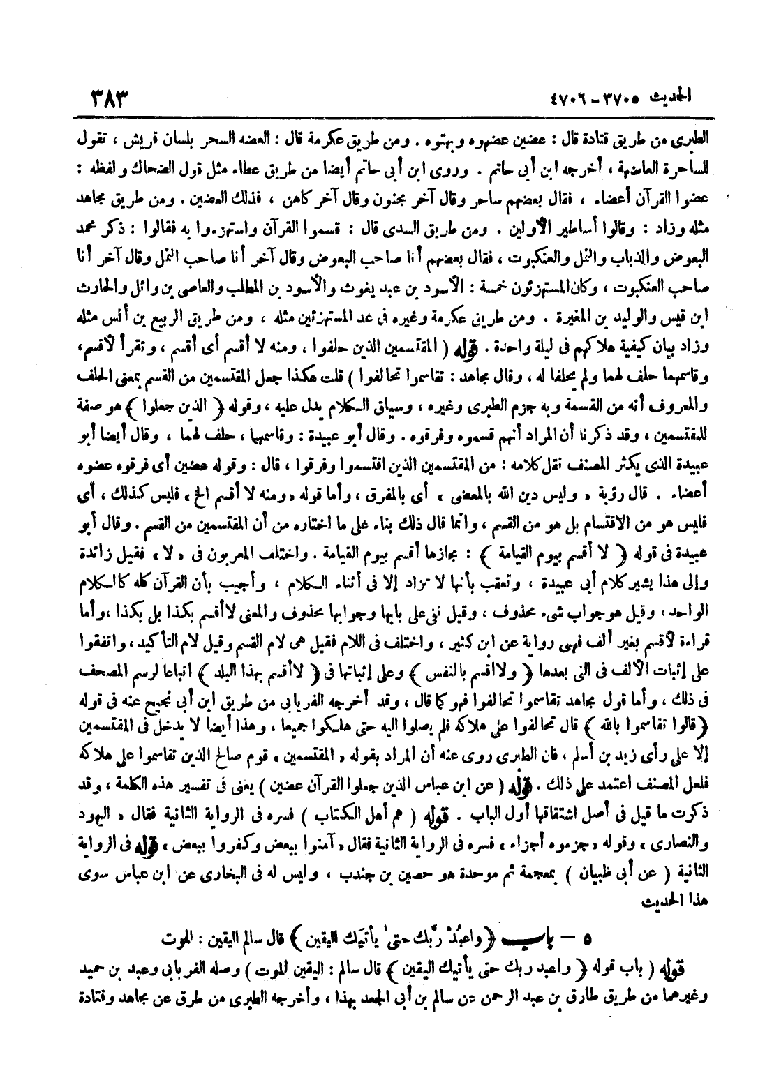 [4705] الَّذِينَ جَعَلُوا هُوَ صِفَةٌ لِلْمُقْتَسِمِينَ وَقَدْ ذَكَرْنَا أَنَّ الْمُرَادَ أَنَّهُمْ قَسَمُوهُ وَفَرَّقُوهُ وَقَالَ أَبُو عُبَيْدَةَ وَقَاسَمَهُمَا حَلَفَ لَهُمَا وَقَالَ أَيْضًا أَبُو عُبَيْدَةَ الَّذِي يُكْثِرُ الْمُصَنِّفُ نَقْلَ كَلَامِهِ مِنَ الْمُقْتَسِمِينَ الَّذِينَ اقْتَسَمُوا وَفَرَّقُوا قَالَ وَقَوْلُهُ عِضِينَ أَيْ فَرَّقُوهُ عَضُّوهُ أَعْضَاءً قَالَ رُؤْبَةُ وَلَيْسَ دِينُ اللَّهِ بِالْمُعَضَّى أَيْ بِالْمُفَرَّقِ وَأَمَّا قَوْلُهُ وَمِنْهُ لَا أُقْسِمُ إِلَخْ فَلَيْسَ كَذَلِكَ أَيْ فَلَيْسَ هُوَ مِنَ الِاقْتِسَامِ بَلْ هُوَ مِنَ الْقَسَمِ وَإِنَّمَا قَالَ ذَلِكَ بِنَاءً عَلَى مَا اخْتَارَهُ مِنْ أَنَّ الْمُقْتَسِمِينَ مِنَ الْقَسْمِ وَقَالَ أَبُو عُبَيْدَةَ فِي قَوْلِهِ لَا أقسم بِيَوْم الْقِيَامَة مَجَازُهَا أُقْسِمُ بِيَوْمِ الْقِيَامَةِ وَاخْتَلَفَ الْمُعْرِبُونَ فِي لَا فَقِيلَ زَائِدَةٌ وَإِلَى هَذَا يُشِيرُ كَلَامُ أَبِي عُبَيْدَةَ وَتُعُقِّبَ بِأَنَّهَا لَا تُزَادُ إِلَّا فِي أَثْنَاءِ الْكَلَامِ وَأُجِيبُ بِأَنَّ الْقُرْآنَ كُلَّهُ كَالْكَلَامِ الْوَاحِدِ وَقِيلَ هُوَ جَوَابُ شَيْءٍ مَحْذُوفٍ وَقِيلَ نَفْيٌ عَلَى بَابِهَا وَجَوَابُهَا مَحْذُوفٌ وَالْمَعْنَى لَا أُقْسِمُ بِكَذَا بَلْ بِكَذَا وَأَمَّا قِرَاءَةُ لَأُقْسِمُ بِغَيْرِ أَلِفٍ فَهِيَ رِوَايَةٌ عَنِ بن كَثِيرٍ وَاخْتُلِفَ فِي اللَّامِ فَقِيلَ هِيَ لَامُ الْقَسَمِ وَقِيلَ لَامُ التَّأْكِيدِ وَاتَّفَقُوا عَلَى إِثْبَاتِ الْأَلِفِ فِي الَّتِي بَعْدَهَا وَلَا أُقْسِمُ بِالنَّفْسِ وَعَلَى إِثْبَاتِهَا فِي لَا أُقْسِمُ بِهَذَا الْبَلَدِ اتِّبَاعًا لِرَسْمِ الْمُصْحَفِ فِي ذَلِكَ وَأَمَّا قَوْلُ مُجَاهِدٍ تَقَاسَمُوا تَحَالَفُوا فَهُوَ كَمَا قَالَ وَقَدْ أخرجه الْفرْيَابِيّ من طَرِيق بن أَبِي نَجِيحٍ عَنْهُ فِي قَوْلِهِ قَالُوا تَقَاسَمُوا بِاللَّه قَالَ تَحَالَفُوا عَلَى هَلَاكِهِ فَلَمْ يَصِلُوا إِلَيْهِ حَتَّى هَلَكُوا جَمِيعًا وَهَذَا أَيْضًا لَا يَدْخُلُ فِي الْمُقْتَسِمِينَ إِلَّا عَلَى رَأْيِ زَيْدِ بْنِ أَسْلَمَ فَإِنَّ الطَّبَرِيَّ رَوَى عَنْهُ أَنَّ الْمُرَادَ بِقَوْلِهِ الْمُقْتَسِمِينَ قَوْمُ صَالِحٍ الَّذِينَ تَقَاسَمُوا عَلَى هَلَاكِهِ فَلَعَلَّ الْمُصَنِّفَ اعْتَمَدَ عَلَى ذَلِكَ قَوْلُهُ عَن بن عَبَّاس الَّذين جعلُوا الْقُرْآن عضين يَعْنِي فِي تَفْسِيرِ هَذِهِ الْكَلِمَةِ وَقَدْ ذَكَرْتُ مَا قِيلَ فِي أَصْلِ اشْتِقَاقِهَا أَوَّلَ الْبَابِ قَوْلُهُ هُمْ أَهْلُ الْكِتَابِ فَسَّرَهُ فِي الرِّوَايَةِ الثَّانِيَةِ فَقَالَ الْيَهُودُ وَالنَّصَارَى وَقَوْلُهُ جَزَّءُوهُ أَجْزَاءً فَسَّرَهُ فِي الرِّوَايَةِ الثَّانِيَةِ فَقَالَ آمَنُوا بِبَعْضٍ وَكَفَرُوا بِبَعْضٍ قَوْلُهُ فِي الرِّوَايَةِ الثَّانِيَةِ عَنْ أَبِي ظَبْيَانَ بِمُعْجَمَةٍ ثُمَّ مُوَحَّدَةٍ هُوَ حُصَيْنُ بْنُ جُنْدُبٍ وَلَيْسَ لَهُ فِي الْبُخَارِيِّ عَنِ بن عَبَّاس سوى هَذَا الحَدِيث