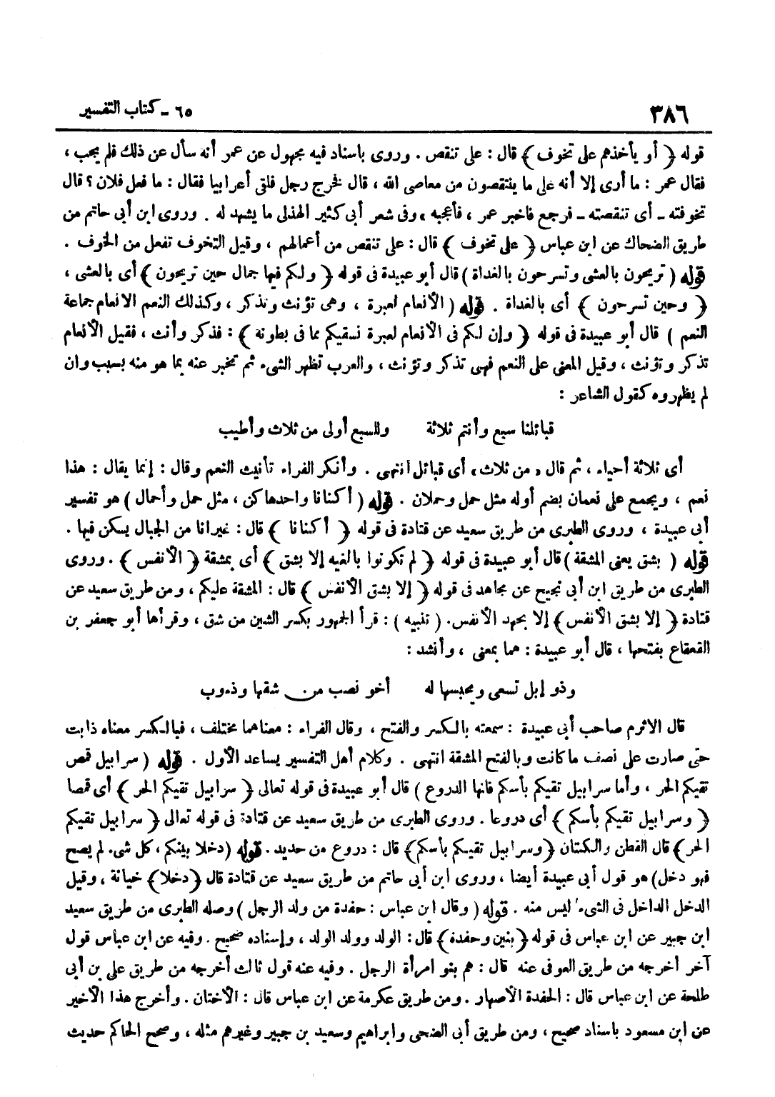 قَوْله أَو يَأْخُذهُمْ على تخوف قَالَ عَلَى تَنَقُّصٍ وَرُوِيَ بِإِسْنَادٍ فِيهِ مَجْهُولٌ عَنْ عُمَرَ أَنَّهُ سَأَلَ عَنْ ذَلِكَ فَلَمْ يجب فَقَالَ عمر مَا أرى إِلَّا أَنَّهُ عَلَى مَا يُنْتَقَصُونَ مِنْ مَعَاصِي اللَّهِ قَالَ فَخَرَجَ رَجُلٌ فَلَقِيَ أَعْرَابِيًّا فَقَالَ مَا فَعَلَ فُلَانٌ قَالَ تَخَوَّفْتُهُ أَيْ تَنَقَّصْتُهُ فَرَجَعَ فَأَخْبَرَ عُمَرُ فَأَعْجَبَهُ وَفِي شِعْرِ أَبِي كثير الْهُذلِيّ مَا يشْهد لَهُ وروى بن أبي حَاتِم من طَرِيق الضَّحَّاك عَن بن عَبَّاس على تخوف قَالَ عَلَى تَنَقُّصٍ مِنْ أَعْمَالِهِمْ وَقِيلَ التَّخَوُّفُ تَفَعُّلٌ مِنَ الْخَوْفِ قَوْلُهُ تُرِيحُونَ بِالْعَشِيِّ وَتَسْرَحُونَ بِالْغَدَاةِ قَالَ أَبُو عُبَيْدَةَ فِي قَوْلِهِ وَلَكُمْ فِيهَا جمال حِين تريحون أَي بالْعَشي وَحين تسرحون أَيْ بِالْغَدَاةِ قَوْلُهُ الْأَنْعَامِ لَعِبْرَةً هِيَ تُؤَنَّثُ وَتُذَكَّرُ وَكَذَلِكَ النَّعَمُ الْأَنْعَامُ جَمَاعَةُ النَّعَمِ قَالَ أَبُو عُبَيْدَةَ فِي قَوْلِهِ وَإِنَّ لَكُمْ فِي الْأَنْعَام لعبرة نسقيكم مِمَّا فِي بطونه فَذَكَّرَ وَأَنَّثَ فَقِيلَ الْأَنْعَامُ تُذَكَّرُ وَتُؤَنَّثُ وَقِيلَ الْمَعْنَى عَلَى النَّعَمِ فَهِيَ تُذَكَّرُ وَتُؤَنَّثُ وَالْعَرَبُ تُظْهِرُ الشَّيْءَ ثُمَّ تُخْبِرُ عَنْهُ بِمَا هُوَ مِنْهُ بِسَبَب وَأَن لم يظهروه كَقَوْلِ الشَّاعِرِ قَبَائِلُنَا سَبْعٌ وَأَنْتُمْ ثَلَاثَةٌ وَلَلسَّبْعُ أَوْلَى مِنْ ثَلَاثٍ وَأَطْيَبُ أَيْ ثَلَاثَةٍ أَحْيَاءٍ ثُمَّ قَالَ مِنْ ثَلَاثٍ أَيْ قَبَائِلَ انْتَهَى وَأَنْكَرَ الْفَرَّاءُ تَأْنِيثَ النَّعَمِ وَقَالَ إِنَّمَا يُقَالُ هَذَا نَعَمٌ وَيُجْمَعُ عَلَى نُعْمَانَ بِضَمِّ أَوَّلِهِ مِثْلُ حَمَلٍ وَحَمَلَانِ قَوْلُهُ أَكْنَانًا وَاحِدُهَا كِنُّ مِثْلُ حِمْلٍ وَأَحْمَالٍ هُوَ تَفْسِيرُ أَبِي عُبَيْدَةَ وَرَوَى الطَّبَرِيُّ مِنْ طَرِيقِ سَعِيدٍ عَنْ قَتَادَةَ فِي قَوْله أكنانا قَالَ غير انا مِنَ الْجِبَالِ يُسْكَنُ فِيهَا قَوْلُهُ بِشِقٍّ يَعْنِي الْمَشَقَّةُ قَالَ أَبُو عُبَيْدَةَ فِي قَوْلِهِ لَمْ تَكُونُوا بالغيه إِلَّا بشق أَيْ بِمَشَقَّةِ الْأَنْفُسُ وَرَوَى الطَّبَرِيُّ مِنْ طَرِيقِ بن أَبِي نَجِيحٍ عَنْ مُجَاهِدٍ فِي قَوْلِهِ إِلَّا بشق الْأَنْفس قَالَ الْمَشَقَّةُ عَلَيْكُمْ وَمِنْ طَرِيقِ سَعِيدِ عَنْ قَتَادَة إِلَّا بشق الْأَنْفس إِلَّا بِجَهْدِ الْأَنْفُسِ تَنْبِيهٌ قَرَأَ الْجُمْهُورُ بِكَسْرِ الشِّينِ مِنْ شِقِّ وَقَرَأَهَا أَبُو جَعْفَرِ بْنُ الْقَعْقَاعِ بِفَتْحِهَا قَالَ أَبُو عُبَيْدَةَ هُمَا بِمَعْنًى وَأَنْشَدَ وَذُو إِبِلٍ تَسْعَى وَيَحْبِسُهَا لَهُ أَخُو نَصَبٍ مِنْ شِقِّهَا وَذَءُوبٍ قَالَ الْأَثْرَمُ صَاحِبُ أَبِي عُبَيْدَةَ سَمِعْتُهُ بِالْكَسْرِ وَالْفَتْحِ وَقَالَ الْفَرَّاءُ مَعْنَاهُمَا مُخْتَلِفٌ فَبِالْكَسْرِ مَعْنَاهُ ذَابَتْ حَتَّى صَارَتْ عَلَى نِصْفِ مَا كَانَتْ وَبِالْفَتْحِ الْمَشَقَّةُ انْتَهَى وَكَلَامُ أَهْلِ التَّفْسِيرِ يُسَاعِدُ الْأَوَّلَ قَوْلُهُ سَرَابِيلُ قُمُصٌ تَقِيكُمُ الْحَرَّ وَأَمَّا سَرَابِيلُ تَقِيكُمْ بَأْسَكُمْ فَإِنَّهَا الدُّرُوعُ قَالَ أَبُو عُبَيْدَةَ فِي قَوْلِهِ تَعَالَى سرابيل تقيكم الْحر أَي قمصا وسرابيل تقيكم بأسكم أَيْ دُرُوعًا وَرَوَى الطَّبَرِيُّ مِنْ طَرِيقِ سَعِيدٍ عَنْ قَتَادَةَ فِي قَوْلِهِ تَعَالَى سَرَابِيلَ تَقِيكُمُ الْحر قَالَ الْقطن والكتان وسرابيل تقيكم بأسكم قَالَ دُرُوعٌ مِنْ حَدِيدٍ قَوْلُهُ دَخَلًا بَيْنَكُمْ كُلُّ شَيْءٍ لَمْ يَصِحَّ فَهُوَ دَخَلٌ هُوَ قَول أبي عُبَيْدَة أَيْضا وروى بن أَبِي حَاتِمٍ مِنْ طَرِيقِ سَعِيدٍ عَنْ قَتَادَةَ قَالَ دَخَلًا خِيَانَةً وَقِيلَ الدَّخَلُ الدَّا