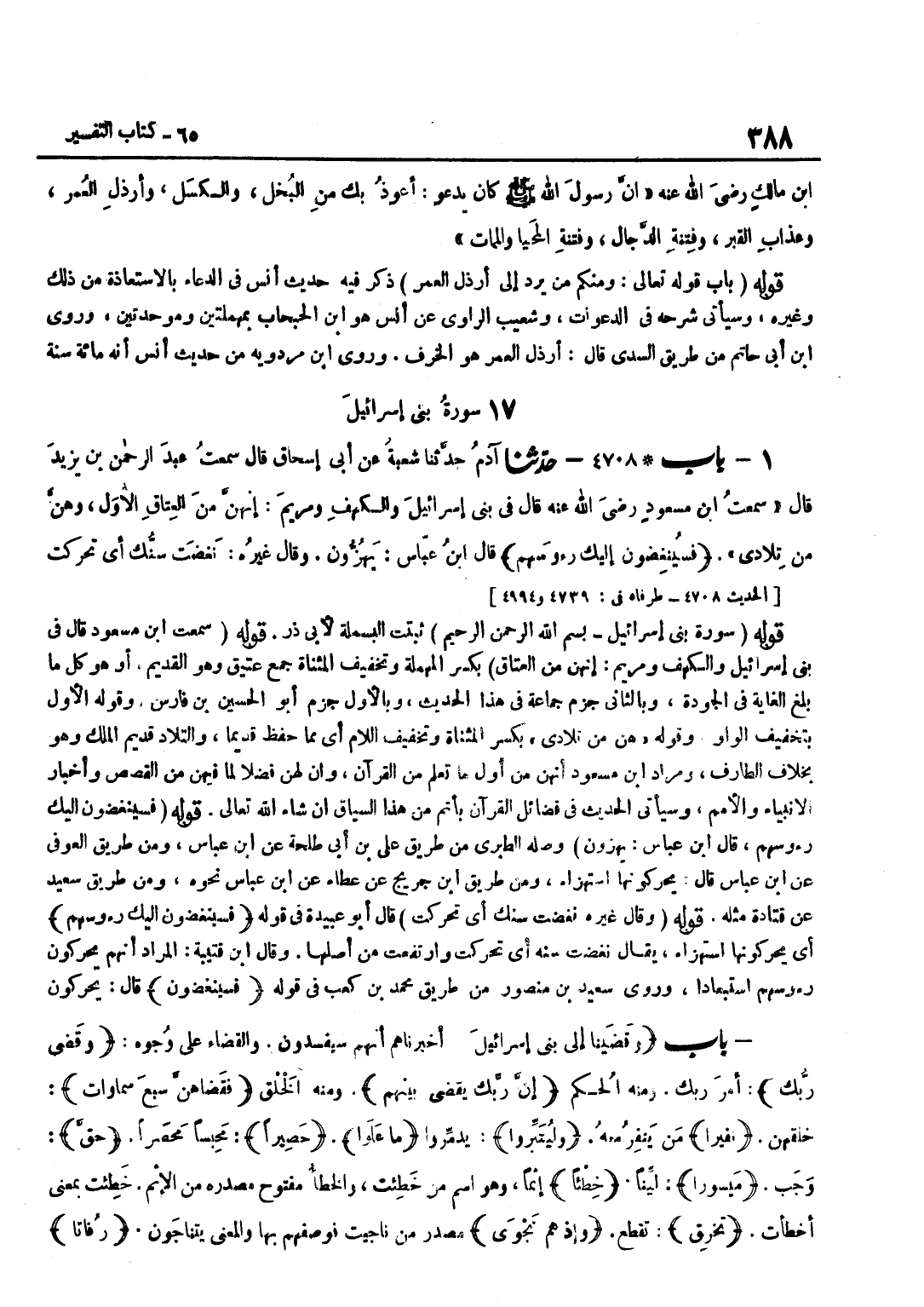 [4708] قَوْلُهُ سَمِعْتُ بن مَسْعُودٍ قَالَ فِي بَنِي إِسْرَائِيلَ وَالْكَهْفِ وَمَرْيَمَ إِنَّهُنَّ مِنَ الْعِتَاقِ بِكَسْرِ الْمُهْمَلَةِ وَتَخْفِيفِ الْمُثَنَّاةِ جَمْعُ عَتِيقٍ وَهُوَ الْقَدِيمُ أَوْ هُوَ كُلُّ مَا بَلَغَ الْغَايَةَ فِي الْجَوْدَةِ وَبِالثَّانِي جَزَمَ جَمَاعَةٌ فِي هَذَا الْحَدِيثِ وَبِالْأُوَلِ جَزَمَ أَبُو الْحُسَيْنِ بْنُ فَارِسٍ وَقَوْلُهُ الْأَوَّلُ بِتَخْفِيفِ الْوَاوِ وَقَوْلُهُ هُنَّ مِنْ تِلَادِي بِكَسْرِ الْمُثَنَّاةِ وَتَخْفِيفِ اللَّامِ أَيْ مِمَّا حُفِظَ قَدِيمًا وَالتِّلَادُ قَدِيمُ الْملك وَهُوَ بِخِلَاف الطارف وَمُرَاد بن مَسْعُودٍ أَنَّهُنَّ مِنْ أَوَّلِ مَا تُعُلِّمَ مِنَ الْقُرْآنِ وَأَنَّ لَهُنَّ فَضْلًا لِمَا فِيهِنَّ مِنَ الْقَصَصِ وَأَخْبَارِ الْأَنْبِيَاءِ وَالْأُمَمِ وَسَيَأْتِي الْحَدِيثُ فِي فَضَائِلِ الْقُرْآنِ بِأَتَمَّ مِنْ هَذَا السِّيَاقِ إِنْ شَاءَ الله تَعَالَى قَوْله فسينغضون إِلَيْك رؤوسهم قَالَ بن عَبَّاسٍ يَهُزُّونَ وَصَلَهُ الطَّبَرِيُّ مِنْ طَرِيقِ عَلِيِّ بْنِ أَبِي طَلْحَةَ عَنِ بن عَبَّاس وَمن طَرِيق الْعَوْفِيّ عَن بن عَبَّاس قَالَ يحركونها استهزاء وَمن طَرِيق بن جريج عَن عَطاء عَن بن عَبَّاسٍ نَحْوَهُ وَمِنْ طَرِيقِ سَعِيدِ عَنْ قَتَادَةَ مِثْلَهُ قَوْلُهُ وَقَالَ غَيْرُهُ نَغَضَتْ سِنَّكَ أَيْ تَحَرَّكَتْ قَالَ أَبُو عُبَيْدَةَ فِي قَوْلِهِ فَسَيُنْغِضُونَ إِلَيْك رؤوسهم أَيْ يُحَرِّكُونَهَا اسْتِهْزَاءً يُقَالُ نَغَضَتْ سِنُّهُ أَيْ تحركت وَارْتَفَعت من أَصْلهَا وَقَالَ بن قُتَيْبَة المُرَاد أَنهم يحركون رؤوسهم اسْتِبْعَادًا وَرَوَى سَعِيدُ بْنُ مَنْصُورٍ مِنْ طَرِيقِ مُحَمَّدِ بْنِ كَعْب فِي قَوْله فسينغضون قَالَ يحركون