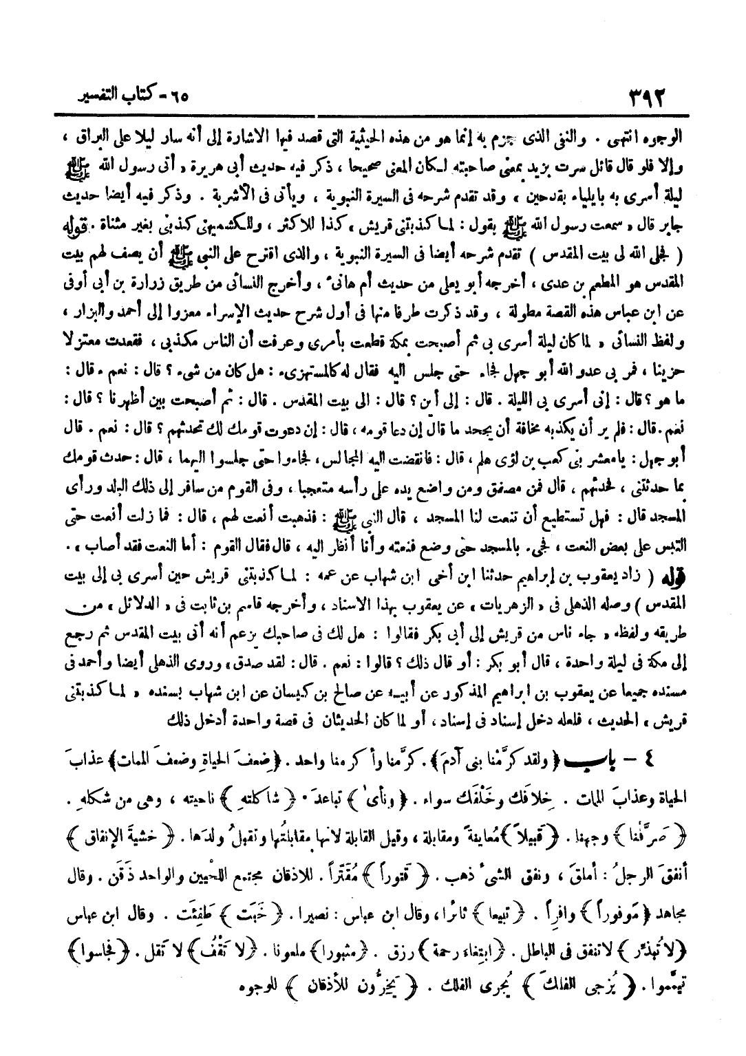 الْوُجُوهِ انْتَهَى وَالنَّفْيُ الَّذِي جَزَمَ بِهِ إِنَّمَا هُوَ مِنْ هَذِهِ الْحَيْثِيَّةِ الَّتِي قَصَدَ فِيهَا الْإِشَارَةَ إِلَى أَنَّهُ سَارَ لَيْلًا عَلَى الْبُرَاقِ وَإِلَّا فَلَوْ قَالَ قَائِلٌ سِرْتُ بِزَيْدٍ بِمَعْنَى صاحبته لَكَانَ الْمَعْنى صَحِيحا ذكر فِيهِ حَدِيثُ أَبِي هُرَيْرَةَ أَتَى رَسُولُ اللَّهِ صَلَّى اللَّهُ عَلَيْهِ وَسَلَّمَ لَيْلَةً أُسْرِيَ بِهِ بِإِيلِيَاءَ بِقَدَحَيْنِ وَقَدْ تَقَدَّمَ شَرْحُهُ فِي السِّيرَةِ النَّبَوِيَّةِ وَيَأْتِي فِي الْأَشْرِبَةِ وَذَكَرَ فِيهِ أَيْضًا حَدِيثَ جَابِرٍ قَالَ سَمِعْتُ رَسُولَ اللَّهِ صَلَّى اللَّهُ عَلَيْهِ وَسَلَّمَ يَقُولُ لَمَّا كَذَّبَتْنِي قُرَيْشٌ كَذَا لِلْأَكْثَرِ وَلِلْكُشْمِيهَنِيِّ كَذَّبَنِي بِغَيْرِ مُثَنَّاةٍ