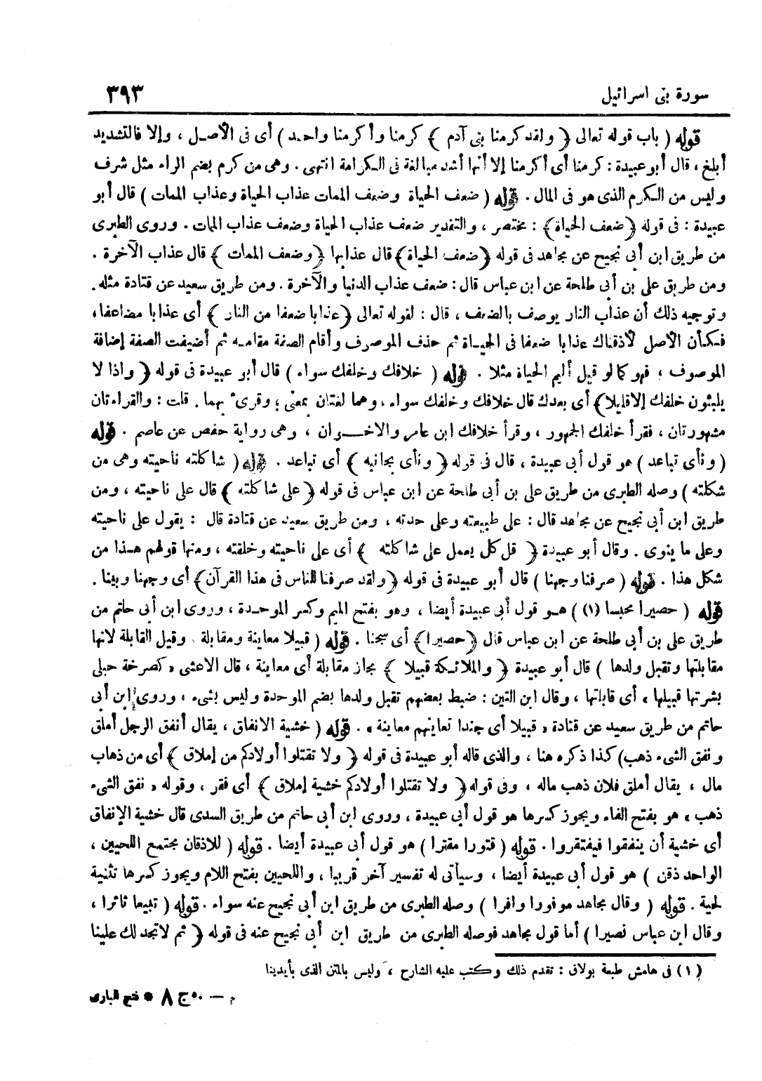 كَرَّمْنَا وَأَكْرَمْنَا وَاحِدٌ أَيْ فِي الْأَصْلِ وَإِلَّا فالتشديد أبلغ قَالَ أَبُو عُبَيْدَة كَرَّمْنَا أَيْ أَكْرَمْنَا إِلَّا أَنَّهَا أَشَدُّ مُبَالَغَةً فِي الْكَرَامَةِ انْتَهَى وَهِيَ مِنْ كَرُمَ بِضَمِّ الرَّاءِ مِثْلُ شَرُفَ وَلَيْسَ مِنَ الْكَرَمِ الَّذِي هُوَ فِي الْمَالِ قَوْلُهُ ضِعْفَ الْحَيَاةِ وَضِعْفَ الْمَمَات عَذَابُ الْحَيَاةِ وَعَذَابُ الْمَمَاتِ قَالَ أَبُو عُبَيْدَةَ فِي قَوْله ضعف الْحَيَاة مُخْتَصَرٌ وَالتَّقْدِيرُ ضِعْفَ عَذَابِ الْحَيَاةِ وَضِعْفَ عَذَابِ الْمَمَات وروى الطَّبَرِيّ من طَرِيق بن أَبِي نَجِيحٍ عَنْ مُجَاهِدٍ فِي قَوْلِهِ ضِعْفَ الْحَيَاة قَالَ عَذَابهَا وَضعف الْمَمَات قَالَ عَذَابُ الْآخِرَةِ وَمِنْ طَرِيقِ عَلِيِّ بْنِ أَبِي طَلْحَةَ عَنِ بن عَبَّاسٍ قَالَ ضِعْفَ عَذَابِ الدُّنْيَا وَالْآخِرَةِ وَمِنْ طَرِيقِ سَعِيدٍ عَنْ قَتَادَةَ مِثْلُهُ وَتَوْجِيهُ ذَلِكَ أَنَّ عَذَابَ النَّارِ يُوصَفُ بِالضِّعْفِ قَالَ لِقَوْلِهِ تَعَالَى عذَابا ضعفا من النَّار أَيْ عَذَابًا مُضَاعَفًا فَكَأَنَّ الْأَصْلَ لَأَذَقْنَاكَ عَذَابًا ضِعْفًا فِي الْحَيَاةِ ثُمَّ حَذَفَ الْمَوْصُوفَ وَأَقَامَ الصِّفَةَ مَقَامَهُ ثُمَّ أُضِيفَتِ الصِّفَةُ إِضَافَةَ الْمَوْصُوفِ فَهُوَ كَمَا لَوْ قِيلَ أَلِيمُ الْحَيَاةِ مَثْلًا قَوْلُهُ خِلَافَكَ وَخَلْفَكَ سَوَاءٌ قَالَ أَبُو عُبَيْدَةَ فِي قَوْلِهِ وَإِذًا لَا يَلْبَثُونَ خَلْفَكَ إِلَّا قَلِيلا أَي بعْدك قَالَ خِلافك وخلقك سَوَاءٌ وَهُمَا لُغَتَانِ بِمَعْنًى وَقُرِئَ بِهِمَا قُلْتُ وَالْقِرَاءَتَانِ مَشْهُورَتَانِ فَقَرَأَ خَلْفَكَ الْجُمْهُورُ وَقَرَأَ خِلَافَكَ بن عَامِرٍ وَالْإِخْوَانِ وَهِيَ رِوَايَةُ حَفْصٍ عَنْ عَاصِمٍ قَوْلُهُ وَنَأَى تَبَاعَدَ هُوَ قَوْلُ أَبِي عُبَيْدَةَ قَالَ فِي قَوْلِهِ ونأي بجانبه أَيْ تَبَاعَدَ قَوْلُهُ شَاكِلَتُهُ نَاحِيَتُهُ وَهِيَ مِنْ شَكَلْتُهُ وَصَلَهُ الطَّبَرِيُّ مِنْ طَرِيقِ عَلِيِّ بْنِ أَبِي طَلْحَةَ عَنِ بْنِ عَبَّاسٍ فِي قَوْلِهِ على شاكلته قَالَ على ناحيته وَمن طَرِيق بن أَبِي نَجِيحٍ عَنْ مُجَاهِدٍ قَالَ عَلَى طَبِيعَتِهِ وَعَلَى حِدَتِهِ وَمِنْ طَرِيقِ سَعِيدٍ عَنْ قَتَادَةَ قَالَ يَقُولُ عَلَى نَاحِيَتِهِ وَعَلَى مَا يَنْوِي وَقَالَ أَبُو عُبَيْدَةَ قُلْ كُلٌّ يَعْمَلُ عَلَى شاكلته أَيْ عَلَى نَاحِيَتِهِ وَخِلْقَتِهِ وَمِنْهَا قَوْلُهُمْ هَذَا مِنْ شَكْلُ هَذَا قَوْلُهُ صَرَّفْنَا وَجَّهْنَا قَالَ أَبُو عُبَيْدَةَ فِي قَوْلِهِ وَلَقَدْ صَرَّفْنَا لِلنَّاسِ فِي هَذَا الْقُرْآن أَي وجهنا وَبينا قَوْله حَصِيرا محبسا هُوَ قَوْلُ أَبِي عُبَيْدَةَ أَيْضًا وَهُوَ بِفَتْحِ الْمِيم وَكسر الْمُوَحدَة وروى بن أَبِي حَاتِمٍ مِنْ طَرِيقِ عَلِيِّ بْنِ أَبِي طَلْحَةَ عَنِ بن عَبَّاسٍ قَالَ حَصِيرًا أَيْ سِجْنًا قَوْلُهُ قَبِيلًا مُعَايَنَةً وَمُقَابَلَةً وَقِيلَ الْقَابِلَةُ لِأَنَّهَا مُقَابِلَتُهَا وَتَقْبَلُ وَلَدهَا قَالَ أَبُو عُبَيْدَة وَالْمَلَائِكَة قبيلا مَجَازُ مُقَابَلَةٍ أَيْ مُعَايَنَةٍ قَالَ الْأَعْشَى كَصَرْخَةِ حُبْلَى بَشرَتهَا قبيلها أَي قابلتها وَقَالَ بن التِّينِ ضَبَطَ بَعْضُهُمْ تَقْبُلُ وَلَدَهَا بِضَمِّ الْمُوَحَّدَةِ وَلَيْسَ بِشَيْء وروى بن أَبِي حَاتِمٍ مِنْ طَرِيقِ سَعِيدٍ عَنْ قَتَادَةَ قَبِيلًا أَيْ جُنْدًا تُعَايِنُهُمْ مُعَايَنَةً قَوْلُهُ خَشْيَةَ الْإِنْفَاقِ يُقَالُ أَنْفَقَ الرَّجُلُ أَمْلَقَ وَنَفَقَ الشَّيْءِ ذَهَبَ كَذَا ذَكَرَهُ هُنَا وَالَّذِي قَالَهُ أَبُو عُبَيْدَةَ فِي قَوْلِهِ وَلَا تَقْتُلُوا أَوْلَادَكُمْ مِنْ إملاق أَيْ مِنْ ذَهَابِ مَالٍ يُقَالُ أَمْلَقَ فُلَانٌ ذَهَبَ مَالُهُ وَفِي قَوْلِهِ وَلَا 