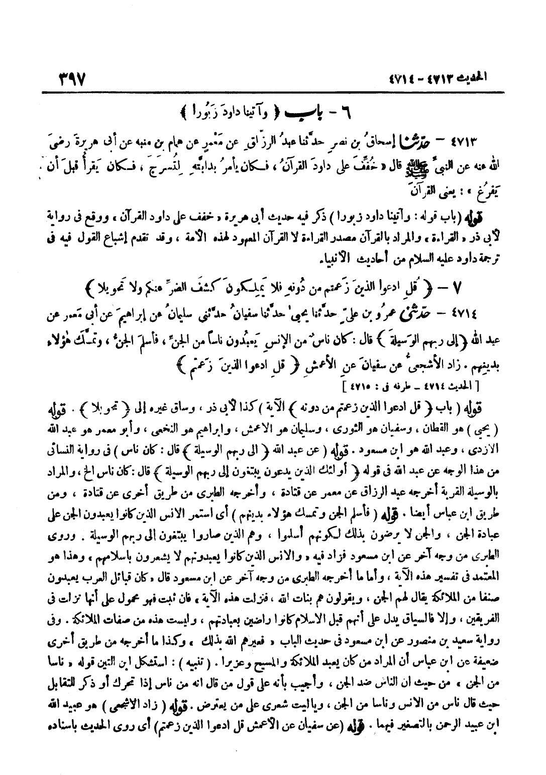 ذكر فِيهِ حَدِيثُ أَبِي هُرَيْرَةَ خُفِّفَ عَلَى دَاوُدَ الْقُرْآنُ وَوَقَعَ فِي رِوَايَةِ لِأَبِي ذَرٍّ الْقِرَاءَةُ وَالْمُرَادُ بِالْقُرْآنِ مَصْدَرُ الْقِرَاءَةِ لَا الْقُرْآنِ الْمَعْهُودِ لِهَذِهِ الْأُمَّةِ وَقَدْ تَقَدَّمَ إِشْبَاعُ الْقَوْلِ فِيهِ فِي تَرْجَمَةِ دَاوُدَ عَلَيْهِ السَّلَامُ مِنْ أَحَادِيثِ الْأَنْبِيَاءِ قَوْلُهُ بَابُ قُلِ ادْعُوا الَّذِينَ زَعَمْتُمْ مِنْ دونه الْآيَةَ كَذَا لِأَبِي ذَرٍّ وَسَاقَ غَيْرُهُ إِلَى تَحْوِيلًا قَوْلُهُ يَحْيَى هُوَ الْقَطَّانُ وَسُفْيَانُ هُوَ الثَّوْرِيُّ وَسُلَيْمَانُ هُوَ الْأَعْمَشُ وَإِبْرَاهِيمُ هُوَ النَّخَعِيُّ وَأَبُو مَعْمَرٍ هُوَ عَبْدُ اللَّهِ الْأَزْدِيُّ وَعَبْدُ الله هُوَ بن مَسْعُودٍ قَوْلُهُ عَنْ عَبْدِ اللَّهِ إِلَى رَبِّهِمُ الْوَسِيلَة قَالَ كَانَ نَاسٌ فِي رِوَايَةِ النَّسَائِيِّ مِنْ هَذَا الْوَجْهِ عَنْ عَبْدِ اللَّهِ فِي قَوْلِهِ أُولَئِكَ الَّذين يدعونَ يَبْتَغُونَ إِلَى رَبهم الْوَسِيلَة قَالَ كَانَ نَاسٌ إِلَخْ وَالْمُرَادُ بِالْوَسِيلَةِ الْقُرْبَةِ أَخْرَجَهُ عَبْدُ الرَّزَّاقِ عَنْ مَعْمَرٍ عَنْ قَتَادَةَ وَأَخْرَجَهُ الطَّبَرِيُّ مِنْ طَرِيقِ أُخْرَى عَنْ قَتَادَةَ وَمن طَرِيق بن عَبَّاسٍ أَيْضًا قَوْلُهُ فَأَسْلَمَ الْجِنُّ وَتَمَسَّكَ هَؤُلَاءِ بِدِينِهِمْ أَيِ اسْتَمَرَّ الْإِنْسُ الَّذِينَ كَانُوا يَعْبُدُونَ الْجِنَّ عَلَى عِبَادَةِ الْجِنِّ وَالْجِنُّ لَا يَرْضَوْنَ بِذَلِكَ لِكَوْنِهِمْ أَسْلَمُوا وَهُمُ الَّذِينَ صَارُوا يَبْتَغُونَ إِلَى رَبِّهِمُ الْوَسِيلَةَ وَرَوَى الطَّبَرِيُّ مِنْ وَجْهٍ آخر عَن بن مَسْعُودٍ فَزَادَ فِيهِ وَالْإِنْسُ الَّذِينَ كَانُوا يَعْبُدُونَهُمْ لَا يَشْعُرُونَ بِإِسْلَامِهِمْ وَهَذَا هُوَ الْمُعْتَمَدُ فِي تَفْسِيرِ هَذِهِ الْآيَةِ وَأَمَّا مَا أَخْرَجَهُ الطَّبَرِيُّ مِنْ وَجْهٍ آخَرَ عَن بن مَسْعُودٍ قَالَ كَانَ قَبَائِلُ الْعَرَبِ يَعْبُدُونَ صِنْفًا مِنَ الْمَلَائِكَةِ يُقَالُ لَهُمُ الْجِنُّ وَيَقُولُونَ هُمْ بَنَاتُ اللَّهِ فَنَزَلَتْ هَذِهِ الْآيَةُ فَإِنْ ثَبَتَ فَهُوَ مَحْمُولٌ عَلَى أَنَّهَا نَزَلَتْ فِي الْفَرِيقَيْنِ وَإِلَّا فَالسِّيَاقُ يَدُلُّ عَلَى أَنَّهُمْ قَبْلَ الْإِسْلَامِ كَانُوا رَاضِينَ بِعِبَادَتِهِمْ وَلَيْسَتْ هَذِهِ مِنْ صِفَاتِ الْمَلَائِكَةِ وَفِي رِوَايَةِ سَعِيدِ بْنِ مَنْصُورٍ عَنِ بن مَسْعُودٍ فِي حَدِيثِ الْبَابِ فَعَيَّرَهُمُ اللَّهُ بِذَلِكَ وَكَذَا مَا أَخْرَجَهُ مِنْ طَرِيقِ أُخْرَى ضَعِيفَةٍ عَن بن عَبَّاسٍ أَنَّ الْمُرَادَ مَنْ كَانَ يَعْبُدُ الْمَلَائِكَةَ والمسيح وعزيرا تَنْبِيه اسْتشْكل بن التِّينِ قَوْلُهُ نَاسًا مِنَ الْجِنِّ مِنْ حَيْثُ إِنَّ النَّاسَ ضِدُّ الْجِنِّ وَأُجِيبَ بِأَنَّهُ عَلَى قَوْلِ مَنْ قَالَ إِنَّهُ مِنْ نَاسٍ إِذَا تَحَرَّكَ أَوْ ذُكِرَ لِلتَّقَابُلِ حَيْثُ قَالَ نَاسٌ مِنَ الْإِنْسِ وَنَاسًا مِنَ الْجِنِّ وَيَا لَيْتَ شِعْرِي عَلَى مَنْ يَعْتَرِضُ قَوْلُهُ زَادَ الْأَشْجَعِيُّ هُوَ عُبَيْدُ اللَّهِ بْنُ عُبَيْدِ الرَّحْمَنِ بِالتَّصْغِيرِ فِيهِمَا قَوْلُهُ عَنْ سُفْيَانَ عَنِ الْأَعْمَشِ قُلِ ادعوا الَّذين زعمتم أَيْ رَوَى الْحَدِيثَ بِإِسْنَادِهِ