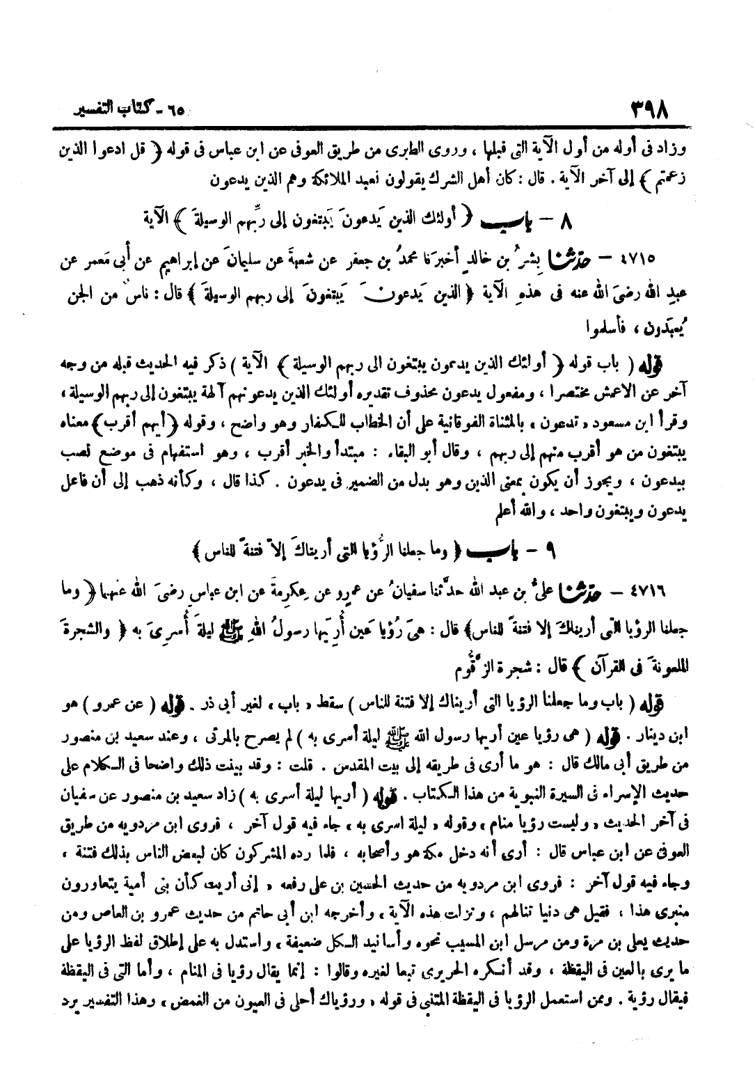 ذَكَرَ فِيهِ الْحَدِيثَ قَبْلَهُ مِنْ وَجْهٍ آخَرَ عَنِ الْأَعْمَشِ مُخْتَصَرًا وَمَفْعُولُ يَدْعُونَ مَحْذُوفٌ تَقْدِيرُهُ أُولَئِكَ الَّذِينَ يَدْعُونَهُمْ آلِهَةً يَبْتَغُونَ إِلَى رَبهم الْوَسِيلَة وَقَرَأَ بن مَسْعُودٍ تَدْعُونَ بِالْمُثَنَّاةِ الْفَوْقَانِيَّةِ عَلَى أَنَّ الْخِطَابَ للْكفَّار وَهُوَ وَاضح وَقَوله أَيهمْ أقرب مَعْنَاهُ يَبْتَغُونَ مَنْ هُوَ أَقْرَبُ مِنْهُمْ إِلَى رَبِّهِمْ وَقَالَ أَبُو الْبَقَاءِ مُبْتَدَأٌ وَالْخَبَرُ أَقْرَبُ وَهُوَ اسْتِفْهَامٌ فِي مَوْضِعِ نَصْبِ يَدْعُونَ وَيَجُوزُ أَنْ يَكُونَ بِمَعْنَى الَّذِينَ وَهُوَ بَدَلٌ مِنَ الضَّمِيرِ فِي يَدْعُونَ كَذَا قَالَ وَكَأَنَّهُ ذَهَبَ إِلَى أَنَّ فَاعِلَ يَدْعُونَ وَيَبْتَغُونَ وَاحِدٌ وَاللَّهُ اعْلَم قَوْلُهُ بَابُ وَمَا جَعَلْنَا الرُّؤْيَا الَّتِي أَرَيْنَاكَ إِلَّا فِتْنَةً للنَّاس سَقَطَ بَابُ لِغَيْرِ أَبِي ذَرٍّ
