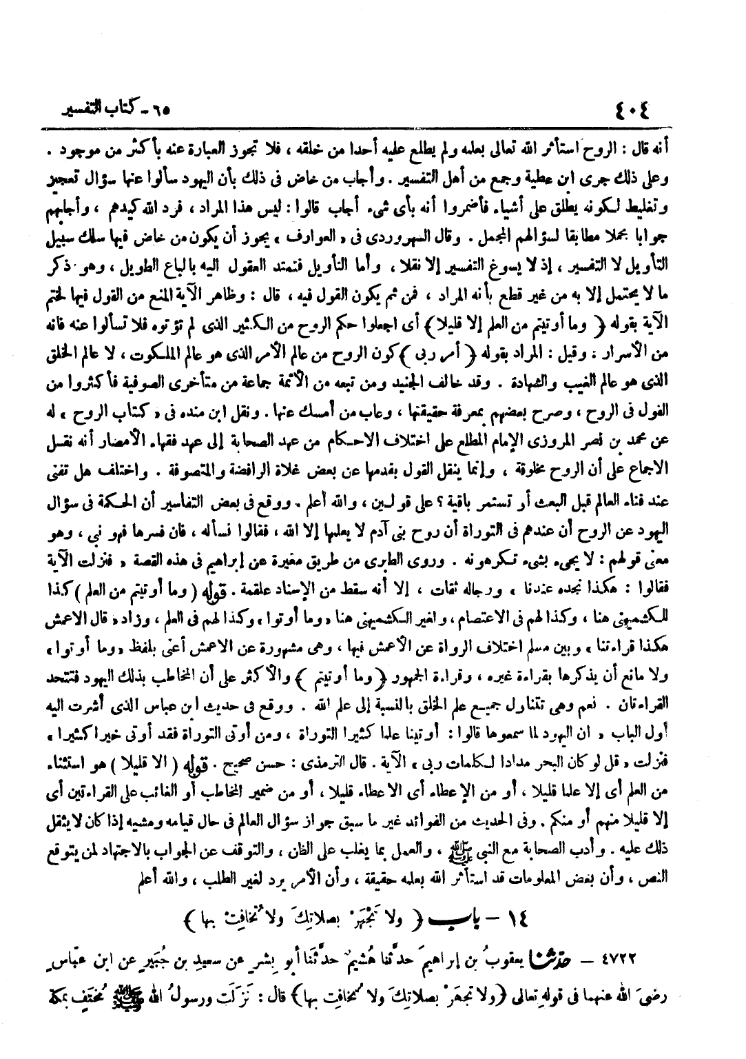 أَنَّهُ قَالَ الرُّوحُ اسْتَأْثَرَ اللَّهُ تَعَالَى بِعِلْمِهِ وَلَمْ يُطْلِعْ عَلَيْهِ أَحَدًا مِنْ خَلْقِهِ فَلَا تَجُوزُ الْعِبَارَةُ عَنْهُ بِأَكْثَرَ مِنْ مَوْجُودٍ وَعَلَى ذَلِك جرى بن عَطِيَّةَ وَجَمْعٌ مِنْ أَهْلِ التَّفْسِيرِ وَأَجَابَ مَنْ خَاضَ فِي ذَلِكَ بِأَنَّ الْيَهُودَ سَأَلُوا عَنْهَا سُؤَالَ تَعْجِيزٍ وَتَغْلِيطٍ لِكَوْنِهِ يُطْلَقُ عَلَى أَشْيَاءَ فَأَضْمَرُوا أَنَّهُ بِأَيِّ شَيْءٍ أَجَابَ قَالُوا لَيْسَ هَذَا الْمُرَادَ فَرَدَّ اللَّهُ كَيْدَهُمْ وَأَجَابَهُمْ جَوَابًا مُجْمَلًا مُطَابِقًا لِسُؤَالِهِمُ الْمُجْمَلِ وَقَالَ السُّهْرَوَرْدِيُّ فِي الْعَوَارِفِ يَجُوزُ أَنْ يَكُونَ مَنْ خَاضَ فِيهَا سلك سَبِيل التَّأْوِيل لَا التَّفْسِير إِذْ لايسوغ التَّفْسِيرُ إِلَّا نَقْلًا وَأَمَّا التَّأْوِيلُ فَتَمْتَدُّ الْعُقُولُ إِلَيْهِ بِالْبَاعِ الطَّوِيلِ وَهُوَ ذِكْرُ مَا لَا يُحْتَمَلُ إِلَّا بِهِ مِنْ غَيْرِ قَطْعٍ بِأَنَّهُ الْمُرَادُ فَمِنْ ثَمَّ يَكُونُ الْقَوْلُ فِيهِ قَالَ وَظَاهِرُ الْآيَةِ الْمَنْعُ مِنَ الْقَوْلِ فِيهَا لِخَتْمِ الْآيَةِ بِقَوْلِهِ وَمَا أُوتِيتُمْ مِنَ الْعِلْمِ إِلَّا قَلِيلا أَيِ اجْعَلُوا حُكْمَ الرُّوحِ مِنَ الْكَثِيرِ الَّذِي لم تؤتوه فَلَا تسألوا عَنْهُ فَإِنَّهُ مِنَ الْأَسْرَارِ وَقِيلَ الْمُرَادُ بِقَوْلِهِ أَمْرُ رَبِّي كَوْنُ الرُّوحِ مِنْ عَالِمِ الْأَمْرِ الَّذِي هُوَ عَالَمُ الْمَلَكُوتِ لَا عَالَمُ الْخَلْقِ الَّذِي هُوَ عَالَمُ الْغَيْبِ وَالشَّهَادَةِ وَقَدْ خَالَفَ الْجُنَيْدَ وَمَنْ تَبِعَهُ مِنَ الْأَئِمَّةِ جَمَاعَةٌ مِنْ مُتَأَخِّرِي الصُّوفِيَّةِ فَأَكْثَرُوا مِنَ الْقَوْلِ فِي الرُّوحِ وَصَرَّحَ بَعْضُهُمْ بِمَعْرِفَةِ حَقِيقَتِهَا وَعَابَ مَنْ أَمْسَكَ عَنْهَا وَنقل بن مَنْدَهْ فِي كِتَابِ الرُّوحِ لَهُ عَنْ مُحَمَّدِ بْنِ نَصْرٍ الْمَرْوَزِيِّ الْإِمَامِ الْمُطَّلِعِ عَلَى اخْتِلَافِ الْأَحْكَامِ مِنْ عَهْدِ الصَّحَابَةِ إِلَى عَهْدِ فُقَهَاءِ الْأَمْصَارِ أَنَّهُ نَقَلَ الْإِجْمَاعَ عَلَى أَنَّ الرُّوحَ مَخْلُوقَةٌ وَإِنَّمَا يُنْقَلُ الْقَوْلُ بِقِدَمِهَا عَنْ بَعْضِ غُلَاةِ الرَّافِضَةِ وَالْمُتَصَوِّفَةِ وَاخْتُلِفَ هَلْ تَفْنَى عِنْدَ فَنَاءِ الْعَالَمِ قَبْلَ الْبَعْثِ أَوْ تَسْتَمِرُّ بَاقِيَةً عَلَى قَوْلَيْنِ وَاللَّهُ أَعْلَمُ وَوَقَعَ فِي بَعْضِ التَّفَاسِيرِ أَنَّ الْحِكْمَةَ فِي سُؤَالِ الْيَهُودِ عَنِ الرُّوحِ أَنَّ عِنْدَهُمْ فِي التَّوْرَاةِ أَنَّ رُوحَ بَنِي آدَمَ لَا يَعْلَمُهَا إِلَّا اللَّهُ فَقَالُوا نَسْأَلُهُ فَإِنْ فَسَّرَهَا فَهُوَ نَبِيٌّ وَهُوَ مَعْنَى قَوْلِهِمْ لَا يَجِيءُ بِشَيْءٍ تَكْرَهُونَهُ وَرَوَى الطَّبَرِيُّ مِنْ طَرِيقِ مُغِيرَةَ عَنْ إِبْرَاهِيمَ فِي هَذِهِ الْقِصَّةِ فَنَزَلَتِ الْآيَةُ فَقَالُوا هَكَذَا نَجِدُهُ عِنْدَنَا وَرِجَالُهُ ثِقَاتٌ إِلَّا أَنَّهُ سَقَطَ مِنَ الْإِسْنَادِ عَلْقَمَة قَوْله وَمَا أُوتِيتُمْ من الْعلم كَذَا لِلْكُشْمِيهَنِيِّ هُنَا وَكَذَا لَهُمْ فِي الِاعْتِصَامِ وَلِغَيْرِ الْكُشْمِيهَنِيِّ هُنَا وَمَا أُوتُوا وَكَذَا لَهُمْ فِي الْعِلْمِ وَزَادَ قَالَ الْأَعْمَشُ هَكَذَا قِرَاءَتُنَا وَبَيَّنَ مُسْلِمٌ اخْتِلَافَ الرُّوَاةِ عَنِ الْأَعْمَشِ فِيهَا وَهِيَ مَشْهُورَةٌ عَنِ الْأَعْمَشِ أَعْنِي بِلَفْظِ وَمَا أُوتُوا وَلَا مَانِعَ أَنْ يَذْكُرَهَا بِقِرَاءَةِ غَيْرِهِ وَقِرَاءَةُ الْجُمْهُورِ وَمَا أُوتِيتُمْ وَالْأَكْثَرُ عَلَى أَنَّ الْمُخَاطَبَ بِذَلِكَ الْيَهُودُ فَتَتَّحِدُ الْقِرَاءَتَانِ نَعَمْ وَهِيَ تَتَنَاوَلُ جَمِيعَ عِلْمِ الْخَلْقِ بِالنِّسْبَةِ إِلَى عِلْمِ الله وَوَقع فِي حَدِيث بن عَ