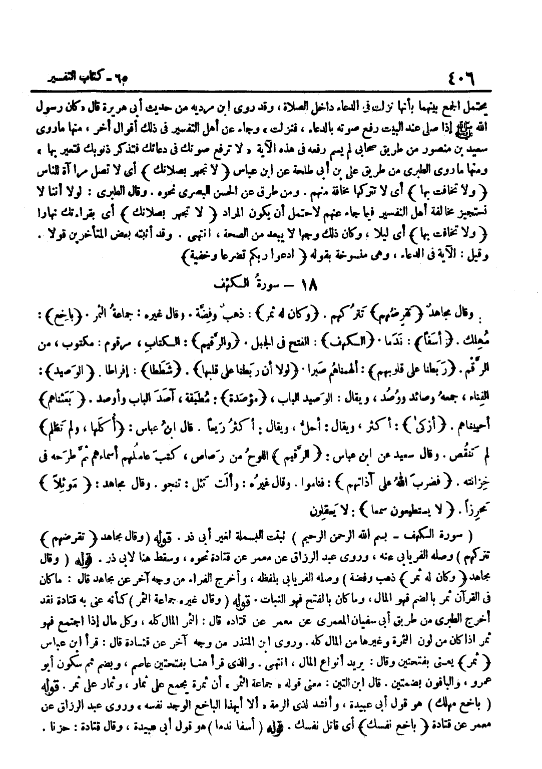 ثَبَتَتِ الْبَسْمَلَةُ لِغَيْرِ أَبِي ذَرٍّ قَوْلُهُ وَقَالَ مُجَاهِدٌ تَقْرِضُهُمْ تَتْرُكُهُمْ وَصَلَهُ الْفِرْيَابِيُّ عَنْهُ وَرَوَى عَبْدُ الرَّزَّاقِ عَنْ مَعْمَرٍ عَنْ قَتَادَةَ نَحْوَهُ وَسَقَطَ هُنَا لِأَبِي ذَرٍّ قَوْلُهُ وَقَالَ مُجَاهِد وَكَانَ لَهُ ثَمَر ذَهَبٌ وَفِضَّةٌ وَصَلَهُ الْفِرْيَابِيُّ بِلَفْظِهِ وَأَخْرَجَ الْفَرَّاءُ مِنْ وَجْهٍ آخَرَ عَنْ مُجَاهِدٍ قَالَ مَا كَانَ فِي الْقُرْآنِ ثُمُرٌ بِالضَّمِّ فَهُوَ الْمَالُ وَمَا كَانَ بِالْفَتْحِ فَهُوَ النَّبَاتُ قَوْلُهُ وَقَالَ غَيْرُهُ جَمَاعَةُ الثَّمَرُ كَأَنَّهُ عَنَى بِهِ قَتَادَةَ فَقَدْ أَخْرَجَ الطَّبَرِيُّ مِنْ طَرِيقِ أَبِي سُفْيَانَ الْمَعْمَرِيِّ عَنْ مَعْمَرٍ عَنْ قَتَادَةَ قَالَ الثَّمَرُ الْمَالُ كُلُّهُ وَكُلُّ مَالٍ إِذَا اجْتَمَعَ فَهُوَ ثَمَرٌ إِذَا كَانَ مِنْ لَوْنِ الثَّمَرَةِ وَغَيْرِهَا من المَال كُله وروى بن الْمُنْذِرِ مِنْ وَجْهٍ آخَرَ عَنْ قَتَادَةَ قَالَ قَرَأَ بن عَبَّاسٍ ثَمَرً يَعْنِي بِفَتْحَتَيْنِ وَقَالَ يُرِيدُ أَنْوَاعَ الْمَالِ انْتَهَى وَالَّذِي قَرَأَ هُنَا بِفَتْحَتَيْنِ عَاصِمٌ وَبِضَمٍّ ثُمَّ سُكُونٍ أَبُو عَمْرٍو وَالْبَاقُونَ بِضَمَّتَيْنِ قَالَ بن التِّينِ مَعْنَى قَوْلِهِ جَمَاعَةُ الثَّمَرِ أَنَّ ثَمَرَةً يُجْمَعُ عَلَى ثِمَارٍ وَثِمَارٌ عَلَى ثُمُرٍ قَوْلُهُ بَاخِعٌ مُهْلِكٌ هُوَ قَوْلُ أَبِي عُبَيْدَةَ وَأَنْشَدَ لِذِي الرُّمَّةِ أَلَا أَيُّهَذَا الْبَاخِعُ الْوَجْدُ نَفْسَهُ وَرَوَى عَبْدُ الرَّزَّاقِ عَنْ مَعْمَرٍ عَنْ قَتَادَةَ باخع نَفسك أَيْ قَاتِلٌ نَفْسَكَ قَوْلُهُ أَسِفًا نَدَمًا هُوَ قَوْلُ أَبِي عُبَيْدَةَ وَقَالَ قَتَادَةُ حَزِنًا