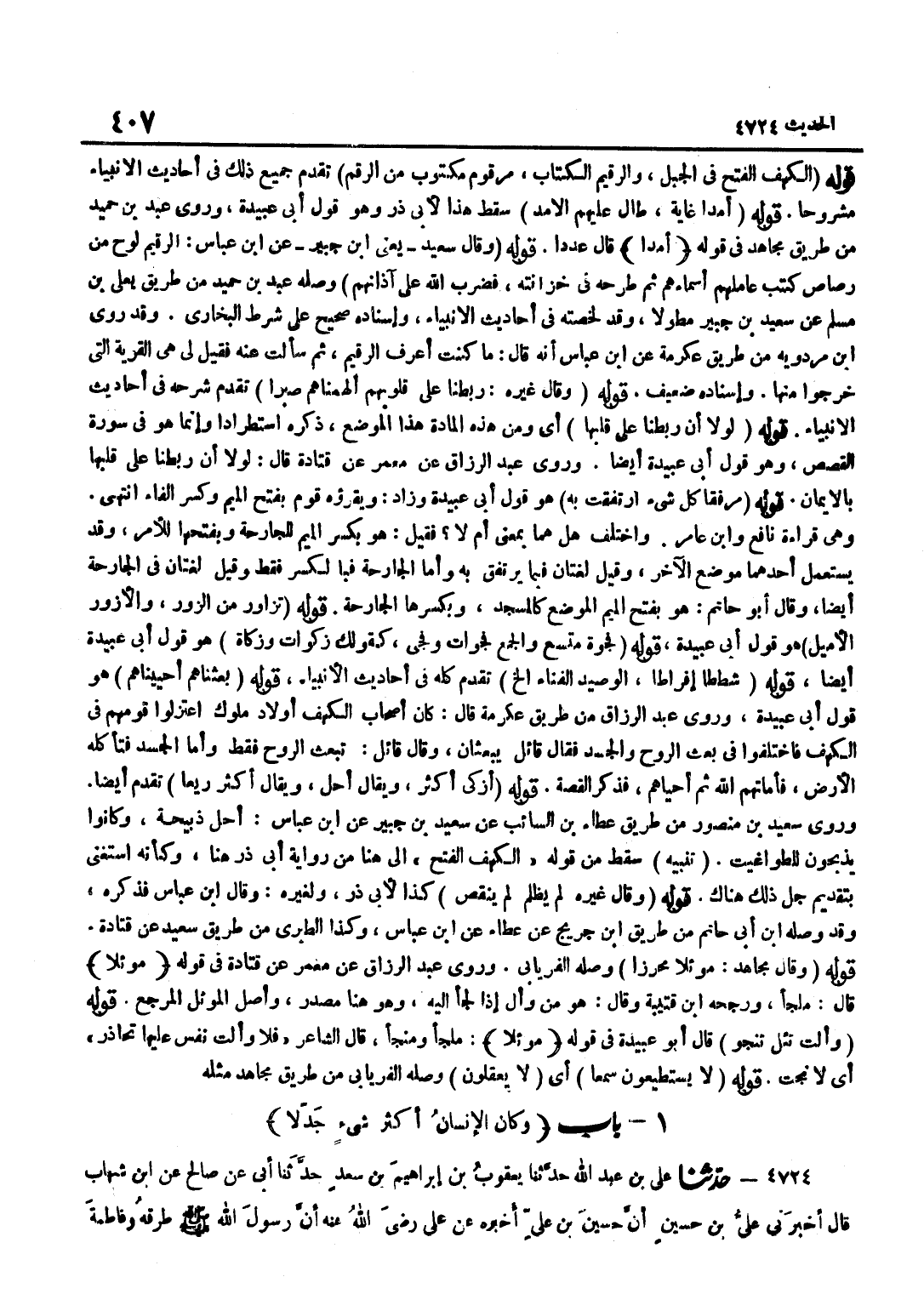قَوْلُهُ الْكَهْفُ الْفَتْحُ فِي الْجَبَلِ وَالرَّقِيمُ الْكِتَابُ مَرْقُومٌ مَكْتُوبٌ مِنَ الرَّقْمِ تَقَدَّمَ جَمِيعُ ذَلِكَ فِي أَحَادِيثِ الْأَنْبِيَاءِ مَشْرُوحًا قَوْلُهُ أَمَدًا غَايَةً طَالَ عَلَيْهِمُ الْأَمَدُ سَقَطَ هَذَا لِأَبِي ذَرٍّ وَهُوَ قَوْلُ أَبِي عُبَيْدَةَ وَرَوَى عَبْدُ بْنُ حُمَيْدٍ مِنْ طَرِيقِ مُجَاهِدٍ فِي قَوْلِهِ أَمَدًا قَالَ عددا قَوْله وَقَالَ سعيد يَعْنِي بن جُبَير عَن بن عَبَّاسٍ الرَّقِيمُ لَوْحٌ مِنْ رَصَاصٍ كَتَبَ عَامِلُهُمْ أَسْمَاءَهُمْ ثُمَّ طَرَحَهُ فِي خِزَانَتِهِ فَضَرَبَ اللَّهُ عَلَى آذَانِهِمْ وَصَلَهُ عَبْدُ بْنُ حُمَيْدٍ مِنْ طَرِيقِ يَعْلَى بْنِ مُسْلِمٍ عَنْ سَعِيدِ بْنِ جُبَيْرٍ مُطَوَّلًا وَقَدْ لَخَّصْتُهُ فِي أَحَادِيثِ الْأَنْبِيَاءِ وَإِسْنَادُهُ صَحِيحٌ عَلَى شَرْطِ الْبُخَارِيِّ وَقَدْ رَوَى بن مرْدَوَيْه من طَرِيق عِكْرِمَة عَن بن عَبَّاسٍ أَنَّهُ قَالَ مَا كُنْتُ أَعْرِفُ الرَّقِيمَ ثُمَّ سَأَلْتُ عَنْهُ فَقِيلَ لِي هِيَ الْقَرْيَةُ الَّتِي خَرَجُوا مِنْهَا وَإِسْنَادُهُ ضَعِيفٌ قَوْلُهُ وَقَالَ غَيره ربطنا على قُلُوبهم أَلْهَمْنَاهُمْ صَبْرًا تَقَدَّمَ شَرْحُهُ فِي أَحَادِيثِ الْأَنْبِيَاءِ قَوْله لَوْلَا أَن ربطنا على قَلبهَا أَيْ وَمِنْ هَذِهِ الْمَادَّةِ هَذَا الْمَوْضِعُ ذَكَرَهُ اسْتِطْرَادًا وَإِنَّمَا هُوَ فِي سُورَةِ الْقَصَصِ وَهُوَ قَوْلُ أَبِي عُبَيْدَةَ أَيْضًا وَرَوَى عَبْدُ الرَّزَّاقِ عَنْ مَعْمَرٍ عَنْ قَتَادَةَ قَالَ لَوْلَا أَنْ ربطنا على قَلبهَا بِالْإِيمَانِ قَوْلُهُ مِرْفَقًا كُلُّ شَيْءٍ ارْتَفَقْتُ بِهِ هُوَ قَول أبي عُبَيْدَة وَزَاد ويقرؤه قَوْمٌ بِفَتْحِ الْمِيمِ وَكَسْرِ الْفَاءِ انْتَهَى وَهِيَ قِرَاءَة نَافِع وبن عَامِرٍ وَاخْتُلِفَ هَلْ هُمَا بِمَعْنًى أَمْ لَا فَقِيلَ هُوَ بِكَسْرِ الْمِيمِ لِلْجَارِحَةِ وَبِفَتْحِهَا لِلْأَمْرِ وَقَدْ يُسْتَعْمَلُ أَحَدُهُمَا مَوْضِعَ الْآخَرِ وَقِيلَ لُغَتَانِ فِيمَا يُرْتَفَقُ بِهِ وَأَمَّا الْجَارِحَةُ فَبِالْكَسْرِ فَقَطْ وَقِيلَ لُغَتَانِ فِي الْجَارِحَةِ أَيْضًا وَقَالَ أَبُو حَاتِمٍ هُوَ بِفَتْحِ الْمِيمِ الْمَوْضِعُ كَالْمَسْجِدِ وَبِكَسْرِهَا الْجَارِحَةُ قَوْلُهُ تَزَّاوَرُ مِنَ الزُّورِ وَالْأَزْوَرُ الْأَمْيَلُ هُوَ قَوْلُ أَبِي عُبَيْدَةَ قَوْلُهُ فَجْوَةٌ مُتَّسِعٌ وَالْجَمْعُ فَجَوَاتٍ وَفِجًى كَقَوْلِكَ زَكَوَاتٌ وَزَكَاةٌ هُوَ قَوْلُ أَبِي عُبَيْدَةَ أَيْضًا قَوْلُهُ شَطَطًا إِفْرَاطًا الْوَصِيدُ الْفِنَاءُ إِلَخْ تَقَدَّمَ كُلُّهُ فِي أَحَادِيثِ الْأَنْبِيَاءِ قَوْلُهُ بَعَثْنَاهُمْ أَحْيَيْنَاهُمْ هُوَ قَوْلُ أَبِي عُبَيْدَةَ وَرَوَى عَبْدُ الرَّزَّاقِ مِنْ طَرِيقِ عِكْرِمَةَ قَالَ كَانَ أَصْحَابُ الْكَهْفِ أَوْلَادُ مُلُوكٍ اعْتَزَلُوا قَوْمَهُمْ فِي الْكَهْفِ فَاخْتَلَفُوا فِي بَعْثِ الرُّوحِ وَالْجَسَدِ فَقَالَ قَائِلٌ يُبْعَثَانِ وَقَالَ قَائِلٌ تُبْعَثُ الرُّوحُ فَقَطْ وَأَمَّا الْجَسَدُ فَتَأْكُلُهُ الْأَرْضُ فَأَمَاتَهُمُ اللَّهُ ثُمَّ أَحْيَاهُمْ فَذَكَرَ الْقِصَّةَ قَوْلُهُ أَزْكَى أَكْثَرُ وَيُقَالُ أَحَلُّ وَيُقَالُ أَكْثَرُ رِيعًا تَقَدَّمَ أَيْضًا وَرَوَى سَعِيدُ بْنُ مَنْصُورٍ مِنْ طَرِيقِ عَطَاءِ بْنِ السَّائِبِ عَنْ سَعِيدِ بْنِ جُبَيْرٍ عَن بن عَبَّاسٍ أَحَلُّ ذَبِيحَةٍ وَكَانُوا يَذْبَحُونَ لِلطَّوَاغِيتِ تَنْبِيهٌ سَقَطَ مِنْ قَوْلِهِ الْكَهْفُ الْفَتْحُ إِلَى هُنَا مِنْ رِوَايَةِ أَبِي ذَرٍّ هُنَا وَكَأَنَّهُ اسْتَغْنَى بِتَقْدِيمِ جُلِّ ذَلِكَ هُنَاكَ قَوْلُهُ وَقَالَ غَيْرُهُ لَمْ يَظْلِمْ لَمْ يَنْقُصْ كَذَا لِأَبِي ذَرٍّ وَلغيره وَقَالَ بن عَبَّاس فَذكره وَقد وَصله بن 