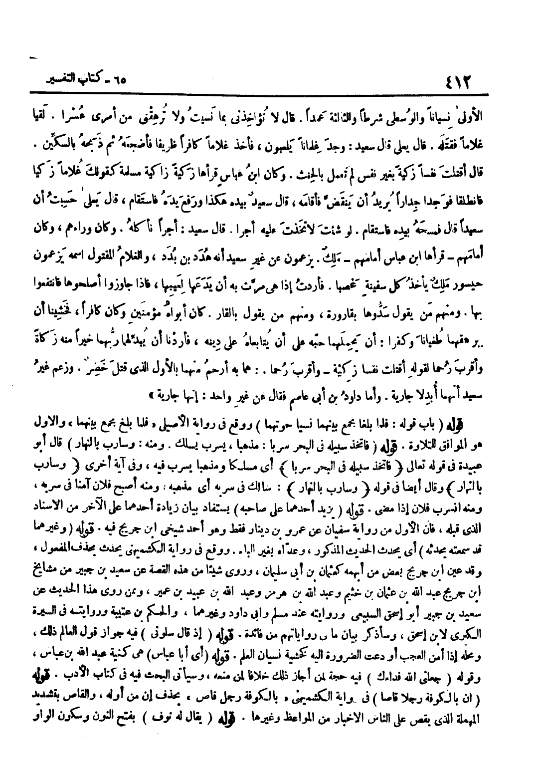 [4726] قَوْلُهُ يَزِيدُ أَحَدُهُمَا عَلَى صَاحِبِهِ يُسْتَفَادُ بَيَانُ زِيَادَةِ أَحَدِهِمَا عَلَى الْآخَرِ مِنَ الْإِسْنَادِ الَّذِي قَبْلَهُ فَإِنَّ الْأَوَّلَ مِنْ رِوَايَةِ سُفْيَانَ عَنْ عَمْرِو بْنِ دِينَارٍ فَقَطْ وَهُوَ أَحَدُ شَيْخي بن جُرَيْجٍ فِيهِ قَوْلُهُ وَغَيْرُهُمَا قَدْ سَمِعْتُهُ يُحَدِّثُهُ أَيْ يُحَدِّثُ الْحَدِيثَ الْمَذْكُورَ وَعَدَّاهُ بِغَيْرِ الْبَاءِ وَوَقَعَ فِي رِوَايَةِ الْكُشْمِيهَنِيِّ يُحَدِّثُ بِحَذْفِ الْمَفْعُولِ وَقد عين بن جُرَيْجٍ بَعْضَ مَنْ أَبْهَمَهُ كَعُثْمَانَ بْنِ أَبِي سُلَيْمَانَ وَرَوَى شَيْئًا مِنْ هَذِهِ الْقِصَّةِ عَنْ سعيد بن جُبَير من مَشَايِخ بن جُرَيْجٍ عَبْدُ اللَّهِ بْنُ عُثْمَانَ بْنِ خُثَيْمٍ وَعَبْدُ اللَّهِ بْنُ هُرْمُزَ وَعَبْدُ اللَّهِ بْنُ عُبَيْدِ بْنِ عُمَيْرٍ وَمِمَّنْ رَوَى هَذَا الْحَدِيثَ عَنْ سَعِيدِ بْنِ جُبَيْرٍ أَبُو إِسْحَاقَ السَّبِيعِيُّ وَرِوَايَتُهُ عِنْدَ مُسْلِمٍ وَأَبِي دَاوُدَ وَغَيْرِهِمَا وَالْحَكَمُ بْنُ عُتَيْبَةَ وَرِوَايَتُهُ فِي السِّيرَةِ الْكُبْرَى لِابْنِ إِسْحَاقَ وَسَأَذْكُرُ بَيَانَ مَا فِي رِوَايَاتِهِمْ مِنْ فَائِدَةٍ قَوْلُهُ إِذْ قَالَ سَلُونِي فِيهِ جَوَازُ قَوْلِ الْعَالِمِ ذَلِكَ وَمَحَلُّهُ إِذَا أُمِنَ الْعُجْبُ أَوْ دَعَتِ الضَّرُورَةُ إِلَيْهِ كَخَشْيَةِ نِسْيَانِ الْعِلْمِ قَوْلُهُ أَيْ أَبَا عَبَّاسٍ هِيَ كُنْيَةُ عَبْدِ اللَّهِ بْنِ عَبَّاسٍ وَقَوْلُهُ جَعَلَنِي اللَّهُ فِدَاءَكَ فِيهِ حُجَّةٌ لِمَنْ أَجَازَ ذَلِكَ خِلَافًا لِمَنْ مَنَعَهُ وَسَيَأْتِي الْبَحْثُ فِيهِ فِي كِتَابِ الْأَدَبِ قَوْلُهُ إِنَّ بِالْكُوفَةِ رَجُلًا قَاصًّا فِي رِوَايَةِ الْكُشْمِيهَنِيِّ بِالْكُوفَةِ رَجُلٌ قَاصٌّ بِحَذْفِ إِنَّ مِنْ أَوَّلِهِ وَالْقَاصُّ بِتَشْدِيدِ الْمُهْمَلَةِ الَّذِي يَقُصُّ عَلَى النَّاسِ الْأَخْبَارَ مِنَ الْمَوَاعِظِ وَغَيْرِهَا قَوْلُهُ يُقَالُ لَهُ نَوْفٌ بِفَتْحِ النُّونِ وَسُكُونِ الْوَاوِ