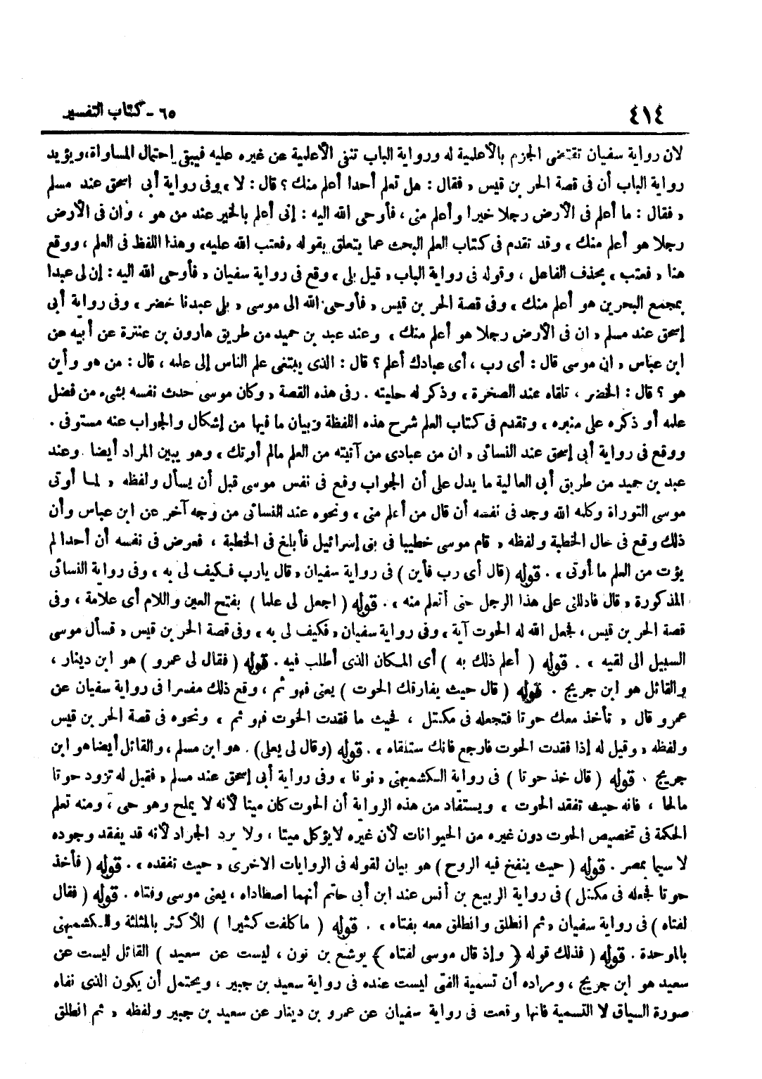 لِأَنَّ رِوَايَةَ سُفْيَانَ تَقْتَضِي الْجَزْمَ بِالْأَعْلَمِيَّةِ لَهُ وَرِوَايَةَ الْبَابِ تَنْفِي الْأَعْلَمِيَّةَ عَنْ غَيْرِهِ عَلَيْهِ فَيَبْقَى احْتِمَالُ الْمُسَاوَاةِ وَيُؤَيِّدُ رِوَايَةَ الْبَابِ أَنَّ فِي قِصَّةِ الْحُرِّ بْنِ قَيْسٍ فَقَالَ هَلْ تَعْلَمُ أَحَدًا أَعْلَمَ مِنْكَ قَالَ لَا وَفِي رِوَايَةِ أَبِي إِسْحَاقَ عِنْدَ مُسْلِمٍ فَقَالَ مَا أَعْلَمُ فِي الْأَرْضِ رَجُلًا خَيْرًا وَأَعْلَمَ مِنِّي فَأَوْحَى اللَّهُ إِلَيْهِ إِنِّي أَعْلَمُ بِالْخَيْرِ عِنْدَ مَنْ هُوَ وَإِنَّ فِي الْأَرْضِ رَجُلًا هُوَ أَعْلَمُ مِنْكَ وَقَدْ تَقَدَّمَ فِي كِتَابِ الْعِلْمِ الْبَحْثُ عَمَّا يَتَعَلَّقُ بِقَوْلِهِ فَعَتَبَ اللَّهُ عَلَيْهِ وَهَذَا اللَّفْظُ فِي الْعِلْمِ وَوَقَعَ هُنَا فَعُتِبَ بِحَذْفِ الْفَاعِلِ وَقَوْلُهُ فِي رِوَايَةِ الْبَابِ قِيلَ بَلَى وَقَعَ فِي رِوَايَةِ سُفْيَانَ فَأَوْحَى اللَّهُ إِلَيْهِ إِنَّ لِي عَبْدًا بِمَجْمَعِ الْبَحْرَيْنِ هُوَ أَعْلَمُ مِنْكَ وَفِي قِصَّةِ الْحُرِّ بْنِ قَيْسٍ فَأَوْحَى اللَّهُ إِلَى مُوسَى بَلَى عَبْدُنَا خَضِرٌ وَفِي رِوَايَةِ أَبِي إِسْحَاقَ عِنْدَ مُسْلِمٍ أَنَّ فِي الْأَرْضِ رَجُلًا هُوَ أَعْلَمُ مِنْكَ وَعِنْدَ عَبْدِ بْنِ حُمَيْدٍ مِنْ طَرِيقِ هَارُونَ بْنِ عنترة عَن أَبِيه عَن بن عَبَّاسٍ أَنَّ مُوسَى قَالَ أَيْ رَبِّ أَيُّ عِبَادِكَ أَعْلَمُ قَالَ الَّذِي يَبْتَغِي عِلْمَ النَّاسِ إِلَى عِلْمِهِ قَالَ مَنْ هُوَ وَأَيْنَ هُوَ قَالَ الْخَضِرُ تَلْقَاهُ عِنْدَ الصَّخْرَةِ وَذَكَرَ لَهُ حِلْيَتَهُ وَفِي هَذِهِ الْقِصَّةِ وَكَانَ مُوسَى حَدَّثَ نَفْسَهُ بِشَيْءٍ مِنْ فَضْلِ عِلْمِهِ أَوْ ذَكَرَهُ عَلَى مِنْبَرِهِ وَتَقَدَّمَ فِي كِتَابِ الْعِلْمِ شَرْحُ هَذِهِ اللَّفْظَةِ وَبَيَانُ مَا فِيهَا مِنْ إِشْكَالٍ وَالْجَوَابُ عَنْهُ مُسْتَوْفًى وَوَقَعَ فِي رِوَايَةِ أَبِي إِسْحَاقَ عِنْدَ النَّسَائِيِّ إِنَّ مِنْ عِبَادِي مَنْ آتَيْتُهُ مِنَ الْعِلْمِ مَا لَمْ أُوتِكَ وَهُوَ يُبَيِّنُ الْمُرَادَ أَيْضًا وَعِنْدَ عَبْدِ بْنِ حُمَيْدٍ مِنْ طَرِيقِ أَبِي الْعَالِيَةِ مَا يَدُلُّ عَلَى أَنَّ الْجَوَابَ وَقَعَ فِي نَفْسِ مُوسَى قَبْلَ أَنْ يَسْأَلَ وَلَفْظُهُ لَمَّا أُوتِيَ مُوسَى التَّوْرَاةَ وَكَلَّمَهُ اللَّهُ وَجَدَ فِي نَفْسِهِ أَنْ قَالَ مَنْ أَعْلَمُ مِنِّي وَنَحْوَهُ عِنْدَ النَّسَائِيِّ مِنْ وَجه آخر عَن بن عَبَّاسٍ وَأَنَّ ذَلِكَ وَقَعَ فِي حَالِ الْخُطْبَةِ وَلَفْظُهُ قَامَ مُوسَى خَطِيبًا فِي بَنِي إِسْرَائِيلَ فَأَبْلَغَ فِي الْخُطْبَةِ فَعَرَضَ فِي نَفْسِهِ أَنَّ أَحَدًا لَمْ يُؤْتَ مِنَ الْعِلْمِ مَا أُوتِيَ قَوْلُهُ قَالَ أَيْ رَبِّ فَأَيْنَ فِي رِوَايَةِ سُفْيَانَ قَالَ يَا رَبُّ فَكَيْفَ لِي بِهِ وَفِي رِوَايَةِ النَّسَائِيِّ الْمَذْكُورَةِ قَالَ فَادْلُلْنِي عَلَى هَذَا الرَّجُلِ حَتَّى أَتَعَلَّمَ مِنْهُ قَوْلُهُ اجْعَلْ لِي عَلَمًا بِفَتْحِ الْعَيْنِ وَاللَّامِ أَيْ عَلَامَةً وَفِي قِصَّةِ الْحُرِّ بْنِ قَيْسٍ فَجَعَلَ اللَّهُ لَهُ الْحُوتَ آيَةً وَفِي رِوَايَةِ سُفْيَانَ فَكَيْفَ لِي بِهِ وَفِي قِصَّةِ الْحُرِّ بْنِ قَيْسٍ فَسَأَلَ مُوسَى السَّبِيلَ إِلَى لُقِيِّهِ قَوْلُهُ أَعْلَمُ ذَلِكَ بِهِ أَيِ الْمَكَانُ الَّذِي أَطْلُبُ فِيهِ قَوْله فَقَالَ لي عَمْرو هُوَ بن دِينَار وَالْقَائِل هُوَ بن جُرَيْجٍ قَوْلُهُ قَالَ حَيْثُ يُفَارِقُكَ الْحُوتُ يَعْنِي فَهُوَ ثَمَّ وَقَعَ ذَلِكَ مُفَسَّرًا فِي رِوَايَةِ سُفْيَانَ عَنْ عَمْرٍو قَالَ تَأْخُذُ مَعَكَ حُوتًا فَتَجْعَلُهُ فِي مِكْتَلٍ فَحَيْثُ مَا فَقَدْتَ الْحُوتَ فَهُوَ ثَمَّ وَنَحْوَهُ فِي قِصَّةِ الْحُرِّ بْنِ قَيْسٍ وَلَفْظُهُ وَقِ