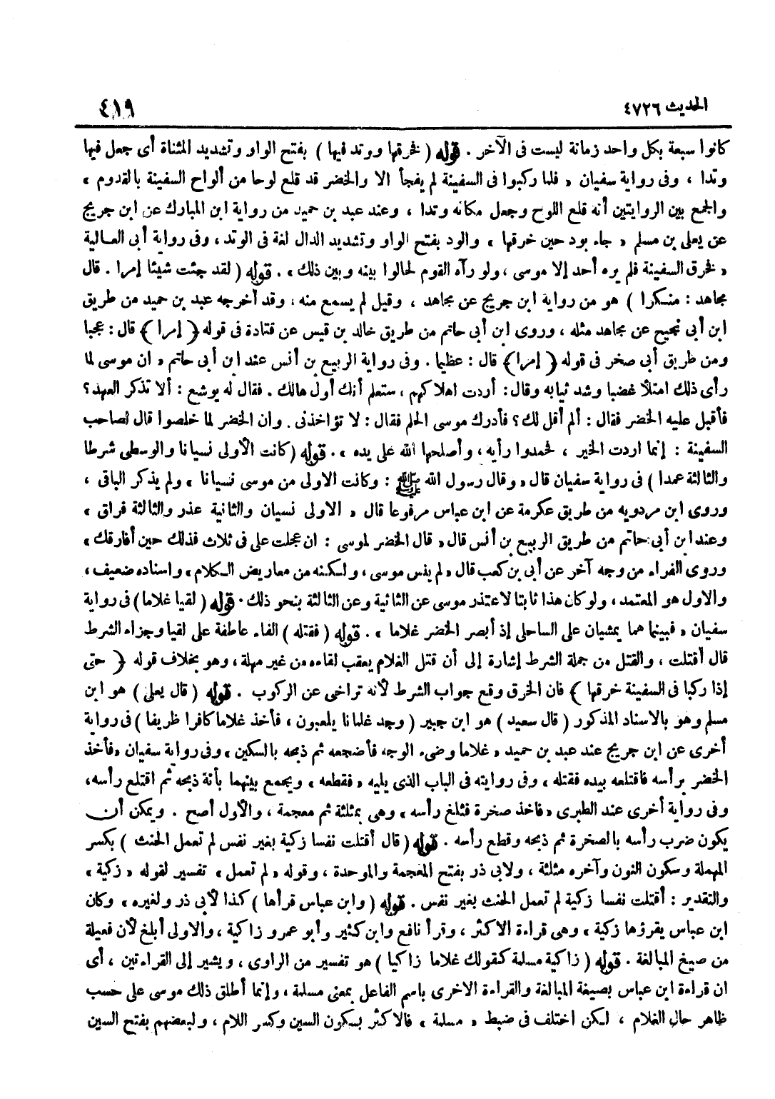 كَانُوا سَبْعَةً بِكُلِّ وَاحِدٍ زَمَانَةٌ لَيْسَتْ فِي الْآخَرِ قَوْلُهُ فَخَرَقَهَا وَوَتَّدَ فِيهَا بِفَتْحِ الْوَاوِ وَتَشْدِيدِ الْمُثَنَّاةِ أَيْ جَعَلَ فِيهَا وَتَدًا وَفِي رِوَايَةِ سُفْيَانَ فَلَمَّا رَكِبُوا فِي السَّفِينَةِ لَمْ يُفْجَأْ إِلَّا وَالْخَضِرُ قَدْ قَلَعَ لَوْحًا مِنْ أَلْوَاحِ السَّفِينَةِ بِالْقُدُومِ وَالْجَمْعُ بَيْنَ الرِّوَايَتَيْنِ أَنَّهُ قَلَعَ اللَّوْحَ وَجَعَلَ مَكَانَهُ وَتَدًا وَعِنْدَ عَبْدِ بن حميد من رِوَايَة بن الْمُبَارك عَن بن جُرَيْجٍ عَنْ يَعْلَى بْنِ مُسْلِمٍ جَاءَ بِوَدٍّ حِينَ خَرَقَهَا وَالْوَدُّ بِفَتْحِ الْوَاوِ وَتَشْدِيدِ الدَّالِ لُغَةٌ فِي الْوَتَدِ وَفِي رِوَايَةِ أَبِي الْعَالِيَةِ فَخَرَقَ السَّفِينَةَ فَلَمْ يَرَهُ أَحَدٌ إِلَّا مُوسَى وَلَوْ رَآهُ الْقَوْمُ لَحَالُوا بَيْنَهُ وَبَيْنَ ذَلِكَ قَوْله لقد جِئْت شَيْئا أمرا قَالَ مُجَاهِد مُنْكرا هُوَ من رِوَايَة بن جُرَيْجٍ عَنْ مُجَاهِدٍ وَقِيلَ لَمْ يَسْمَعْ مِنْهُ وَقَدْ أَخْرَجَهُ عَبْدُ بْنُ حُمَيْدٍ مِنْ طَرِيقِ بن أبي نجيح عَن مُجَاهِد مثله وروى بن أَبِي حَاتِمٍ مِنْ طَرِيقِ خَالِدِ بْنِ قَيْسٍ عَنْ قَتَادَةَ فِي قَوْلِهِ إِمْرًا قَالَ عَجَبًا وَمِنْ طَرِيقِ أَبِي صَخْرٍ فِي قَوْلِهِ إِمْرًا قَالَ عَظِيمًا وَفِي رِوَايَةِ الرَّبِيعِ بْنِ أَنَسٍ عِنْد بن أَبِي حَاتِمٍ أَنَّ مُوسَى لَمَّا رَأَى ذَلِكَ امْتَلَأَ غَضَبًا وَشَدَّ ثِيَابَهُ وَقَالَ أَرَدْتَ إِهْلَاكَهُمْ سَتَعْلَمُ أَنَّكَ أَوَّلُ هَالِكٍ فَقَالَ لَهُ يُوشَعُ أَلَا تَذْكُرُ الْعَهْدَ فَأَقْبَلَ عَلَيْهِ الْخَضِرُ فَقَالَ أَلَمْ أَقُلْ لَكَ فَأَدْرَكَ مُوسَى الْحِلْمُ فَقَالَ لَا تُؤَاخِذْنِي وَإِنَّ الْخَضِرَ لَمَّا خَلَصُوا قَالَ لِصَاحِبِ السَّفِينَةِ إِنَّمَا أَرَدْتُ الْخَيْرَ فَحَمِدُوا رَأْيَهُ وَأَصْلَحَهَا اللَّهُ عَلَى يَدِهِ قَوْلُهُ كَانَتِ الْأُولَى نِسْيَانًا وَالْوُسْطَى شَرْطًا وَالثَّالِثَةُ عَمْدًا فِي رِوَايَةِ سُفْيَانَ قَالَ وَقَالَ رَسُولِ اللَّهِ صَلَّى اللَّهُ عَلَيْهِ وَسَلَّمَ وَكَانَتِ الْأُولَى مِنْ مُوسَى نِسْيَانًا وَلم يذكر الْبَاقِي وروى بن مرْدَوَيْه من طَرِيق عِكْرِمَة عَن بن عَبَّاسٍ مَرْفُوعًا قَالَ الْأُولَى نِسْيَانٌ وَالثَّانِيَةُ عُذْرٌ وَالثَّالِثَة فِرَاق وَعند بن أَبِي حَاتِمٍ مِنْ طَرِيقِ الرَّبِيعِ بْنِ أَنَسٍ قَالَ قَالَ الْخَضِرُ لِمُوسَى إِنْ عَجِلْتَ عَلَيَّ فِي ثَلَاثٍ فَذَلِكَ حِينَ أُفَارِقُكَ وَرَوَى الْفَرَّاءُ مِنْ وَجْهٍ آخَرَ عَنْ أُبَيِّ بْنِ كَعْبٍ قَالَ لَمْ يَنْسَ مُوسَى وَلَكِنَّهُ مِنْ مَعَارِيضِ الْكَلَامِ وَإِسْنَادُهُ ضَعِيفٌ وَالْأَوَّلُ هُوَ الْمُعْتَمَدُ وَلَوْ كَانَ هَذَا ثَابِتًا لَاعْتَذَرَ مُوسَى عَنِ الثَّانِيَةِ وَعَنِ الثَّالِثَةِ بِنَحْوِ ذَلِكَ قَوْلُهُ لَقِيَا غُلَامًا فِي رِوَايَةِ سُفْيَانَ فَبَيْنَمَا هُمَا يَمْشِيَانِ عَلَى الساحلي إِذْ أَبْصَرَ الْخَضِرُ غُلَامًا قَوْلُهُ فَقَتَلَهُ الْفَاءُ عَاطِفَةٌ عَلَى لَقِيَا وَجَزَاءُ الشَّرْطِ قَالَ أَقَتَلْتَ وَالْقَتْلُ مِنْ جُمْلَةِ الشَّرْطِ إِشَارَةً إِلَى أَنَّ قَتْلَ الْغُلَامِ يَعْقُبُ لِقَاءَهُ مِنْ غَيْرِ مُهْلَةٍ وَهُوَ بِخِلَافِ قَوْلِهِ حَتَّى إِذَا رَكِبَا فِي السَّفِينَة خرقها فَإِنَّ الْخَرْقَ وَقَعَ جَوَابَ الشَّرْطِ لِأَنَّهُ تَرَاخَى عَن الرّكُوب قَوْله قَالَ يعلى هُوَ بن مُسْلِمٍ وَهُوَ بِالْإِسْنَادِ الْمَذْكُورِ قَالَ سَعِيدٌ هُوَ بن جُبَيْرٍ وَجَدَ غِلْمَانًا يَلْعَبُونَ فَأَخَذَ غُلَامًا كَافِرًا ظريفا فِي رِوَايَة أُخْرَى عَن بن جُرَيْجٍ عِنْدَ عَبْدِ بْنِ حُمَيْدٍ غُلَامًا وَضِيءَ الْوَجْهِ فَأَضْجَعَهُ ثُمَّ ذَبَحَهُ بِا