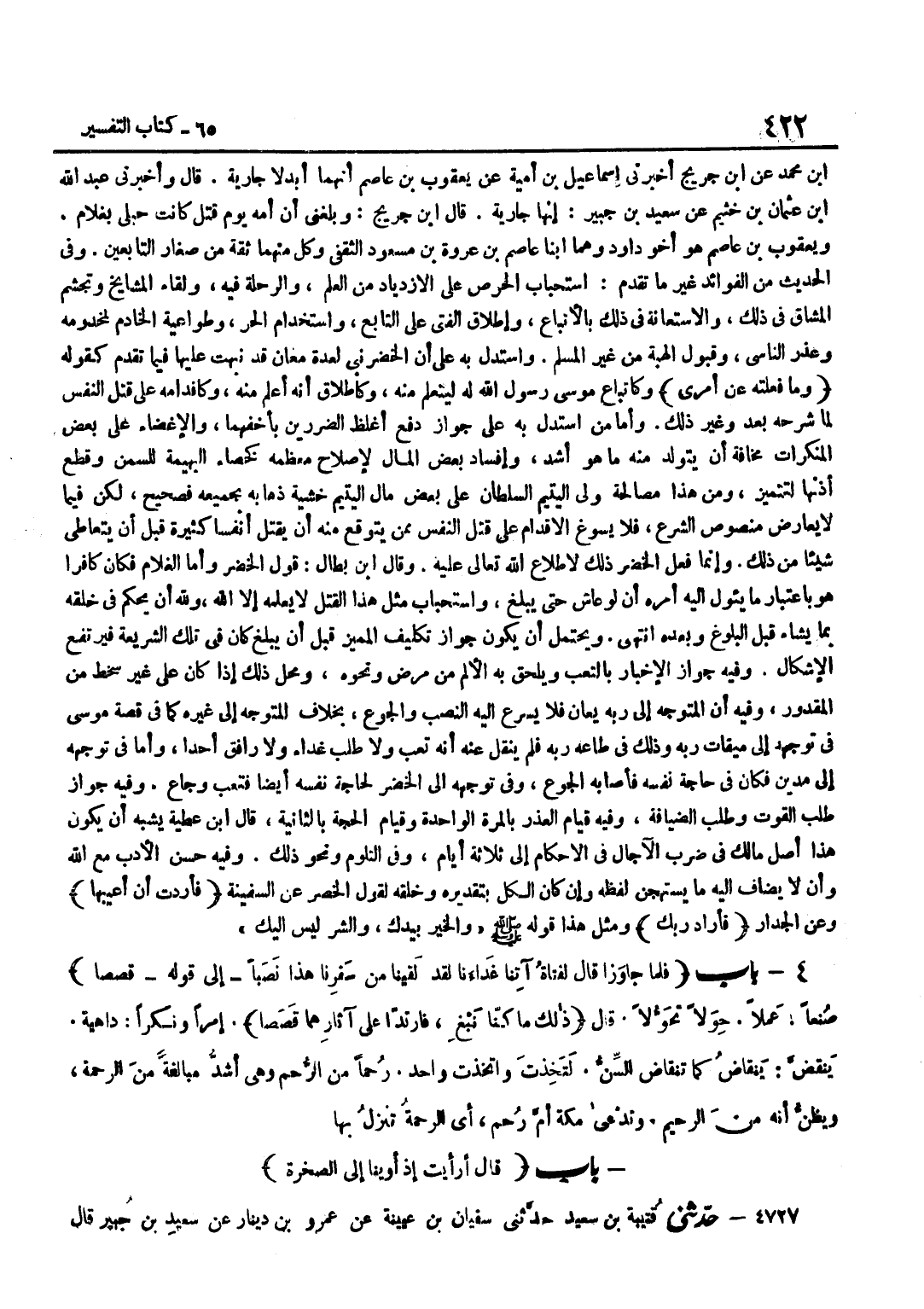 بن مُحَمَّد عَن بن جريج فِي قَوْله خيرا مِنْهُ زَكَاة قَالَ إِسْلَامًا وَمِنْ طَرِيقِ عَطِيَّةَ الْعَوْفِيِّ قَالَ دِينًا قَوْلُهُ وَأَقْرَبَ رُحْمًا هُمَا بِهِ أَرْحَمُ مِنْهُمَا بِالْأولِ الَّذِي قتل خضر وروى بن الْمُنْذِرِ مِنْ طَرِيقِ إِدْرِيسَ الْأَوْدِيِّ عَنْ عَطِيَّةَ نَحْوَهُ وَعَنِ الْأَصْمَعِيِّ قَالَ الرَّحِمُ بِكَسْرِ الْحَاءِ الْقَرَابَةُ وَبِسُكُونِهَا فَرْجُ الْأُنْثَى وَبِضَمِّ الرَّاءِ ثُمَّ السُّكُونِ الرَّحْمَةُ وَعَنْ أَبِي عُبَيْدِ الْقَاسِمِ بْنِ سَلَّامٍ الرُّحْمُ وَالرَّحْمُ يَعْنِي بِالضَّمِّ وَالْفَتْحِ مَعَ السُّكُونِ فِيهِمَا بِمَعْنًى وَهُوَ مِثْلُ الْعُمْرِ وَالْعَمْرِ وَسَيَأْتِي قَوْلُهُ رُحْمًا فِي الْبَابِ الَّذِي بَعْدَهُ أَيْضًا قَوْلُهُ وَزَعَمَ غَيْرُ سَعِيدِ أَنَّهُمَا أُبْدِلَا جَارِيَة هُوَ قَول بن جريج وروى بن مرْدَوَيْه من وَجه آخر عَن بن جُرَيْجٍ قَالَ وَقَالَ يَعْلَى بْنُ مُسْلِمٍ أَيْضًا عَنْ سَعِيدِ بْنِ جُبَيْرٍ إِنَّهَا جَارِيَةٌ وَفِي رِوَايَةِ الْإِسْمَاعِيلِيِّ مِنْ هَذَا الْوَجْهِ قَالَ وَيُقَالُ أَيْضًا عَنْ سَعِيدِ بْنِ جُبَيْرٍ إِنَّهَا جَارِيَةٌ وَلِلنَّسَائِيِّ مِنْ طَرِيقِ أَبِي إِسْحَاقَ عَنْ سَعِيدِ بْنِ جُبَيْرٍ عَنِ بن عَبَّاسٍ فَأَبْدَلَهُمَا رَبُّهُمَا خَيْرًا مِنْهُ زَكَاةً قَالَ أَبْدَلَهُمَا جَارِيَةً فَوَلَدَتْ نَبِيًّا مِنَ الْأَنْبِيَاءِ وَلِلطَّبَرَيِّ مِنْ طَرِيقِ عَمْرِو بْنِ قَيْسٍ نَحْوَهُ وَلِابْنِ الْمُنْذر من طَرِيق بسطَام بن حميل قَالَ أَبْدَلَهُمَا مَكَانَ الْغُلَامِ جَارِيَةً وَلَدَتْ نَبِيَّيْنِ وَلِعَبْدِ بْنِ حُمَيْدٍ مِنْ طَرِيقِ الْحَكَمِ بْنِ أَبَانٍ عَنْ عِكْرِمَةَ وَلَدَتْ جَارِيَةً وَلِابْنِ أَبِي حَاتِمٍ مِنْ طَرِيقِ السُّدِّيِّ قَالَ وَلَدَتْ جَارِيَةً فَوَلَدَتْ نَبِيًّا وَهُوَ الَّذِي كَانَ بَعْدُ مُوسَى فَقَالُوا لَهُ ابْعَثْ لَنَا مَلِكًا نُقَاتِلْ فِي سَبِيل الله وَاسْمُ هَذَا النَّبِيِّ شَمْعُونُ وَاسْمُ أُمِّهِ حِنَةُ وَعند بن مَرْدَوَيْهِ مِنْ حَدِيثِ أُبَيِّ بْنِ كَعْبٍ أَنَّهَا ولدت غُلَاما لَكِن إِسْنَاده ضَعِيف وَأخرجه بن الْمُنْذر بِإِسْنَاد حسن عَن عِكْرِمَة عَن بن عَبَّاس نَحوه وَفِي تَفْسِير بن الْكَلْبِيِّ وَلَدَتْ جَارِيَةً وَلَدَتْ عِدَّةَ أَنْبِيَاءَ فَهَدَى اللَّهُ بِهِمْ أُمَمًا وَقِيلَ عِدَّةُ مَنْ جَاءَ مِنْ وَلَدِهَا مِنَ الْأَنْبِيَاءِ سَبْعُونَ نَبِيًّا قَوْلُهُ وَأَمَّا دَاوُدُ بْنُ أَبِي عَاصِمٍ فَقَالَ عَنْ غير وَاحِد إِنَّهَا جَارِيَة هُوَ قَول بن جُرَيْجٍ أَيْضًا وَرَوَى الطَّبَرِيُّ مِنْ طَرِيقِ حَجَّاجِ بن مُحَمَّد عَن بن جُرَيْجٍ أَخْبَرَنِي إِسْمَاعِيلُ بْنُ أُمَيَّةَ عَنْ يَعْقُوبَ بْنِ عَاصِمٍ أَنَّهُمَا أُبْدِلَا جَارِيَةً قَالَ وَأَخْبَرَنِي عَبْدِ اللَّهِ بْنِ عُثْمَانَ بْنِ خُثَيْمٍ عَنْ سعيد بن جُبَير إِنَّهَا جَارِيَة قَالَ بن جُرَيْجٍ وَبَلَغَنِي أَنَّ أُمَّهُ يَوْمَ قُتِلَ كَانَتْ حُبْلَى بِغُلَامٍ وَيَعْقُوبُ بْنُ عَاصِمٍ هُوَ أَخُو دَاوُدَ وَهُمَا ابْنَا عَاصِمِ بْنِ عُرْوَةَ بْنِ مَسْعُودٍ الثَّقَفِيِّ وَكُلٌّ مِنْهُمَا ثِقَةٌ مِنْ صِغَارِ التَّابِعِينَ وَفِي الْحَدِيثِ مِنَ الْفَوَائِدِ غَيْرِ مَا تَقَدَّمَ اسْتِحْبَابُ الْحِرْصِ عَلَى الِازْدِيَادِ مِنَ الْعِلْمِ وَالرِّحْلَةِ فِيهِ وَلِقَاءِ الْمَشَايِخِ وَتَجَشُّمِ الْمَشَاقِّ فِي ذَلِكَ وَالِاسْتِعَانَةِ فِي ذَلِكَ بِالْأَتْبَاعِ وَإِطْلَاقِ الْفَتَى عَلَى التَّابِعِ وَاسْتِخْدَامِ الْحُرِّ وَطَوَاعِيَةِ الْخَادِمِ لِمَخْدُومِهِ وَعُذْرِ النَّاسِي وَقَبُولِ الْهِبَةِ مِنْ غَيْرِ الْمُسْلِمِ وَاسْتُدِلَّ بِهِ عَلَى أَنَّ الْخَضِرَ نَبِيٌّ لِعِدَ