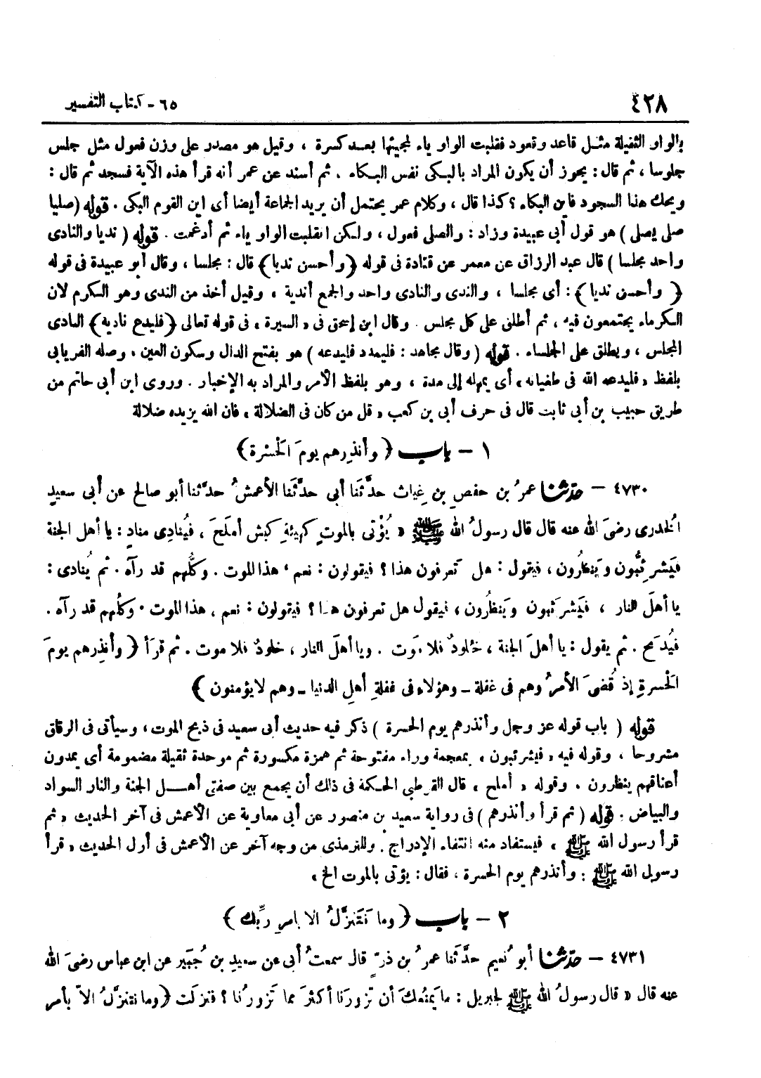 ذَكَرَ فِيهِ حَدِيثَ أَبِي سَعِيدٍ فِي ذَبْحِ الْمَوْتِ وَسَيَأْتِي فِي الرِّقَاقِ مَشْرُوحًا وَقَوْلُهُ فِيهِ فَيَشْرَئِبُّونَ بِمُعْجَمَةٍ وَرَاءَ مَفْتُوحَةٍ ثُمَّ هَمْزَةٍ مَكْسُورَةٍ ثُمَّ مُوَحَّدَةٍ ثَقِيلَةٍ مَضْمُومَةٍ أَيْ يَمُدُّونَ أَعْنَاقَهُمْ يَنْظُرُونَ وَقَوْلُهُ أَمْلَحُ قَالَ الْقُرْطُبِيُّ الْحِكْمَةُ فِي ذَلِكَ أَنْ يُجْمَعَ بَيْنَ صِفَتَيْ أَهْلِ الْجَنَّةِ وَالنَّارِ السَّوَادُ وَالْبَيَاضُ قَوْلُهُ ثُمَّ قَرَأَ وَأَنْذِرْهُمْ فِي رِوَايَةِ سَعِيدُ بْنُ مَنْصُورٍ عَنْ أَبِي مُعَاوِيَةَ عَنْ الْأَعْمَشِ فِي آخِرِ الْحَدِيثِ ثُمَّ قَرَأَ رَسُولُ اللَّهِ صَلَّى اللَّهُ عَلَيْهِ وَسَلَّمَ فَيُسْتَفَادُ مِنْهُ انْتِفَاءُ الْإِدْرَاجِ وَلِلتِّرْمِذِيِّ مِنْ وَجْهٍ آخَرَ عَنِ الْأَعْمَشِ فِي أَوَّلِ الْحَدِيثِ قَرَأَ رَسُولُ اللَّهِ صَلَّى اللَّهُ عَلَيْهِ وَسَلَّمَ وَأَنْذِرْهُمْ يَوْم الْحَسْرَة فَقَالَ يُؤْتى بِالْمَوْتِ الخ